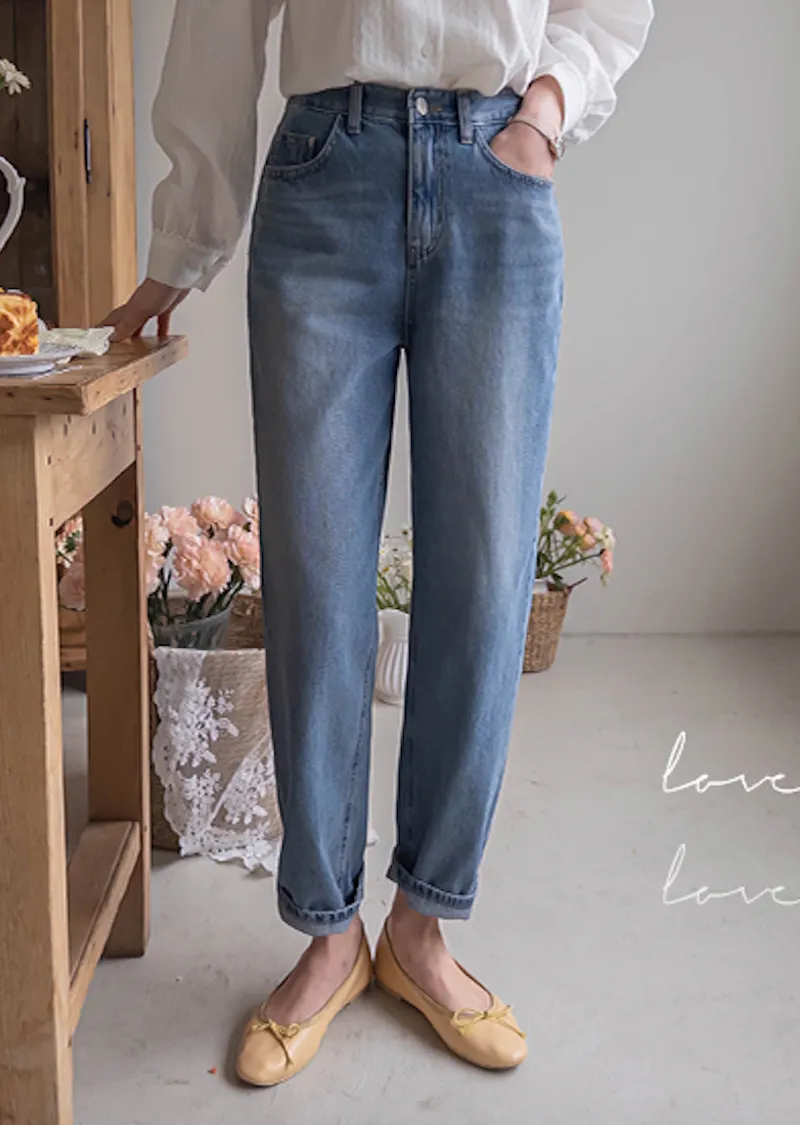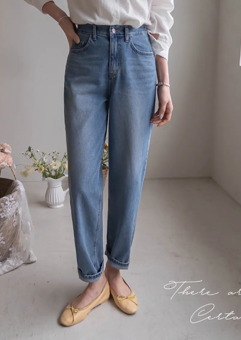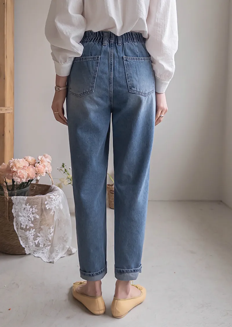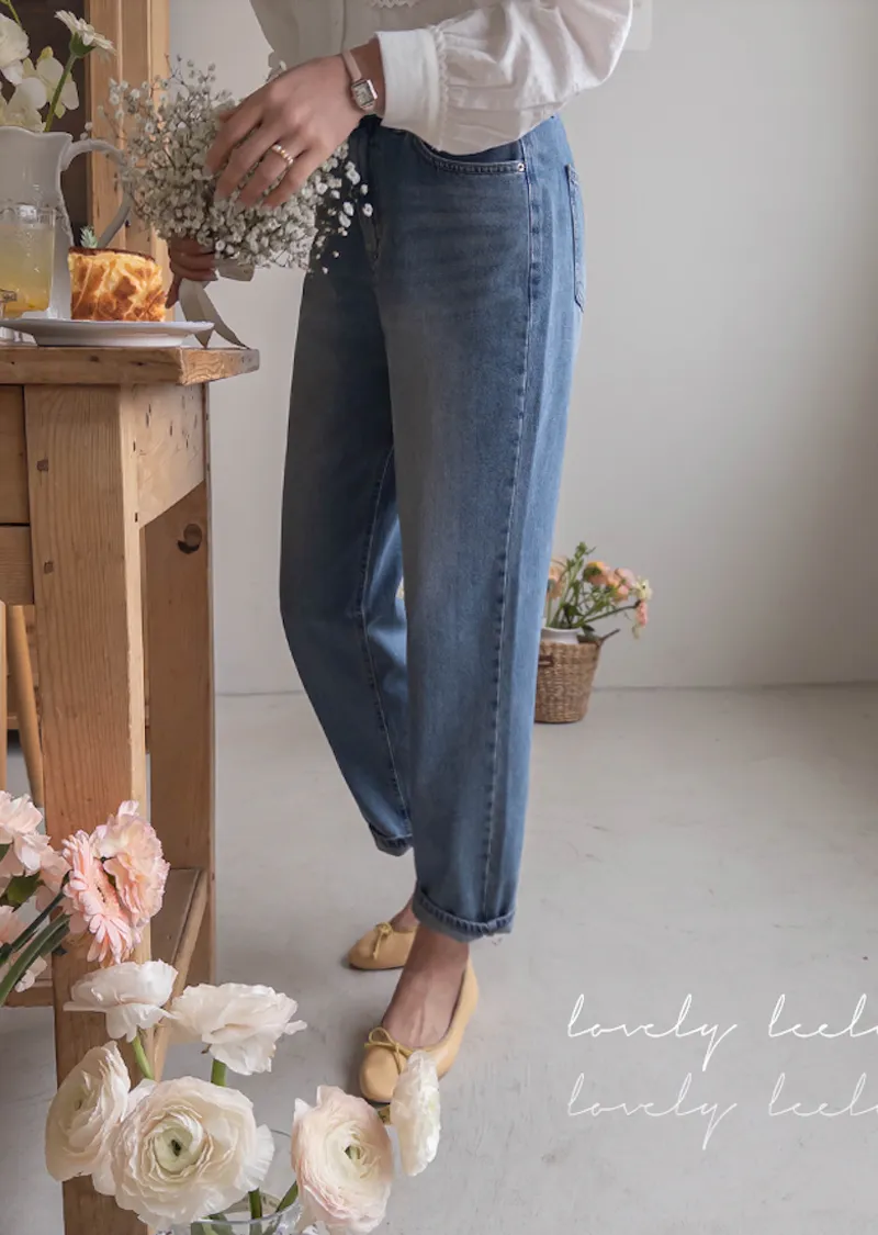 [活潑寬鬆的牛仔褲,清新長度♥] [下擺捲起來看起來更可愛〜] [後腰帶細節] [可與各種鞋子搭配]
