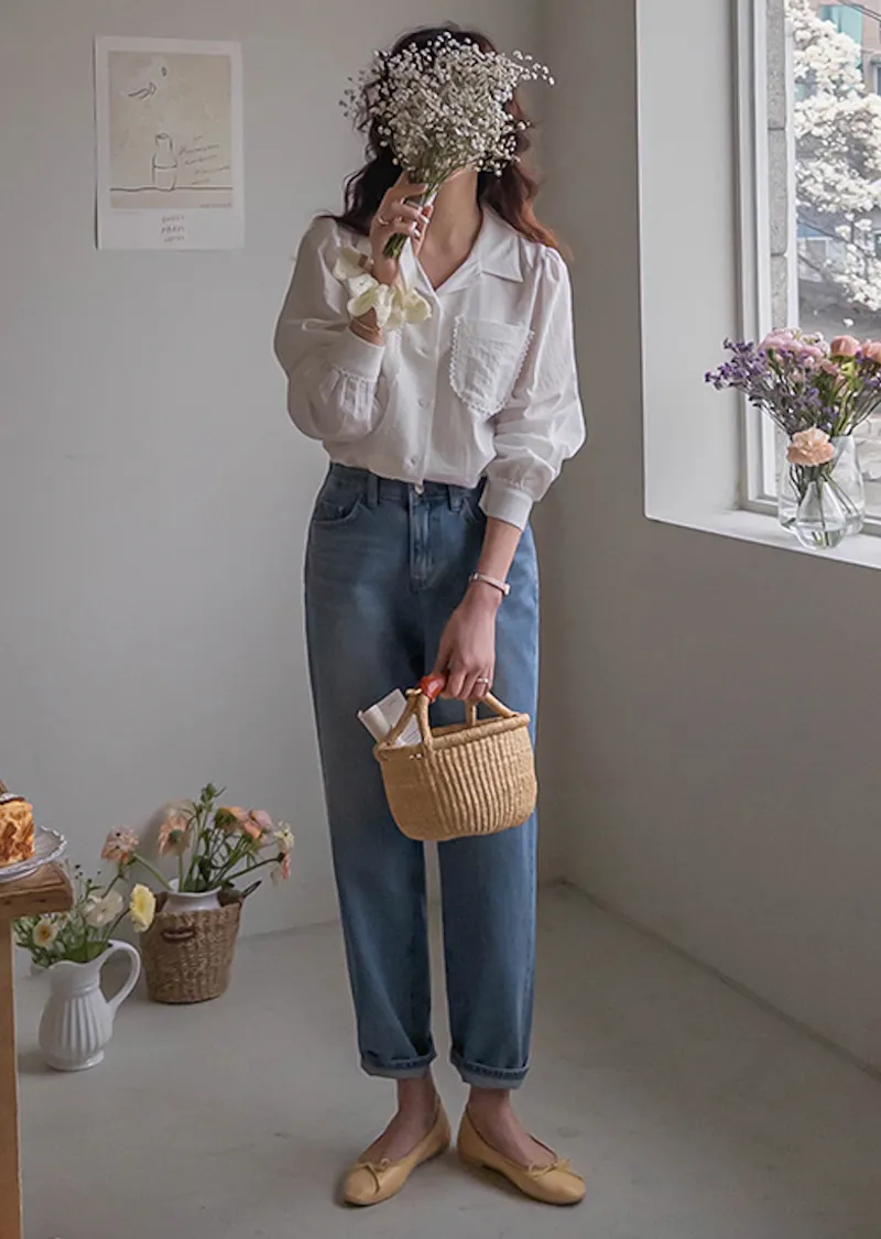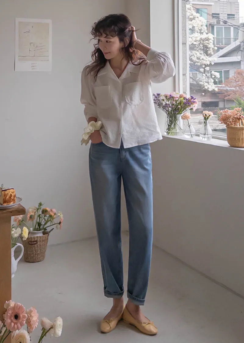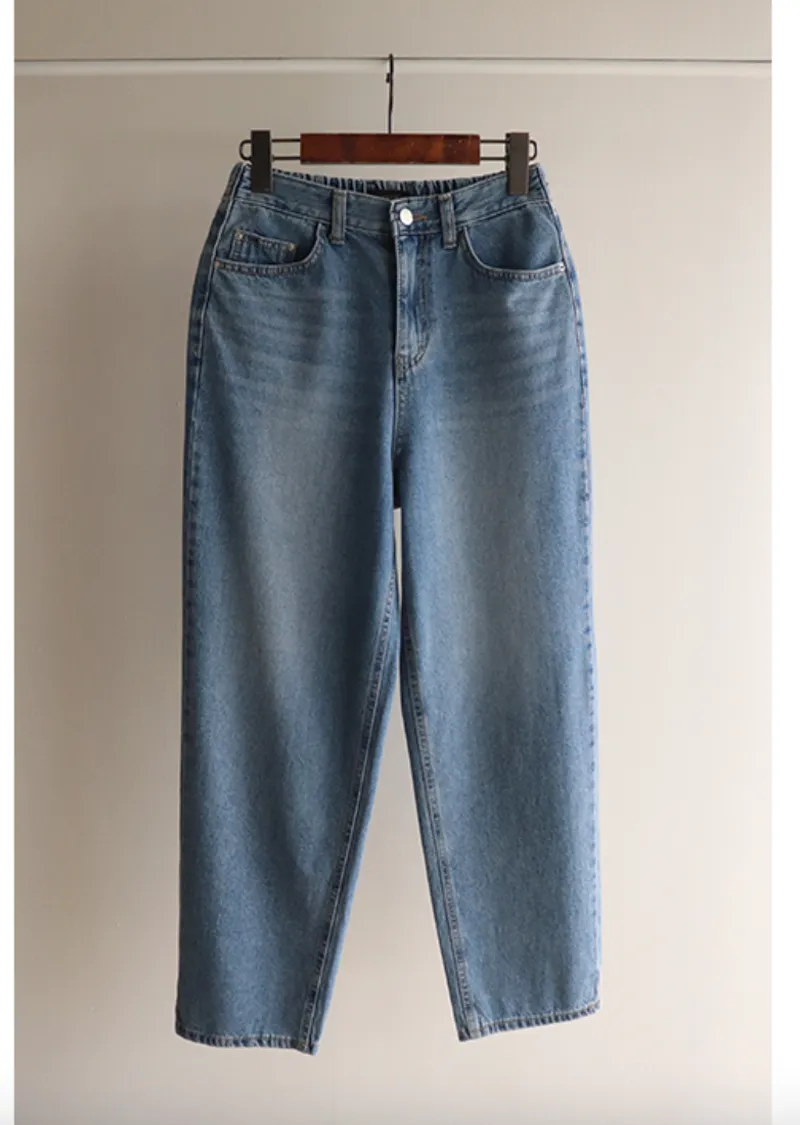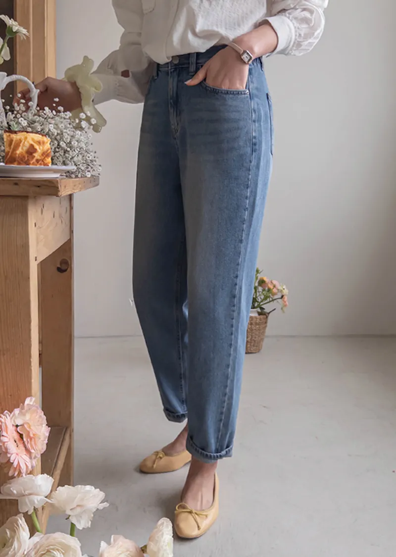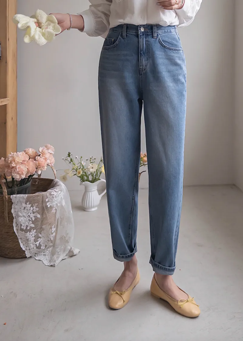 [活潑寬鬆的牛仔褲,清新長度♥] [下擺捲起來看起來更可愛〜] [後腰帶細節] [可與各種鞋子搭配]
