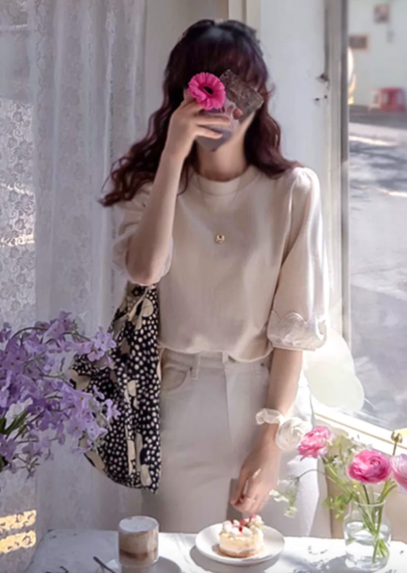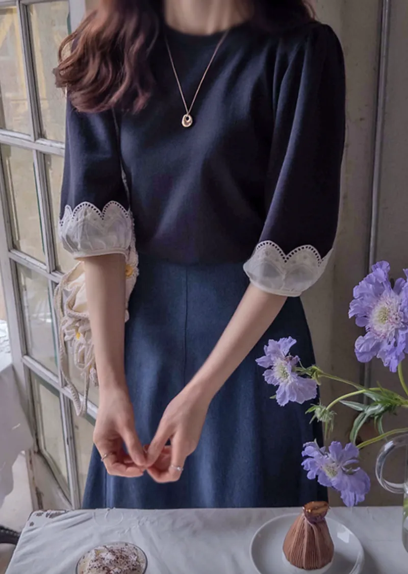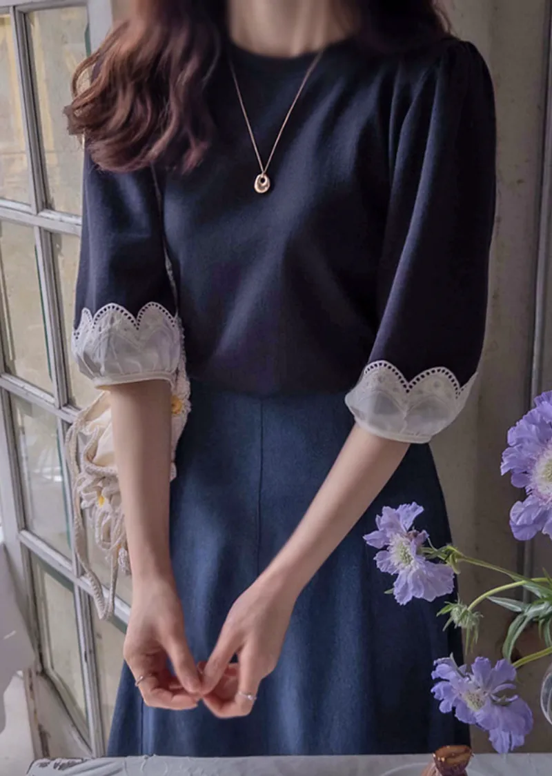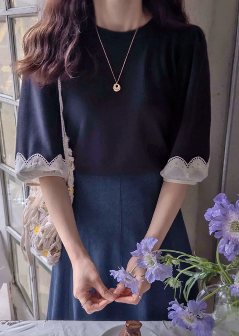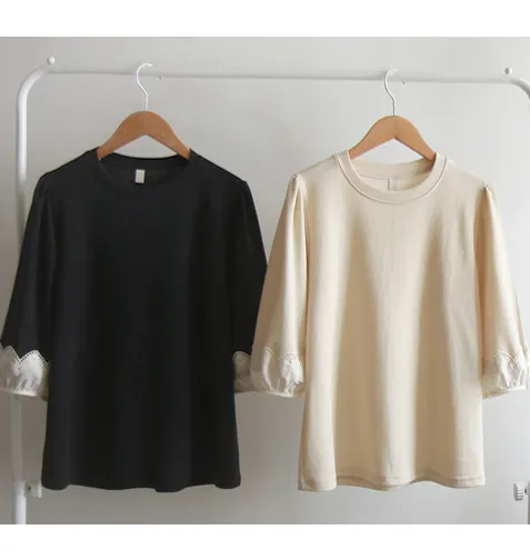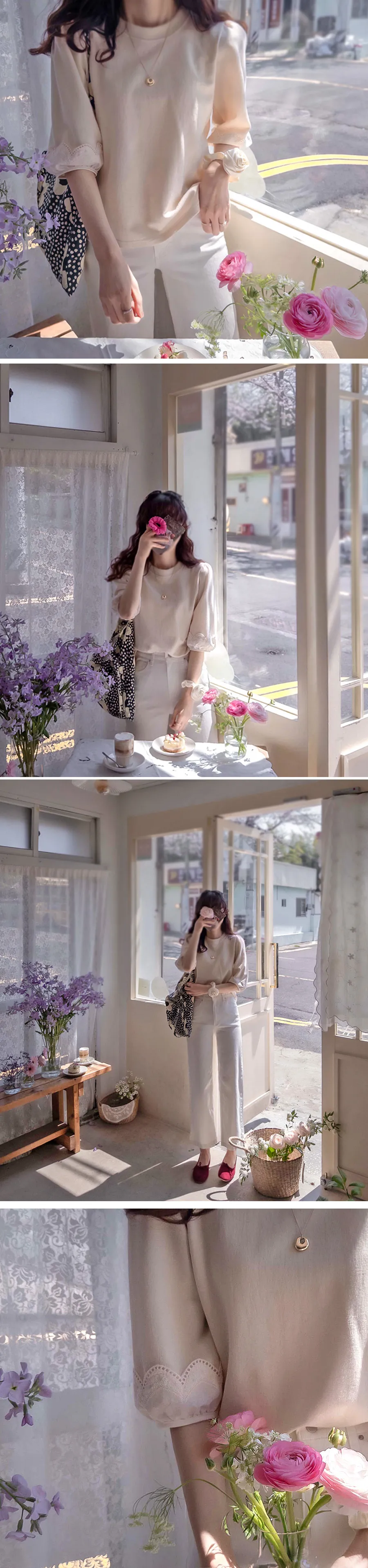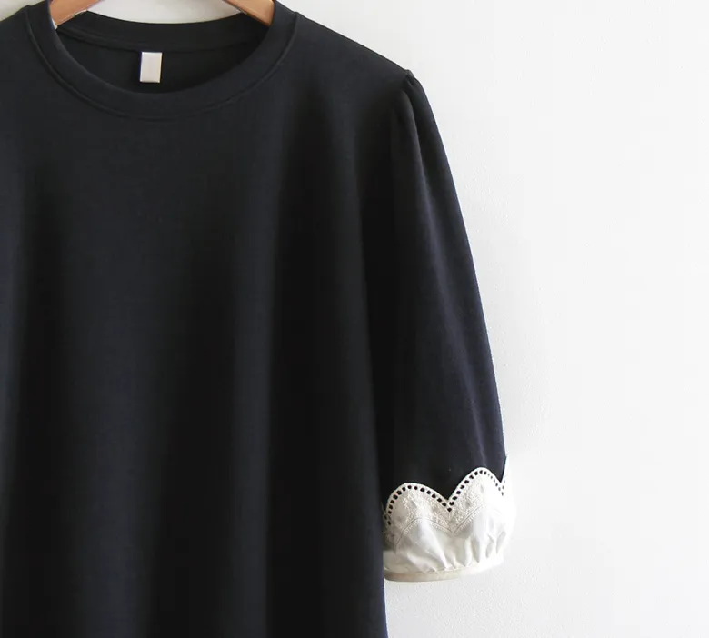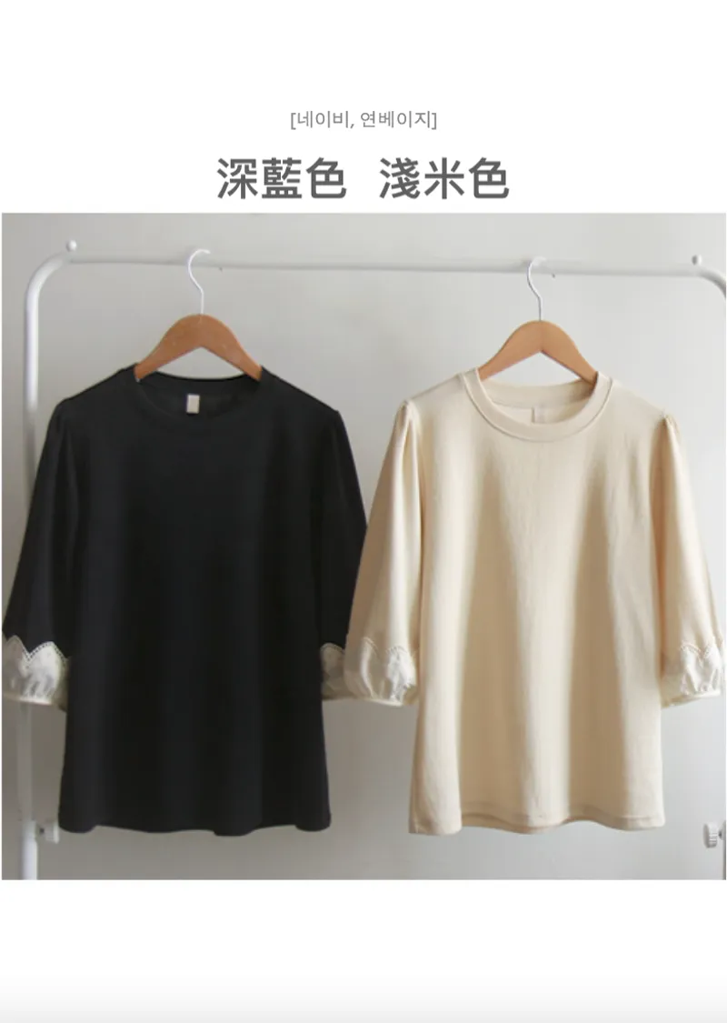 可愛袖末蕾絲花朵刺繡彈性舒適上衣