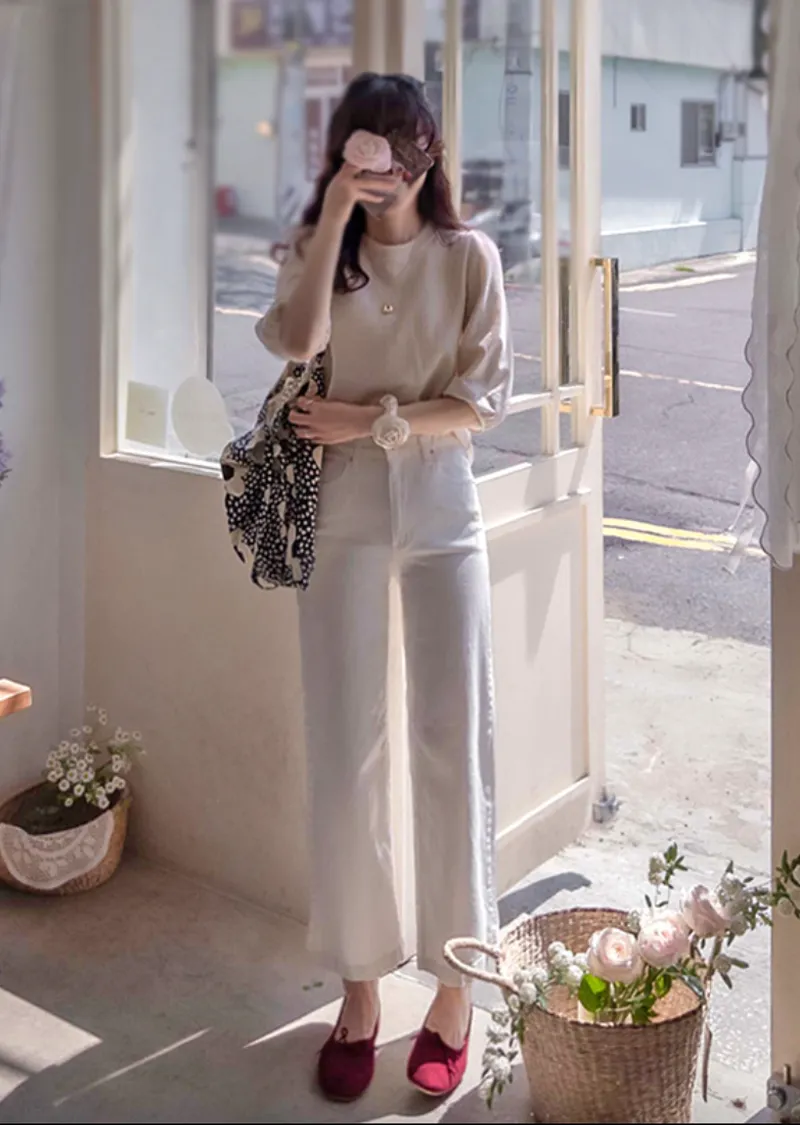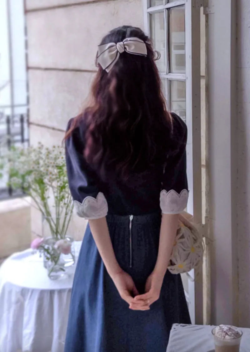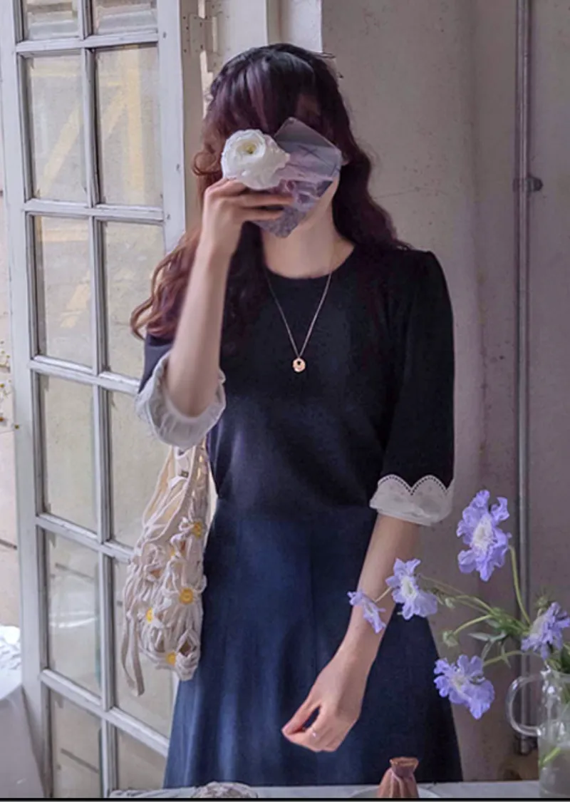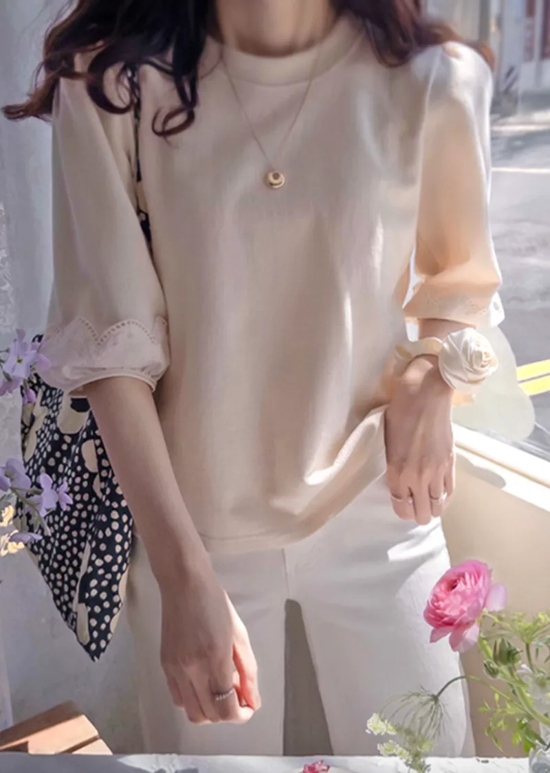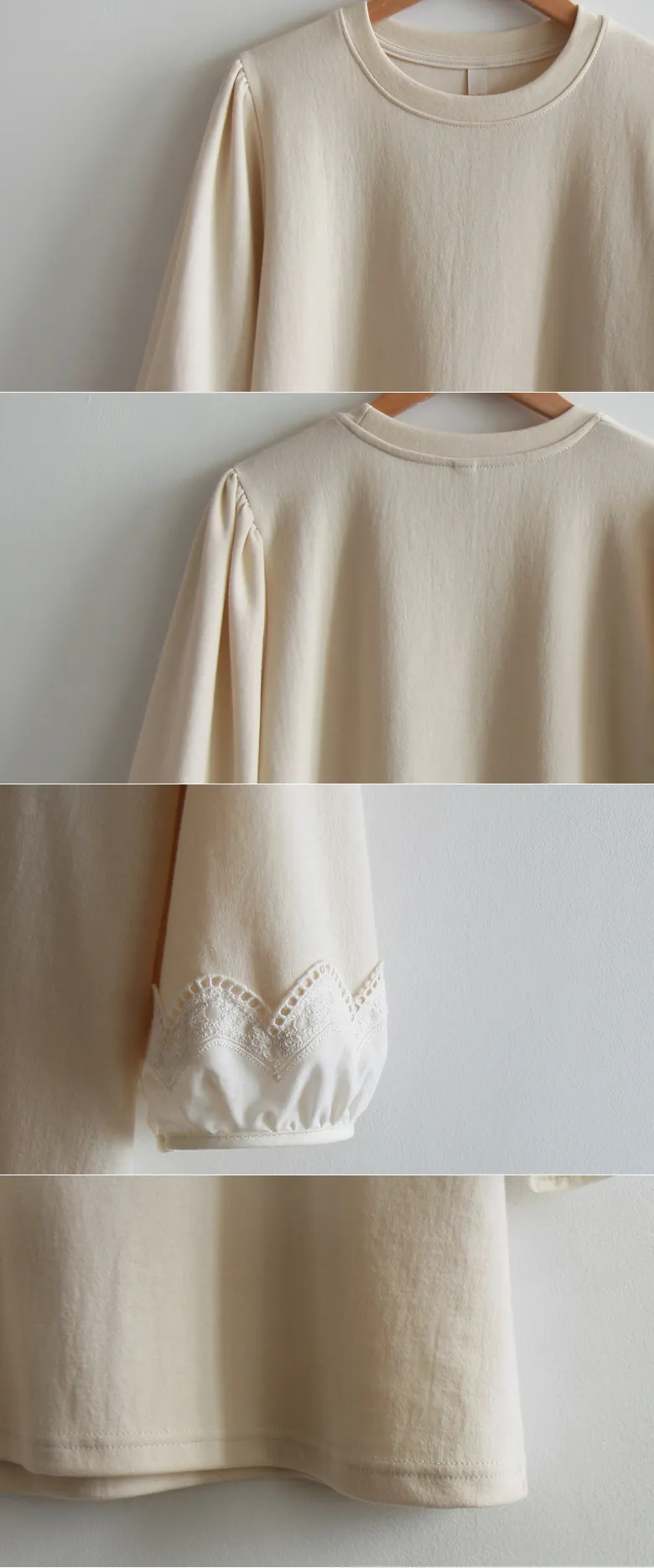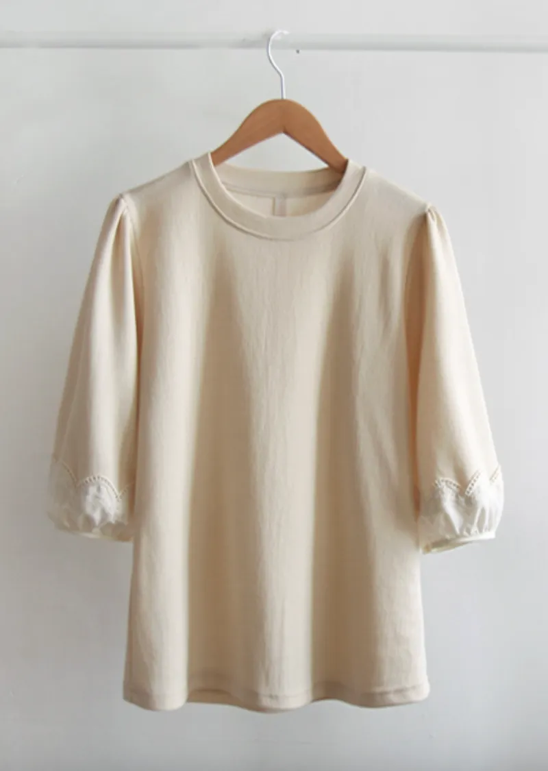 可愛袖末蕾絲花朵刺繡彈性舒適上衣