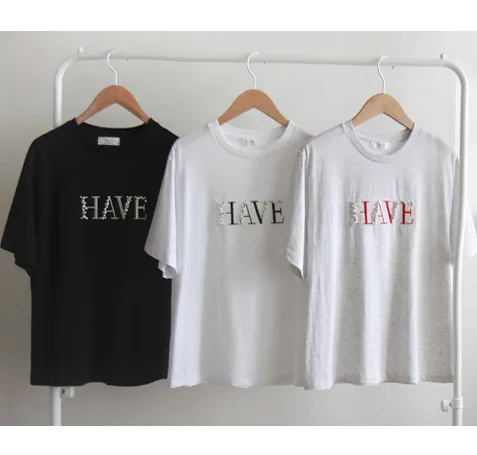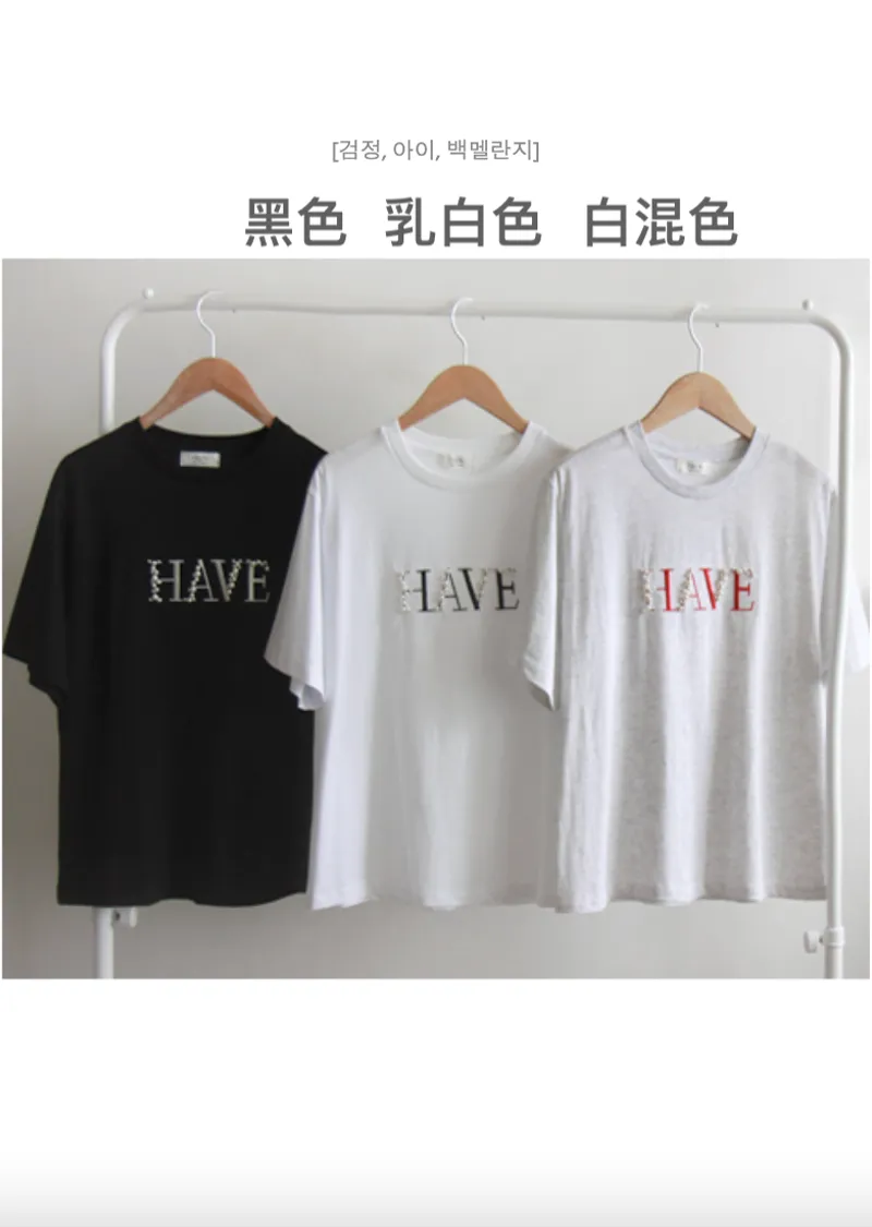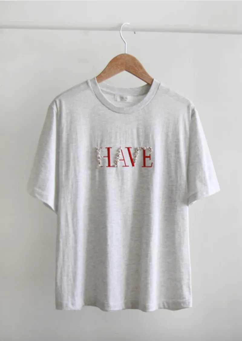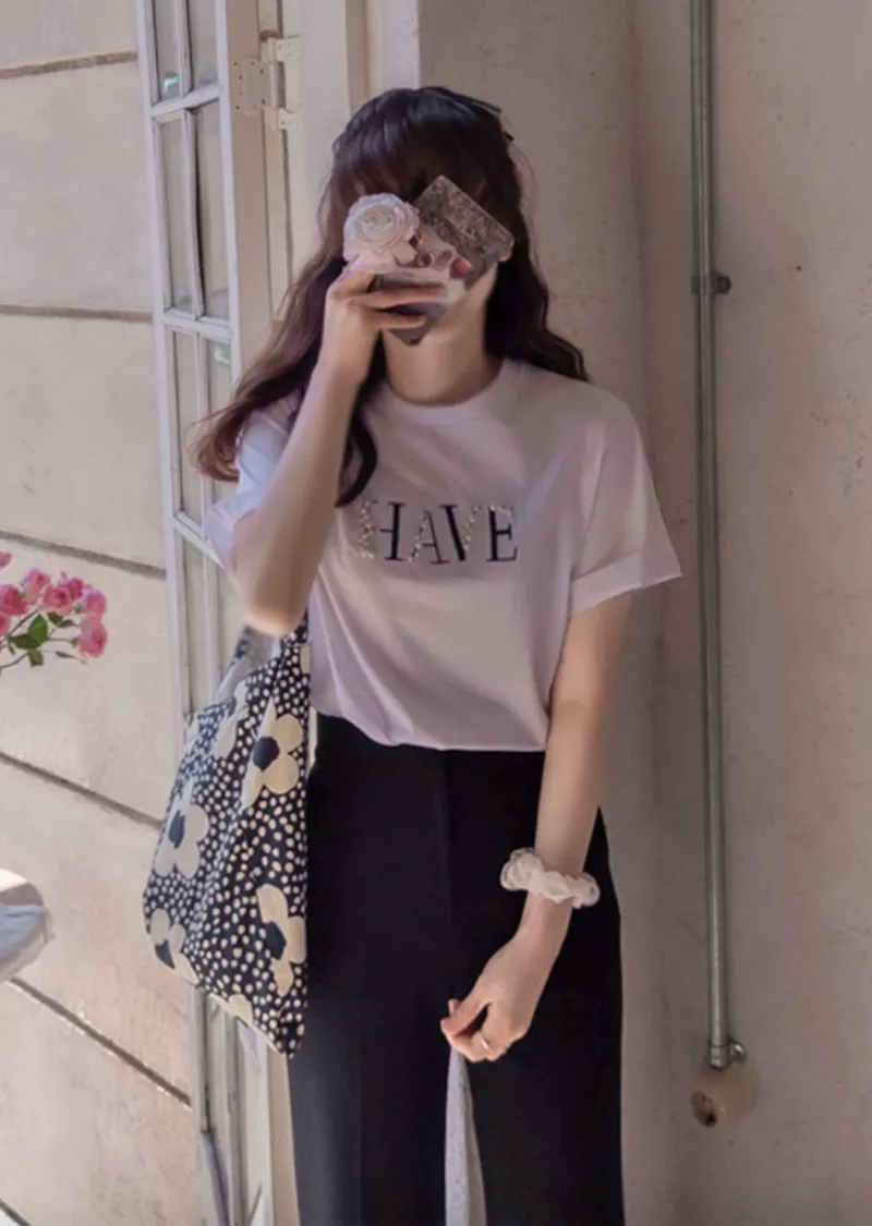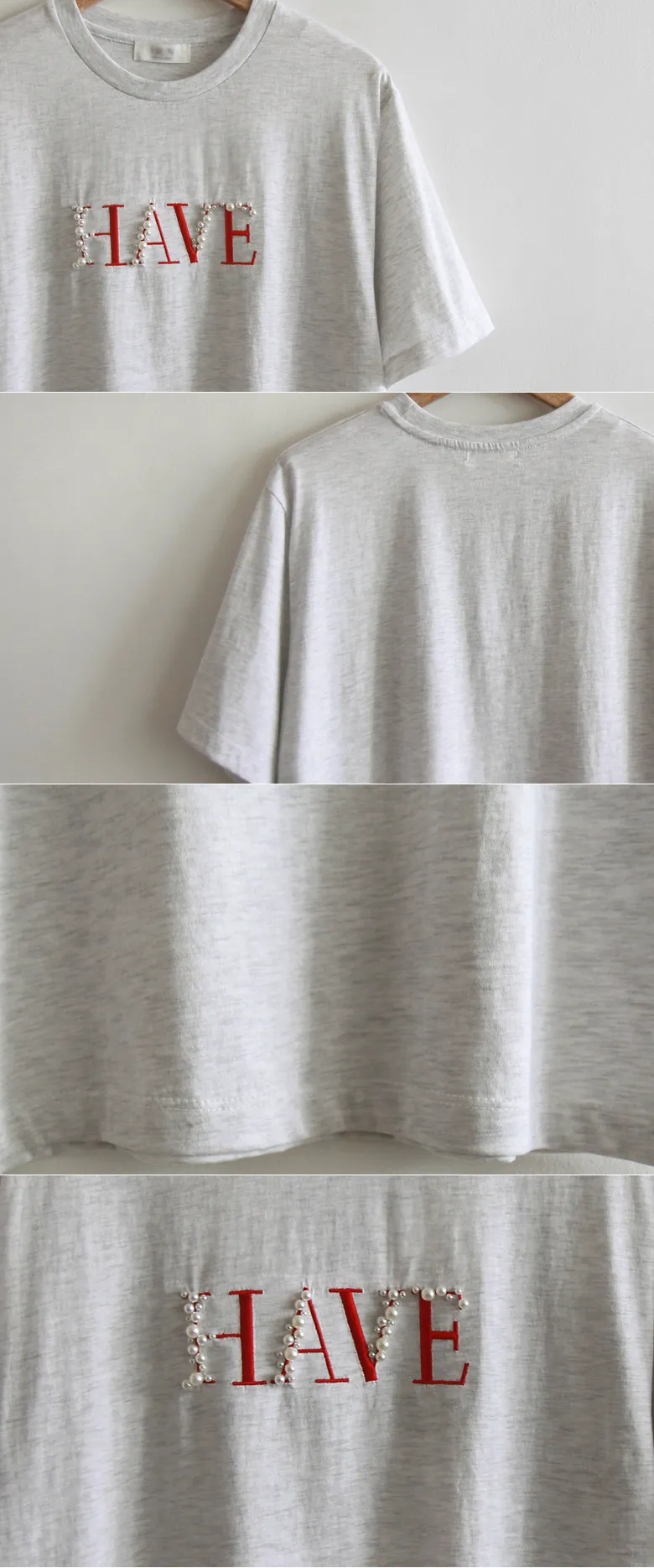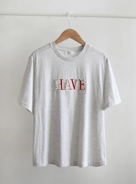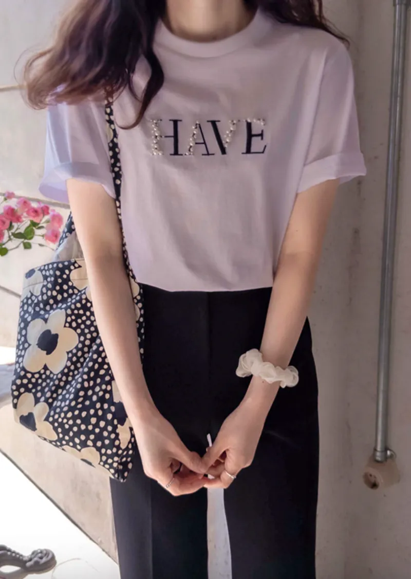 點綴珍珠裝飾字母刺繡柔軟短袖上衣