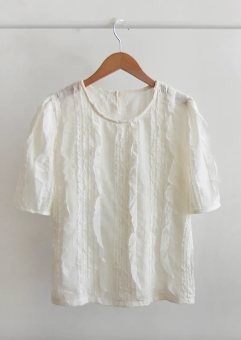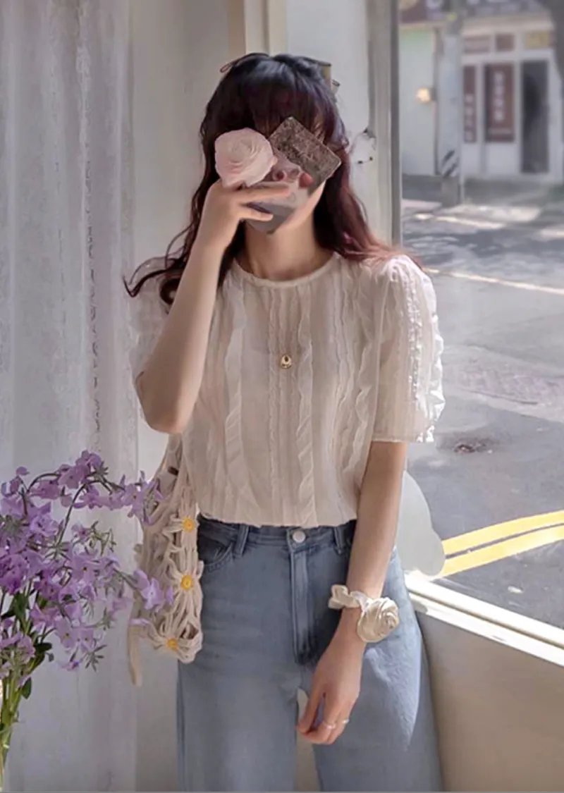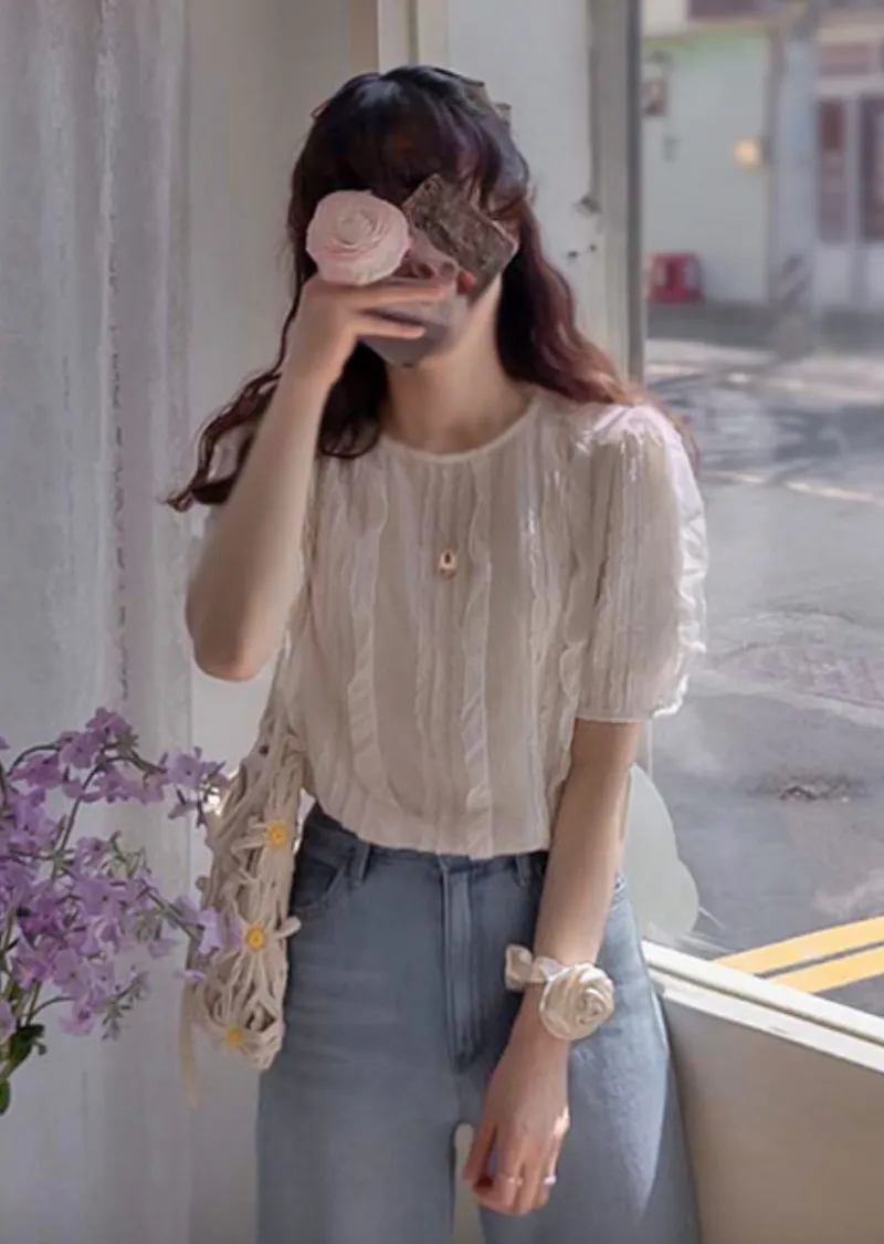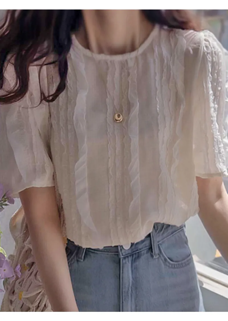 【適合春夏的蕾絲上衣】【清新的版型,不用擔心褶皺】【透過立體的波浪線條營造出可愛的氛圍】【肩線剪裁泡泡袖營造出優雅的氣質】【推薦明亮精緻的上衣】