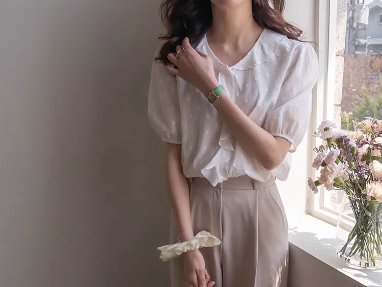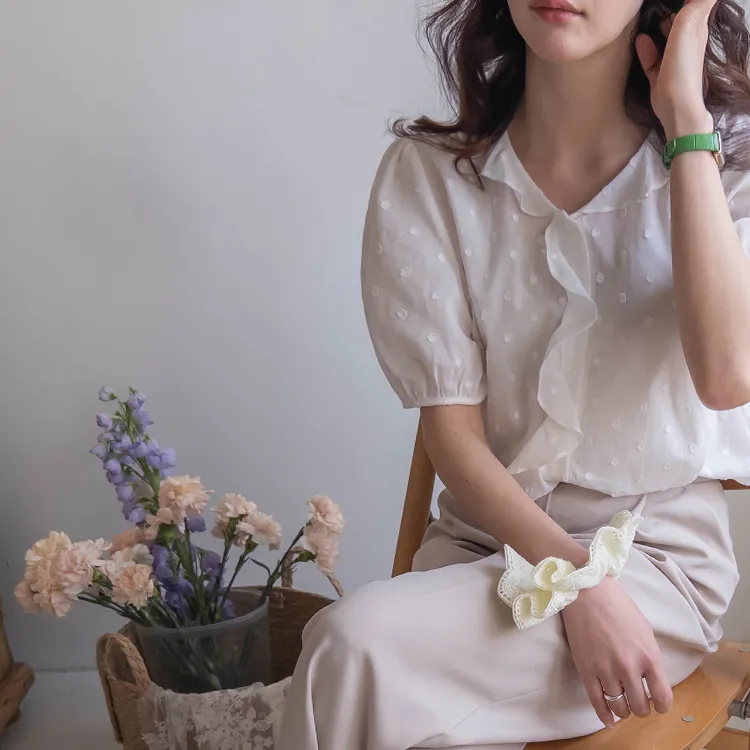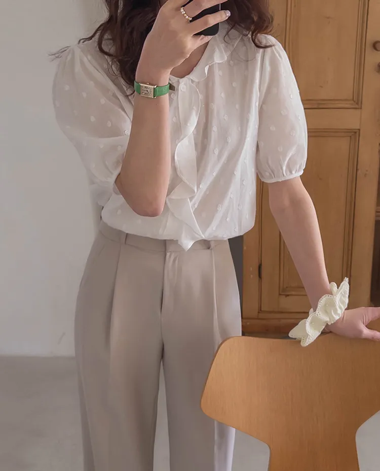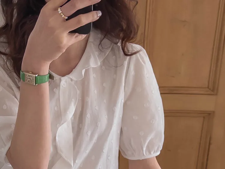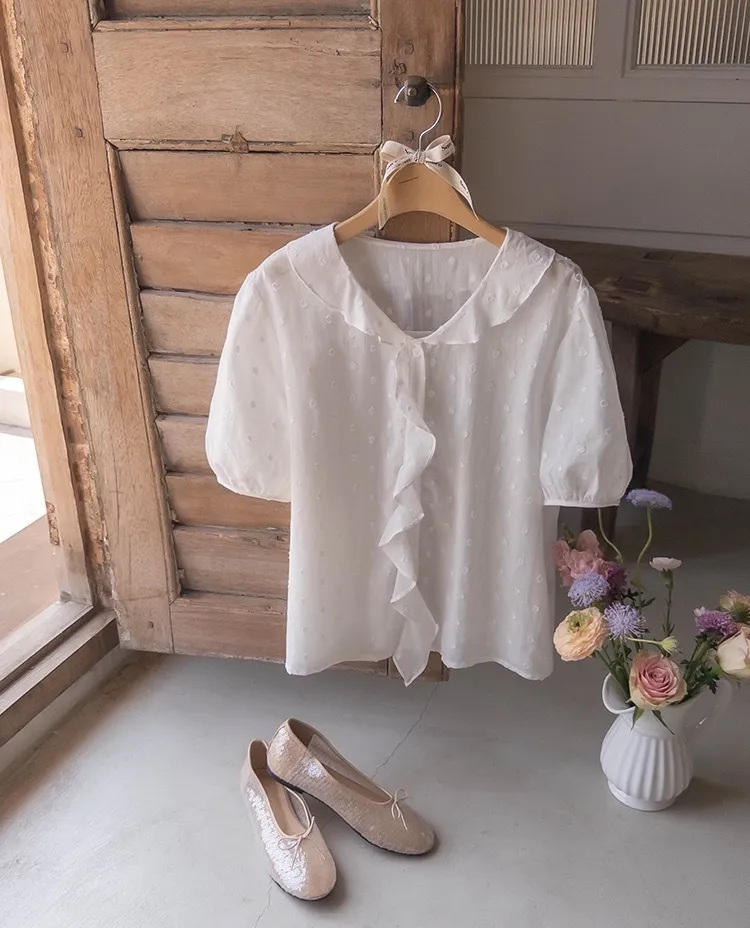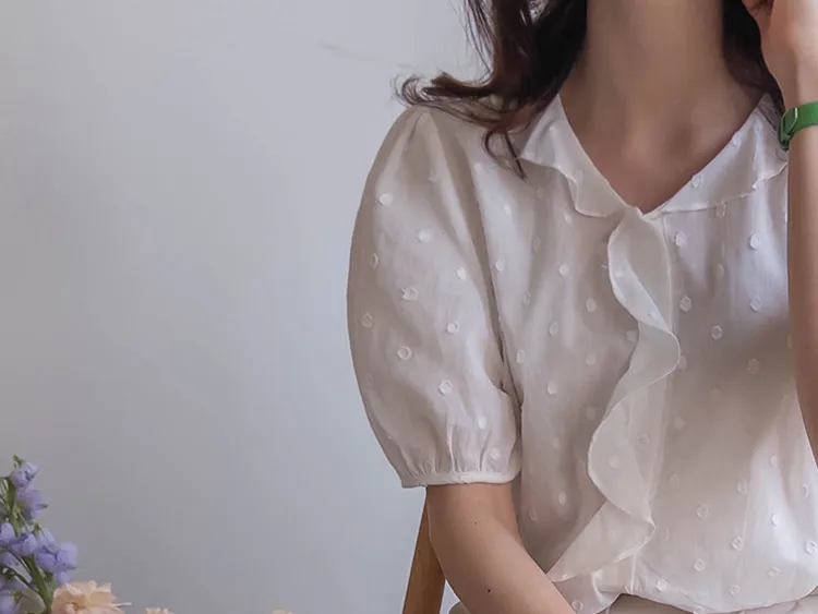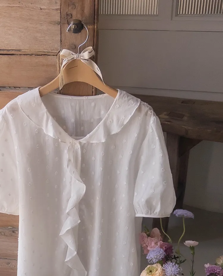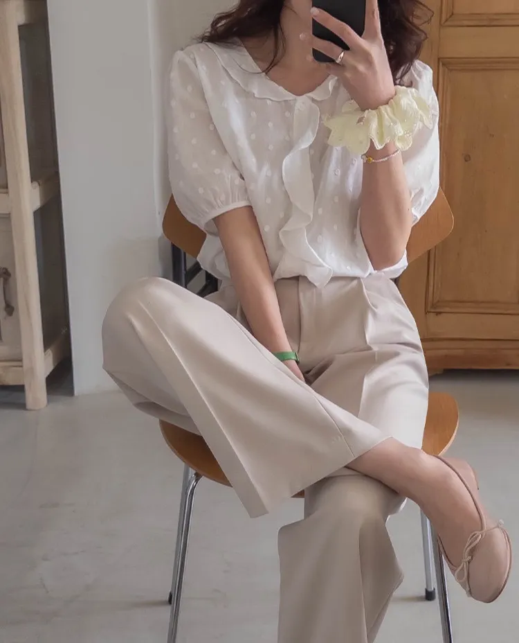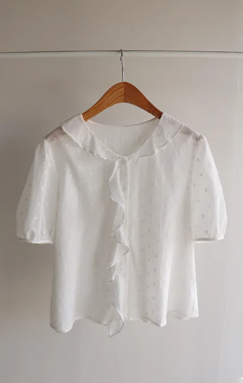 【精緻圓點花紋和立體荷葉邊細節】【浪漫可愛的氛圍♡】【泡泡袖褶襉細節~】【乾燥的質感,涼爽到夏天~】