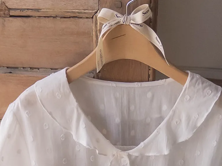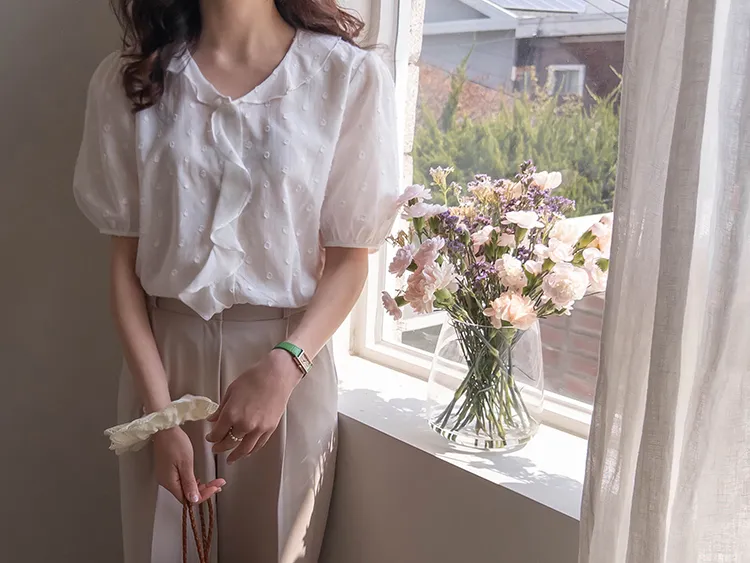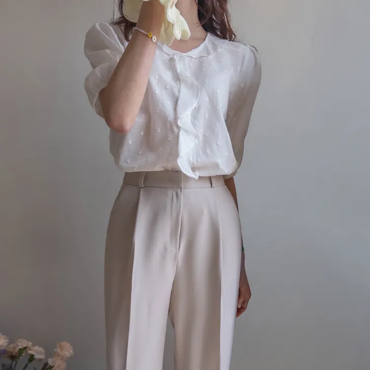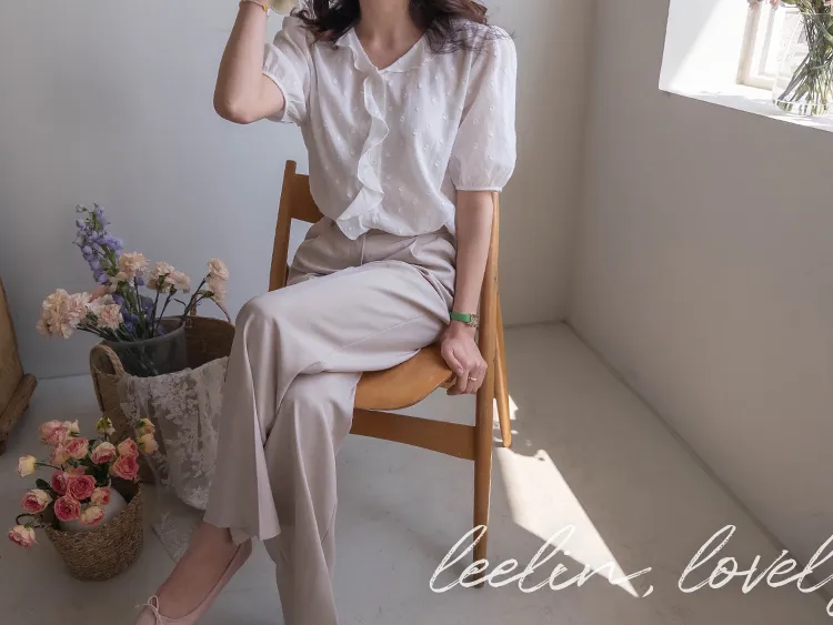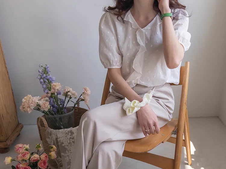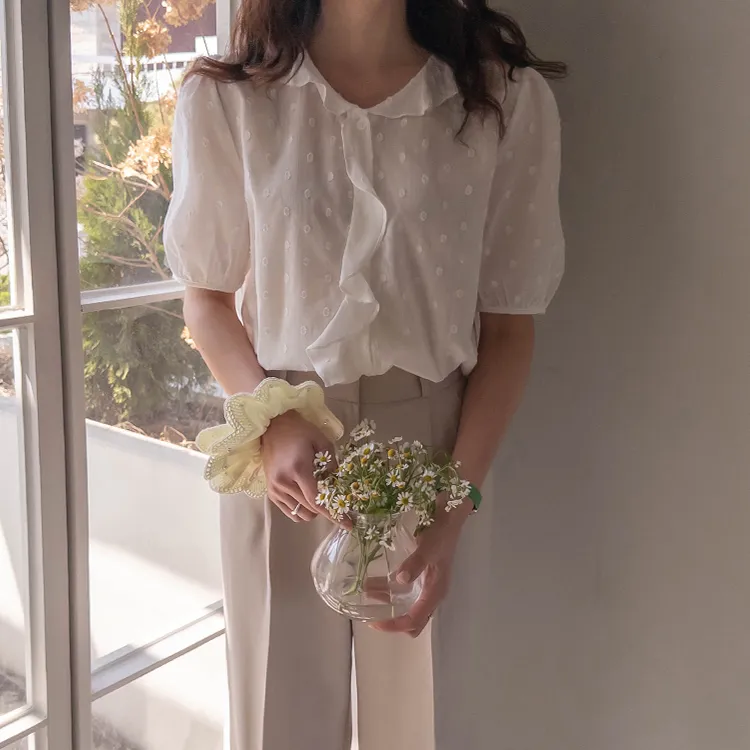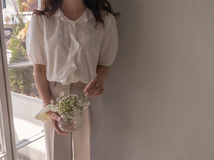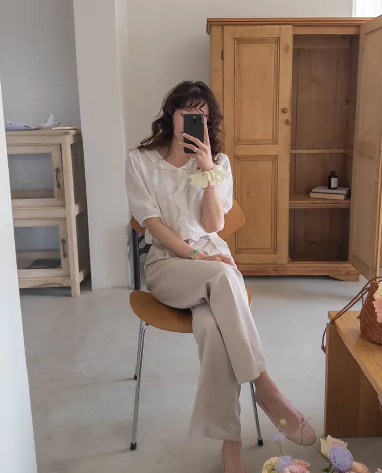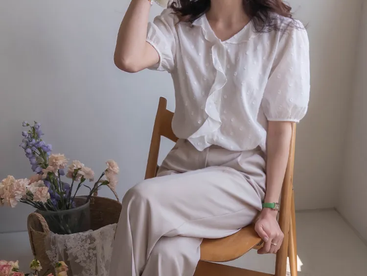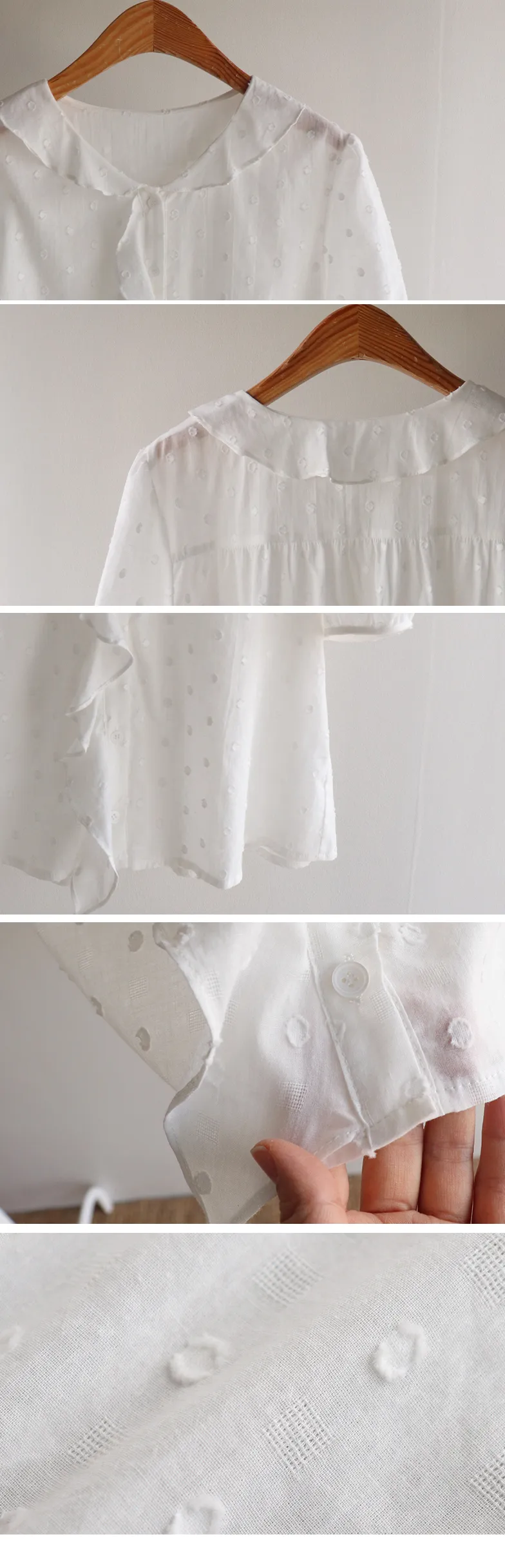 【精緻圓點花紋和立體荷葉邊細節】【浪漫可愛的氛圍♡】【泡泡袖褶襉細節~】【乾燥的質感,涼爽到夏天~】