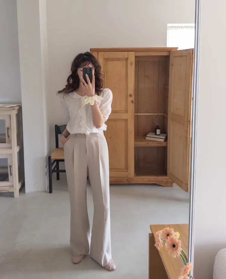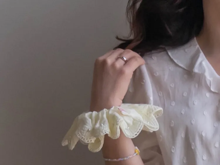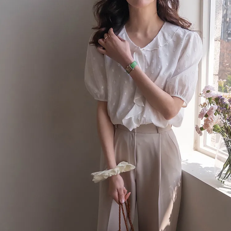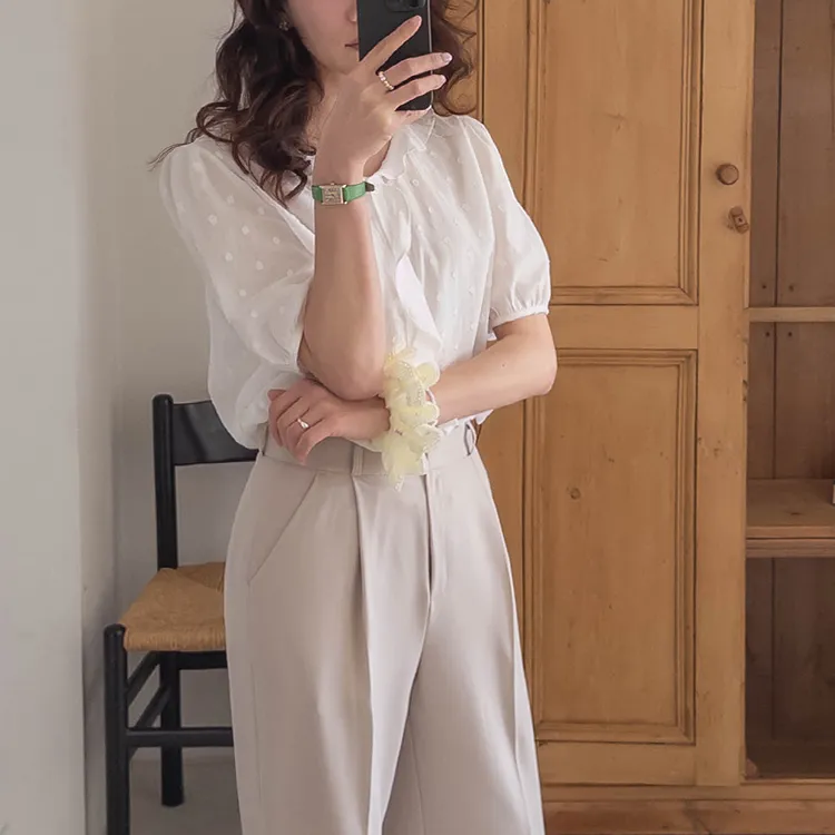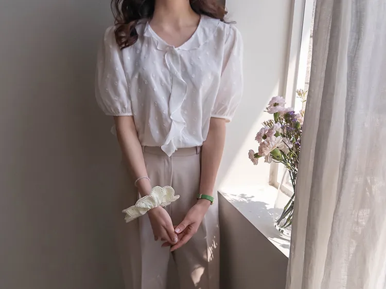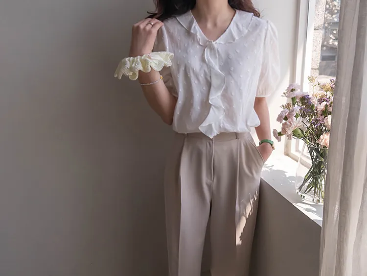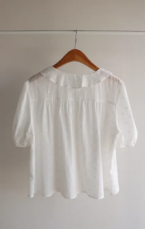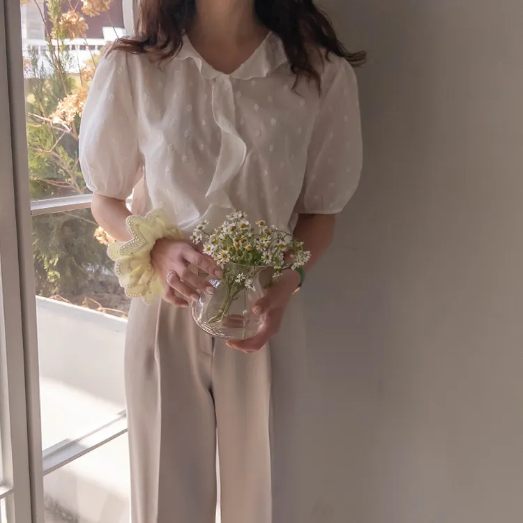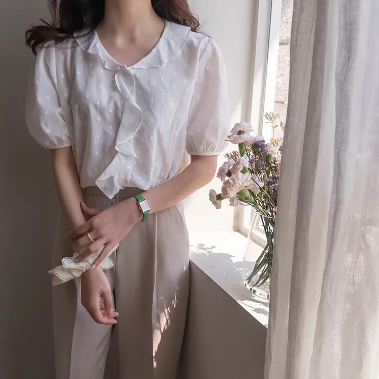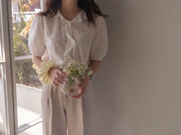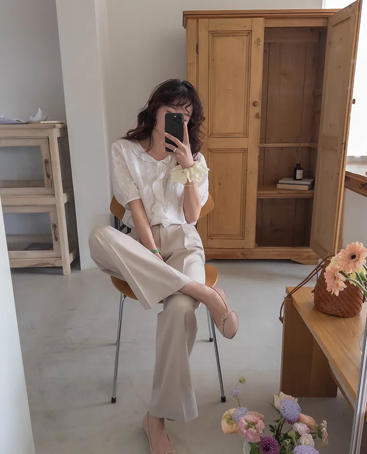 【精緻圓點花紋和立體荷葉邊細節】【浪漫可愛的氛圍♡】【泡泡袖褶襉細節~】【乾燥的質感,涼爽到夏天~】