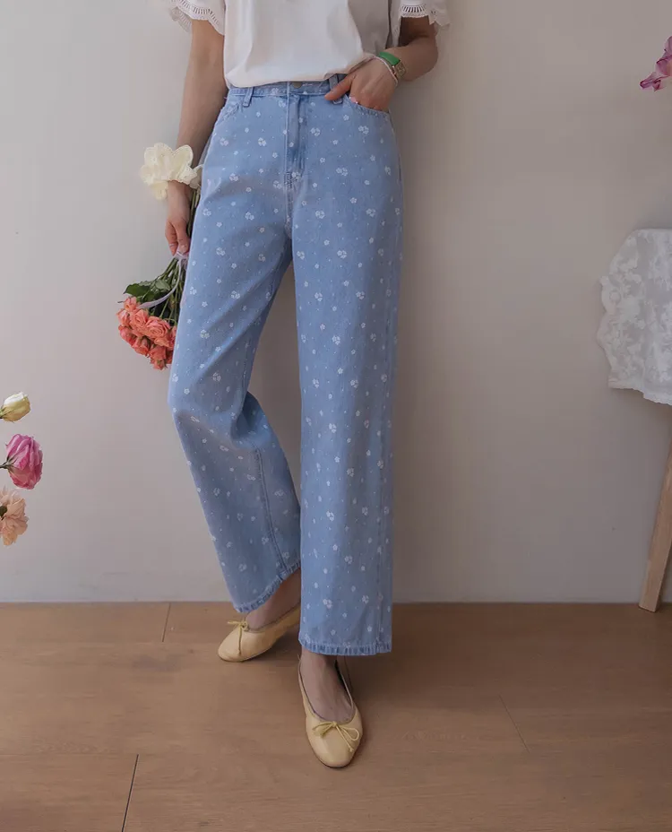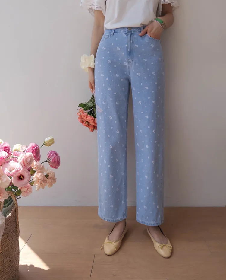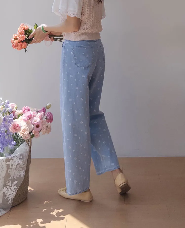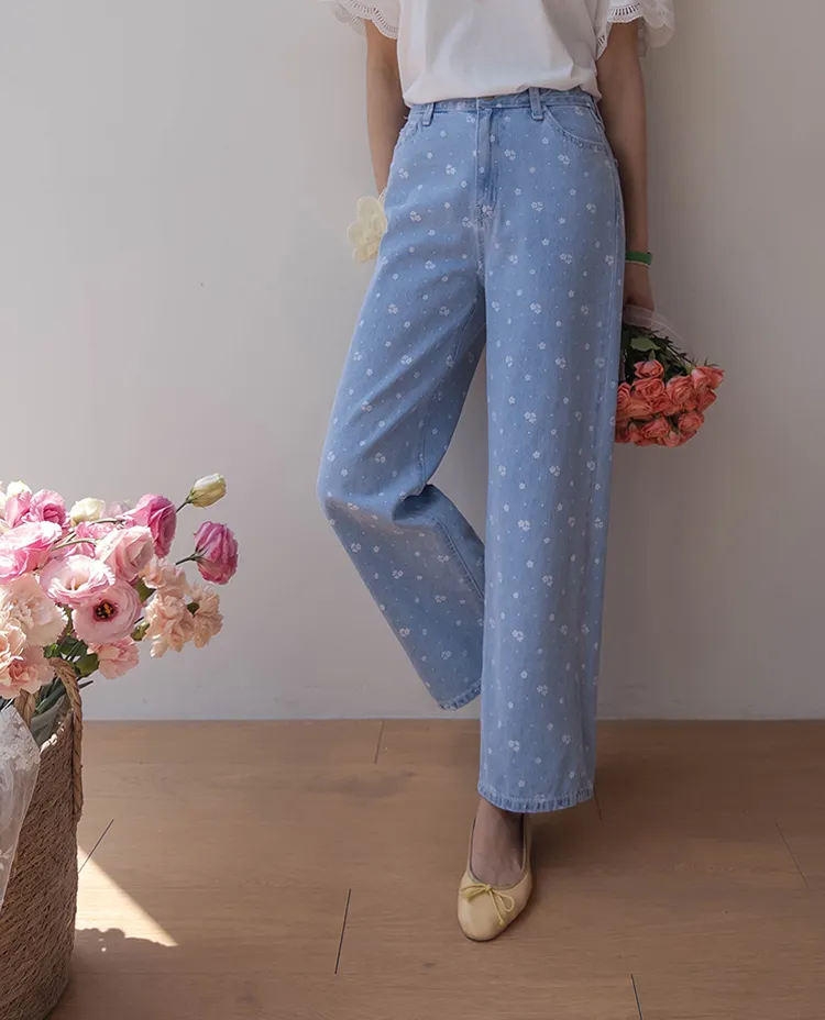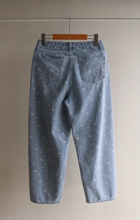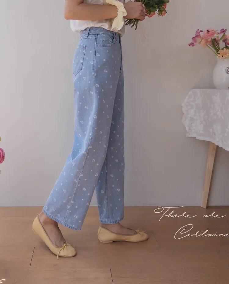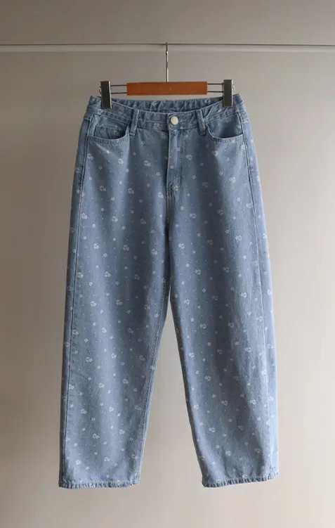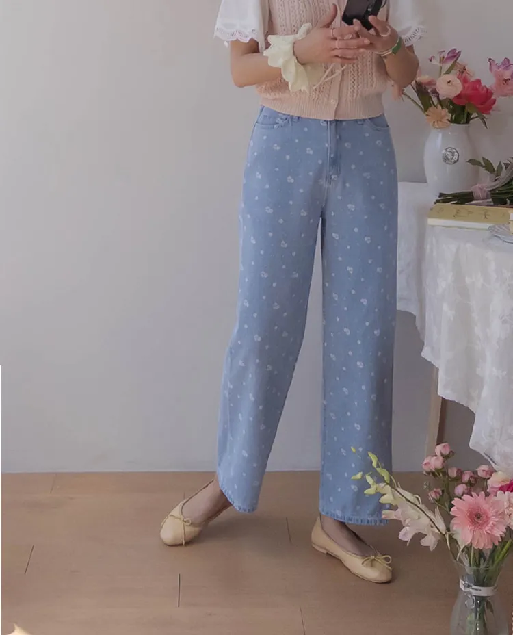 【充滿春意的花朵圖案~優雅可愛的花朵牛仔褲♡】【寬鬆的版型,修飾線條! 】【一條褲子就能打造時尚造型~】【 100%棉】