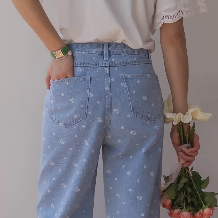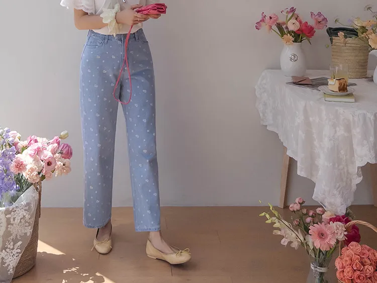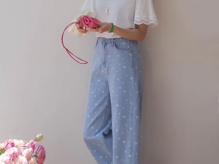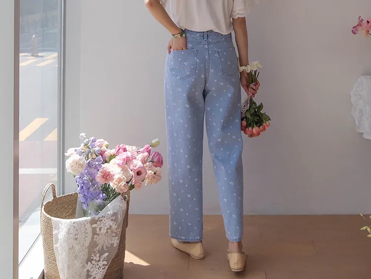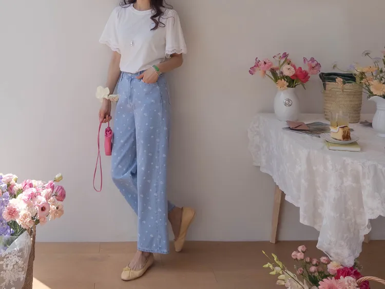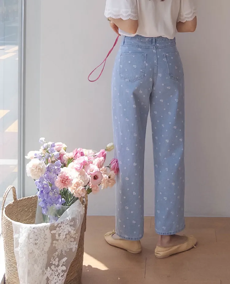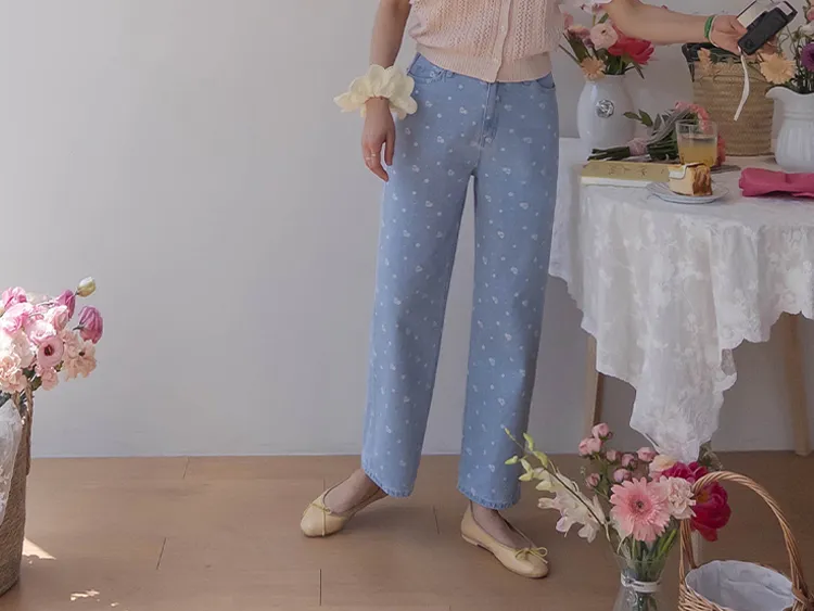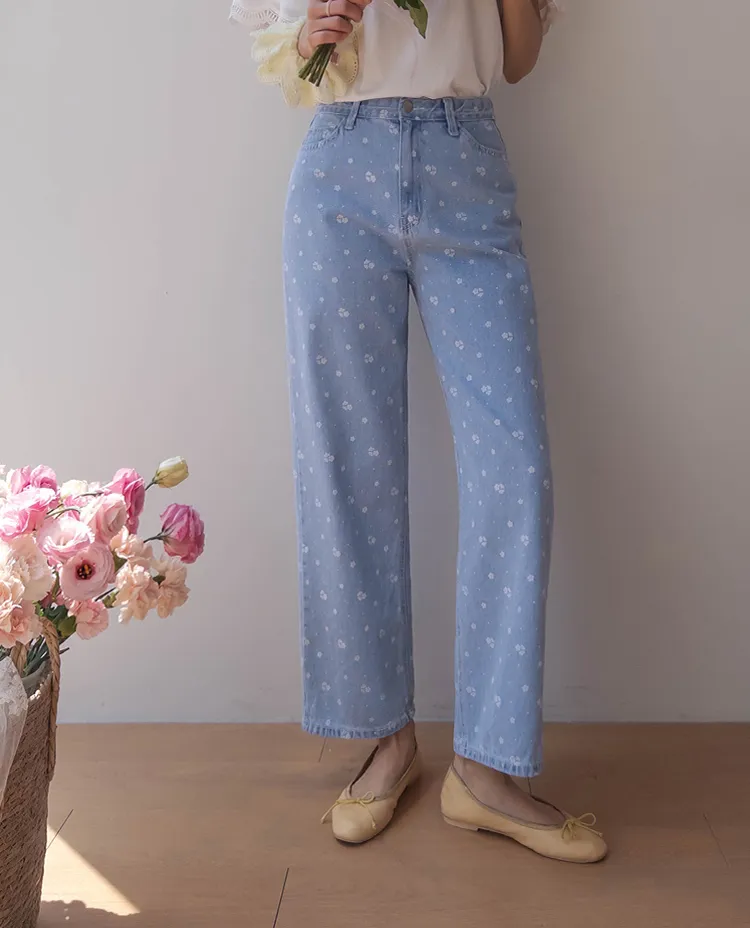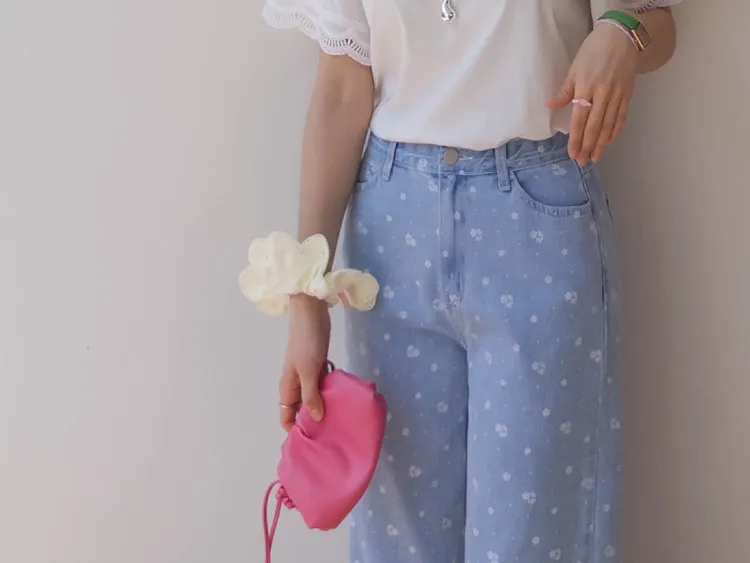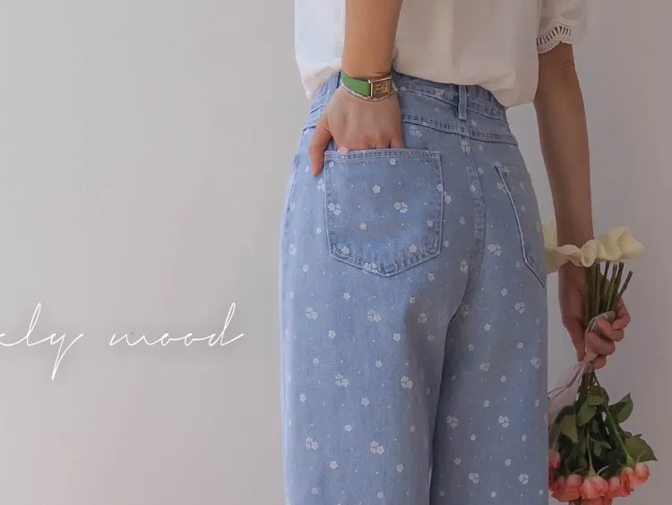 【充滿春意的花朵圖案~優雅可愛的花朵牛仔褲♡】【寬鬆的版型,修飾線條! 】【一條褲子就能打造時尚造型~】【 100%棉】