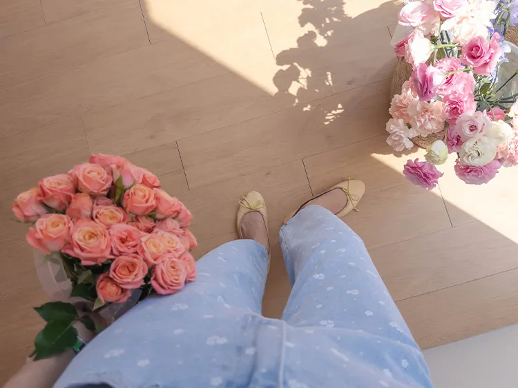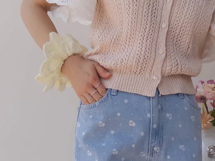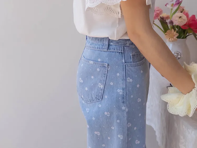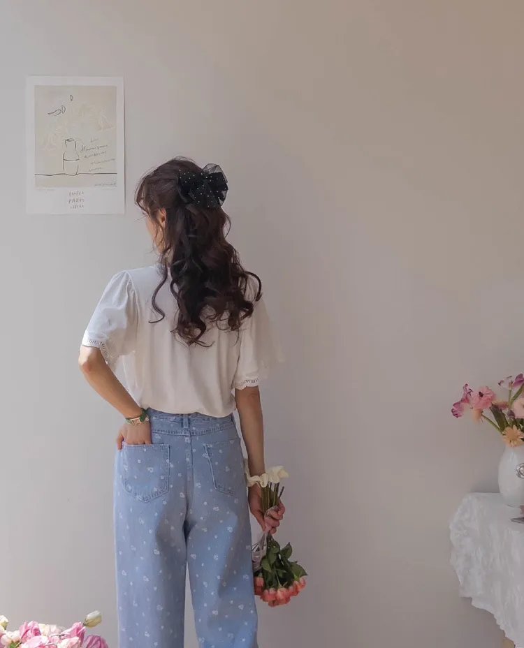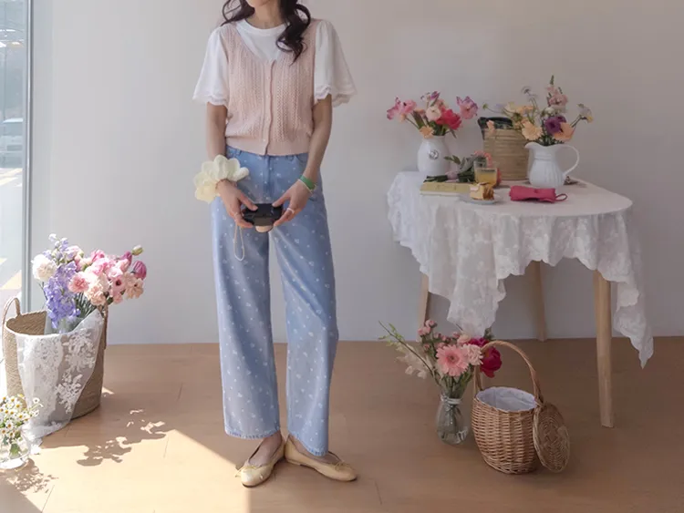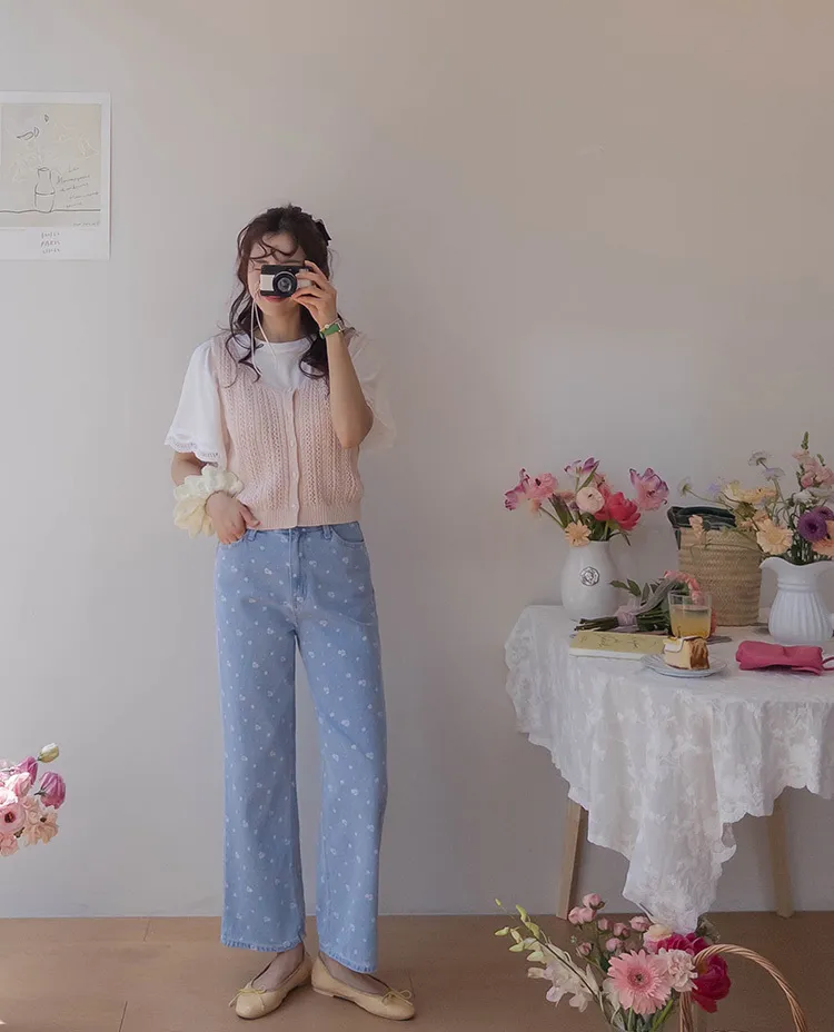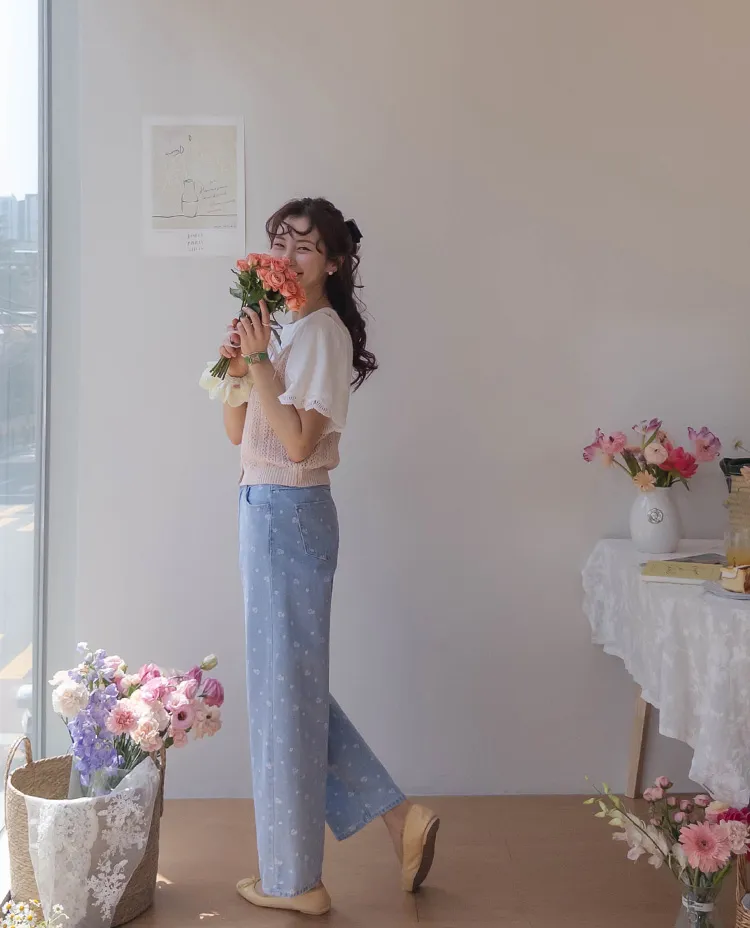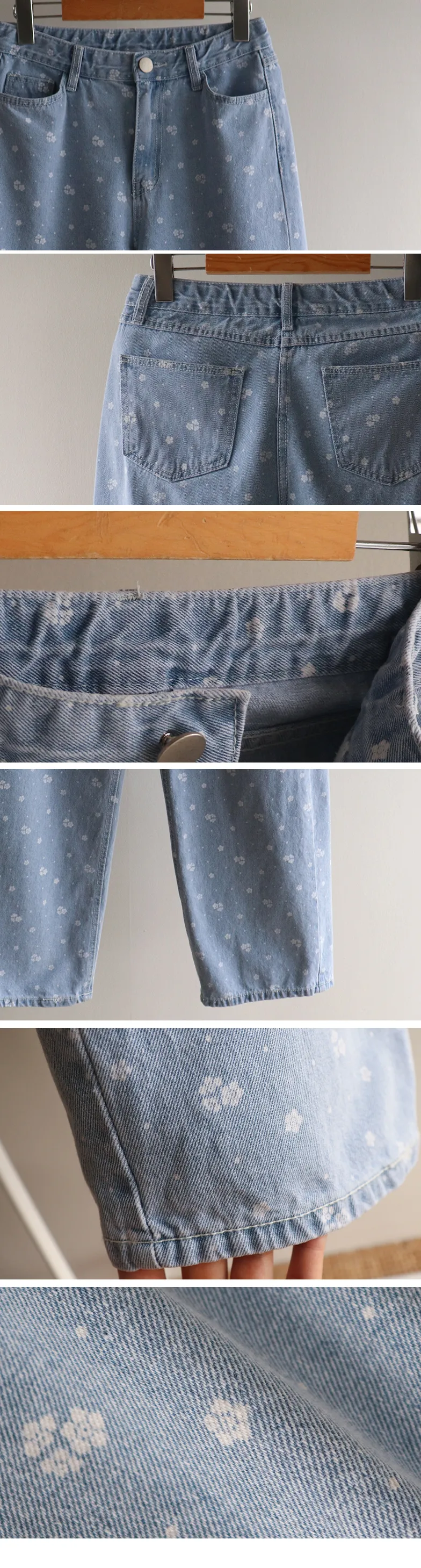 【充滿春意的花朵圖案~優雅可愛的花朵牛仔褲♡】【寬鬆的版型,修飾線條! 】【一條褲子就能打造時尚造型~】【 100%棉】