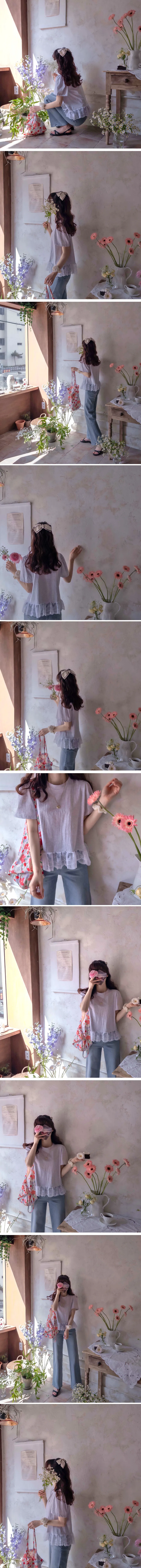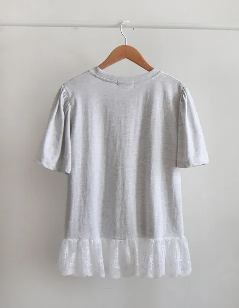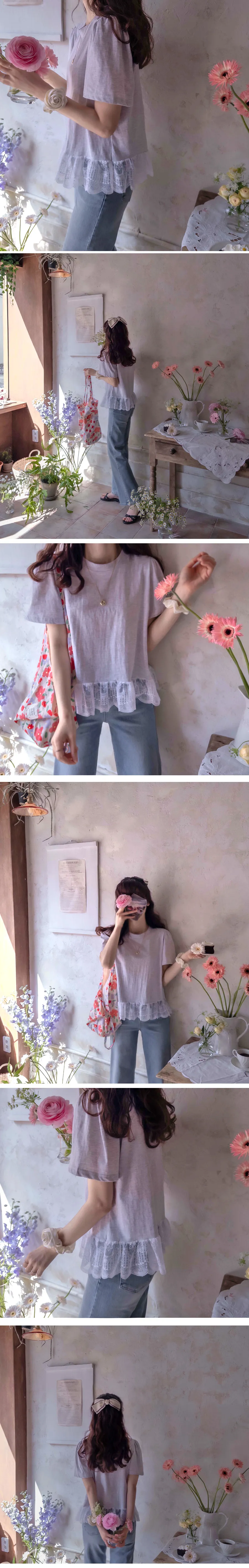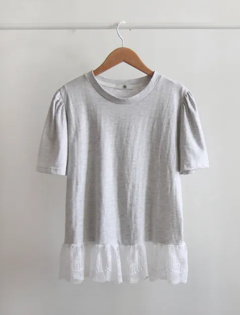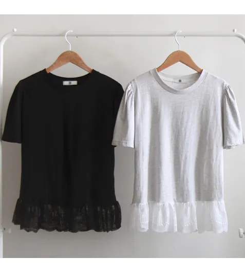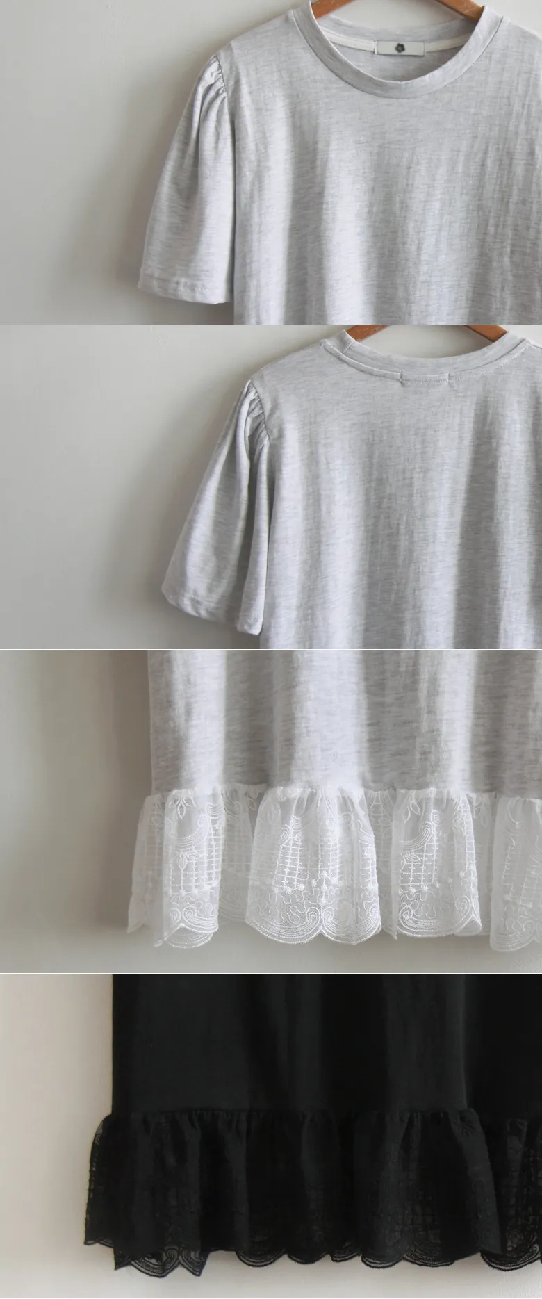 [下擺採用可愛的蕾絲配色和波浪刺繡] [舒適的穿著感] [肩部採用泡泡袖設計,巧妙的共享效果] [符合季節的色彩感和寬鬆的上衣] [推薦作為一件可愛的T卹,時尚的剪裁非常適合彰顯個性] [從現在開始到夏天]