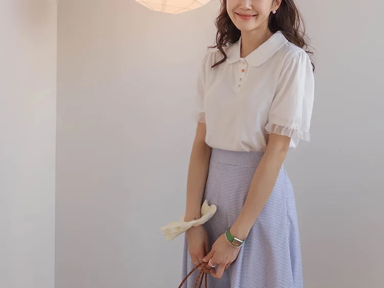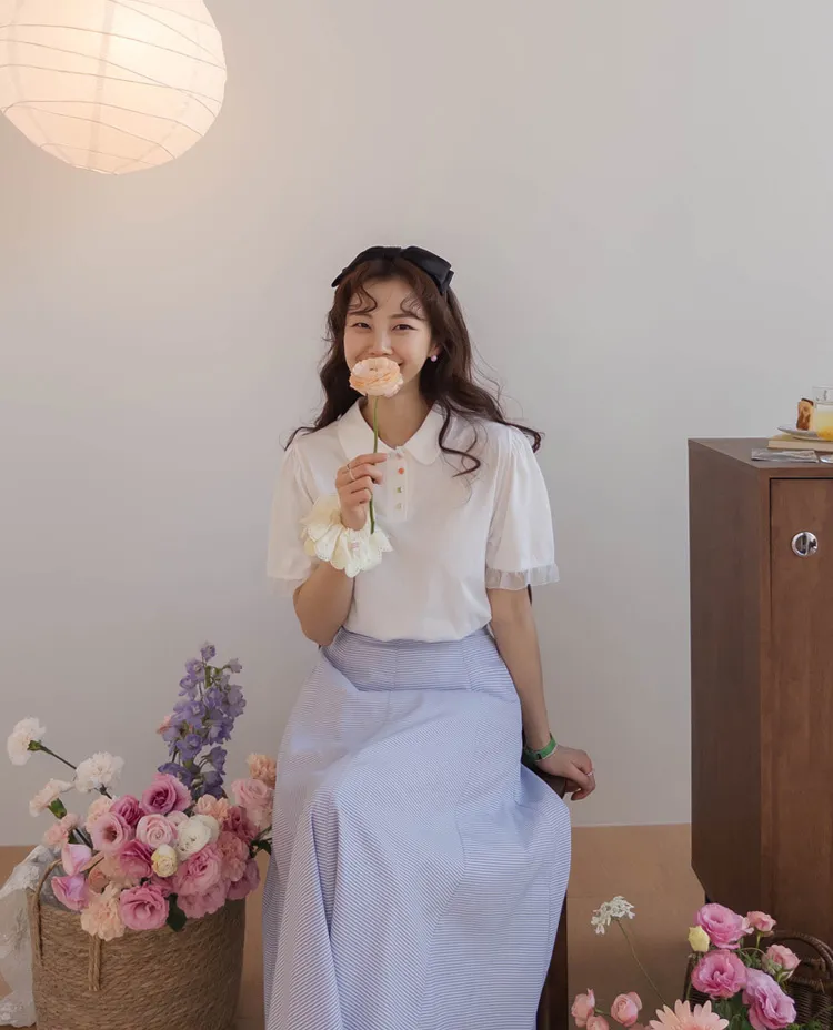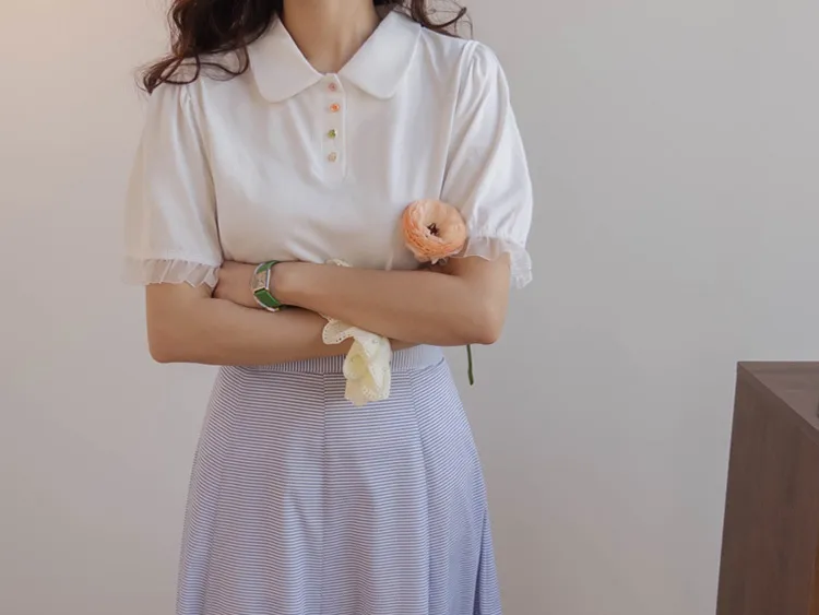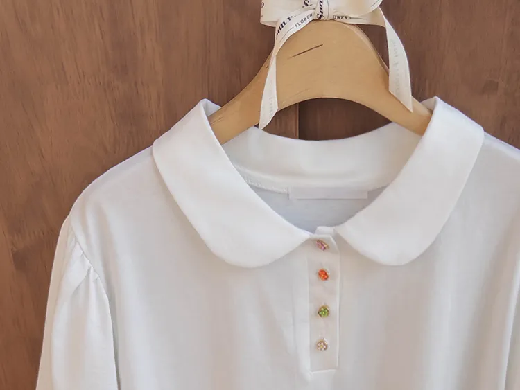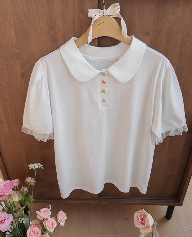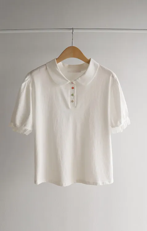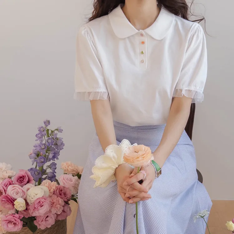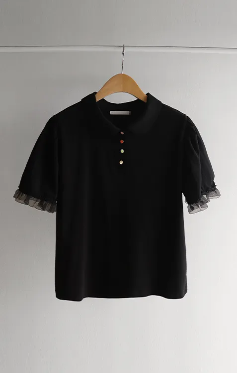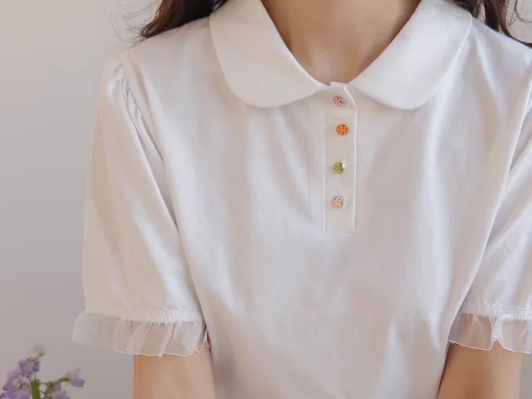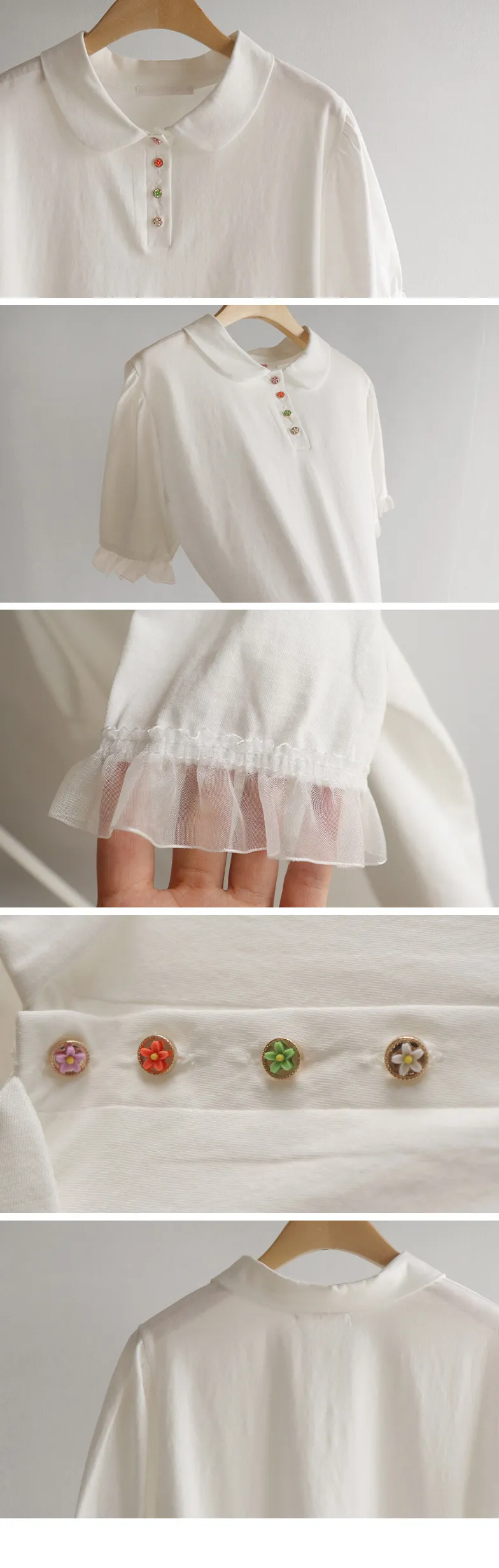 【色彩繽紛~彩色迷你花朵鈕扣設計♥】【泡泡袖版型】【袖口有雪紡荷葉邊更顯可愛~】【適合搭配各種下裝~】