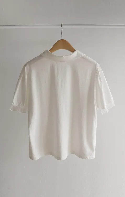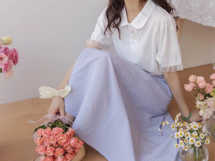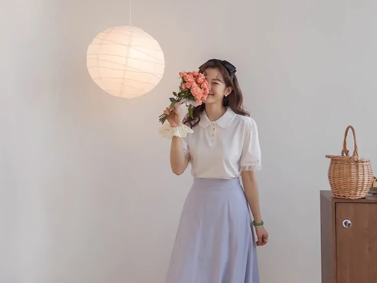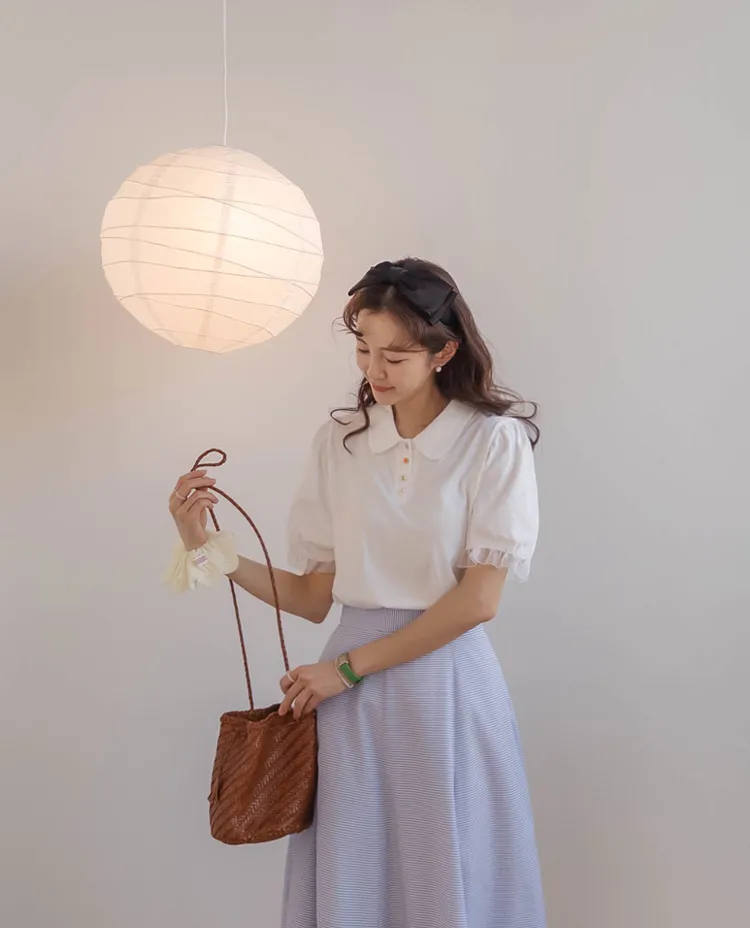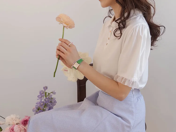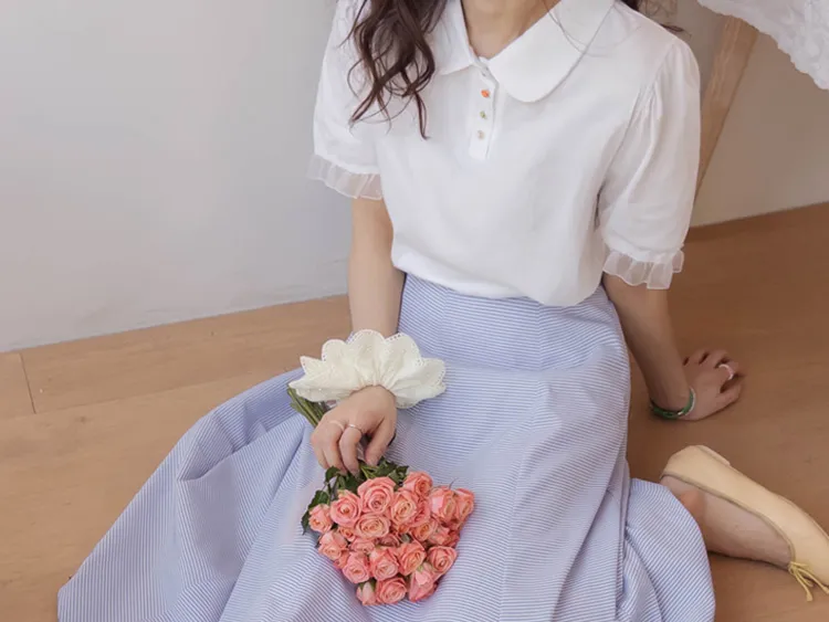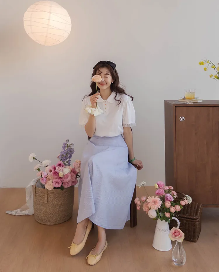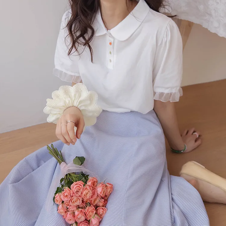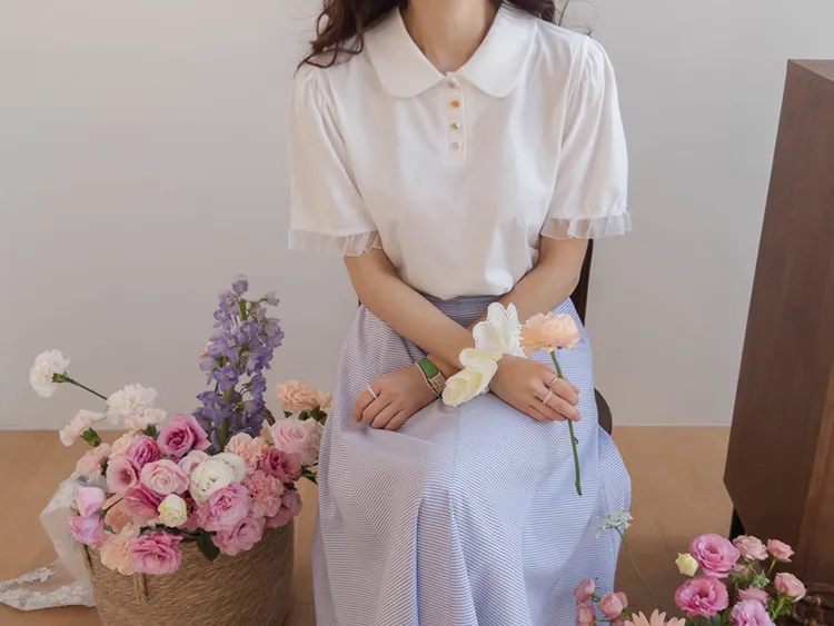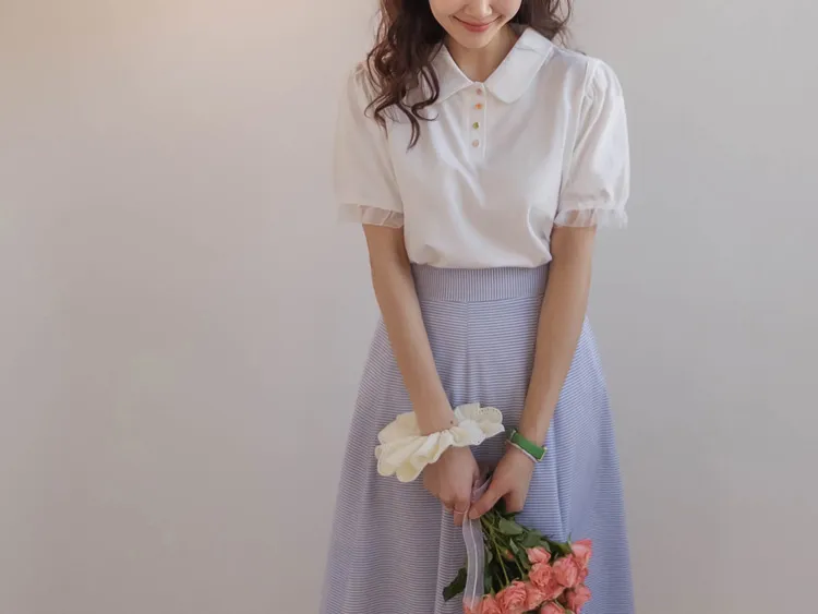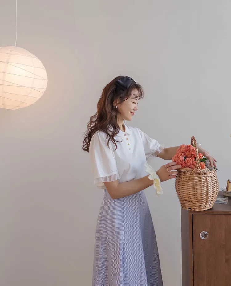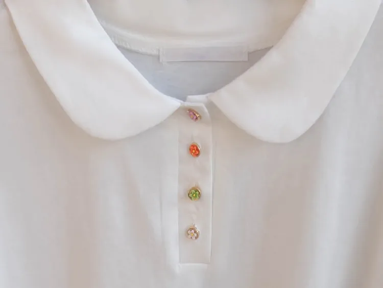 【色彩繽紛~彩色迷你花朵鈕扣設計♥】【泡泡袖版型】【袖口有雪紡荷葉邊更顯可愛~】【適合搭配各種下裝~】