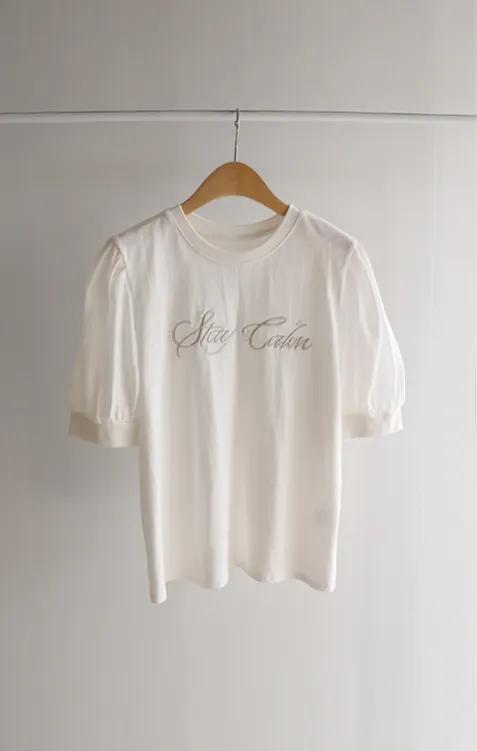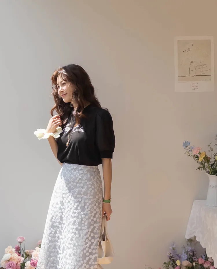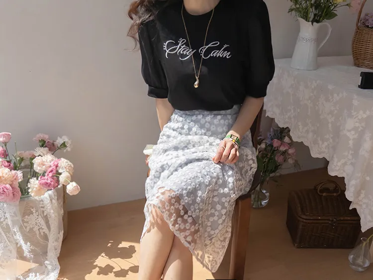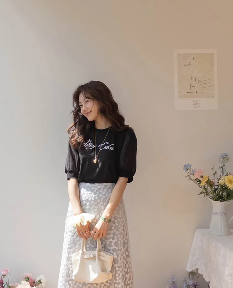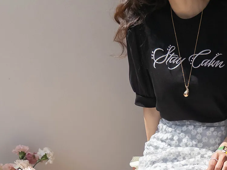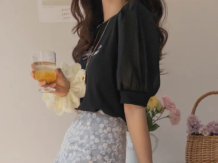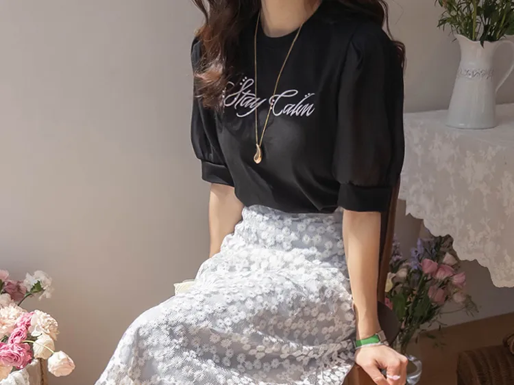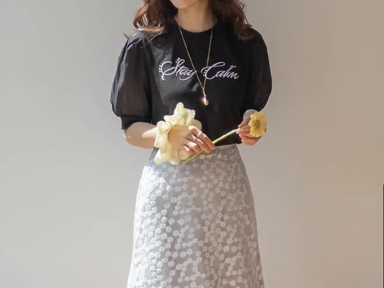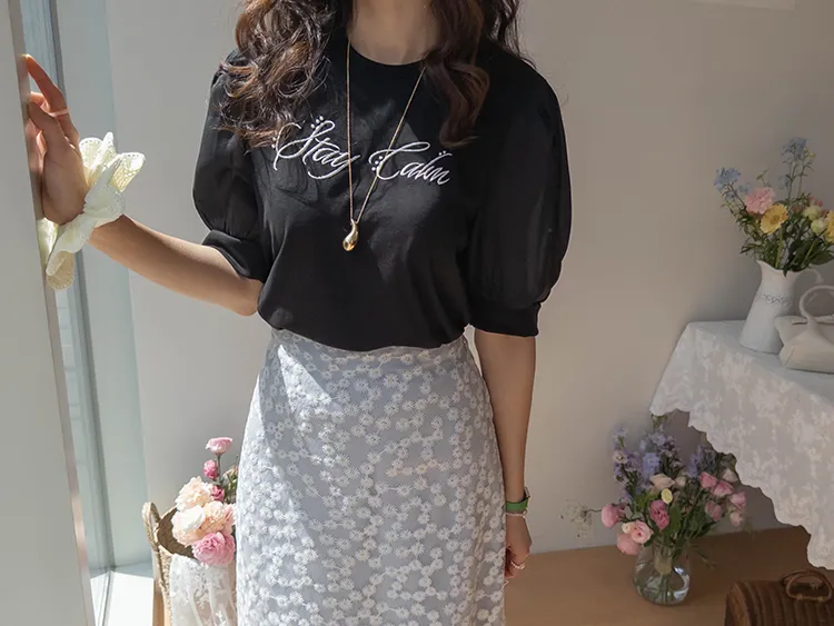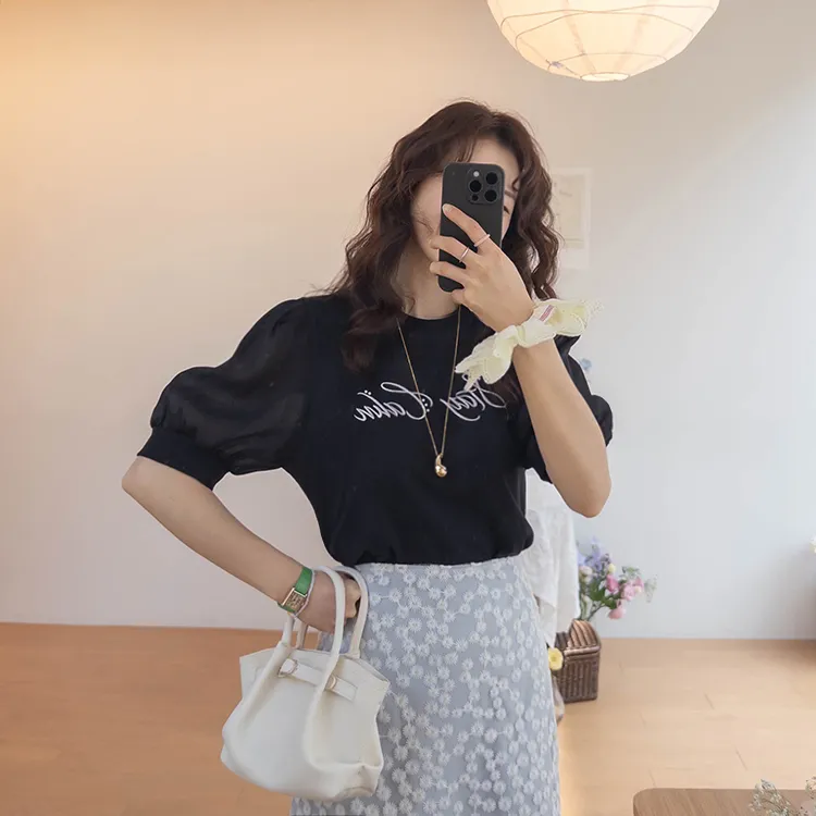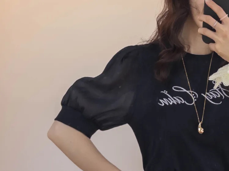 可愛透視泡泡袖輪廓點綴珍珠字母刺繡穿搭上衣