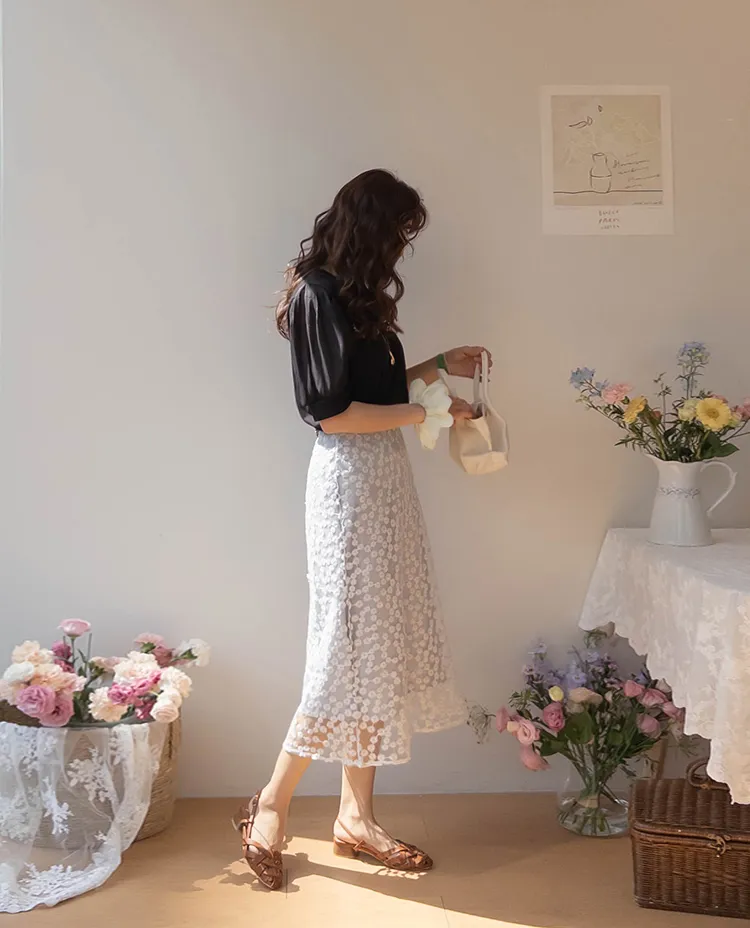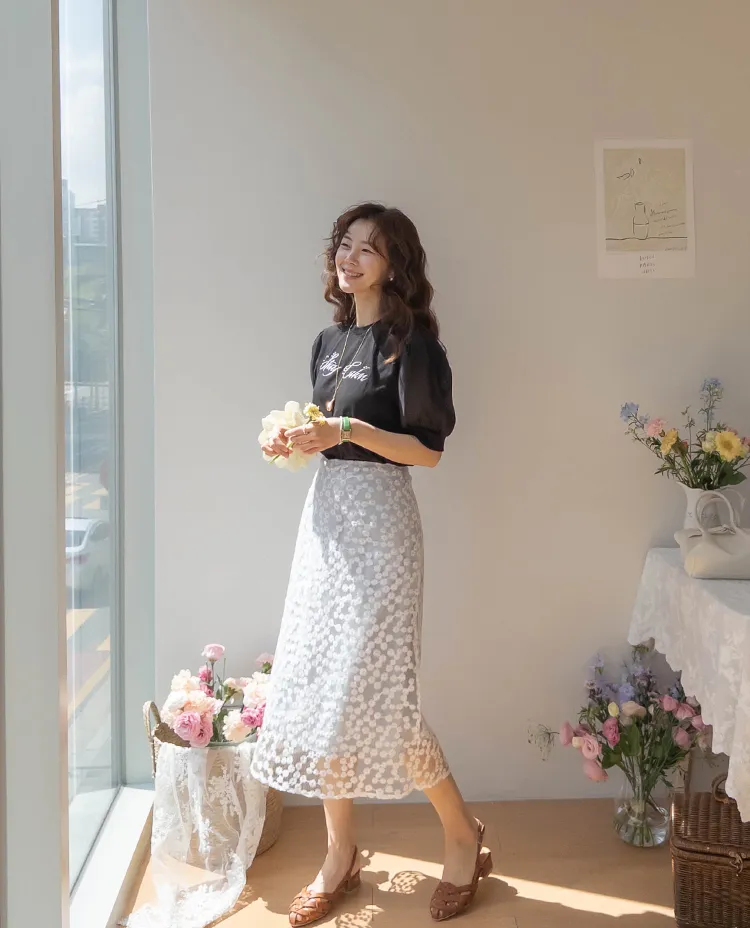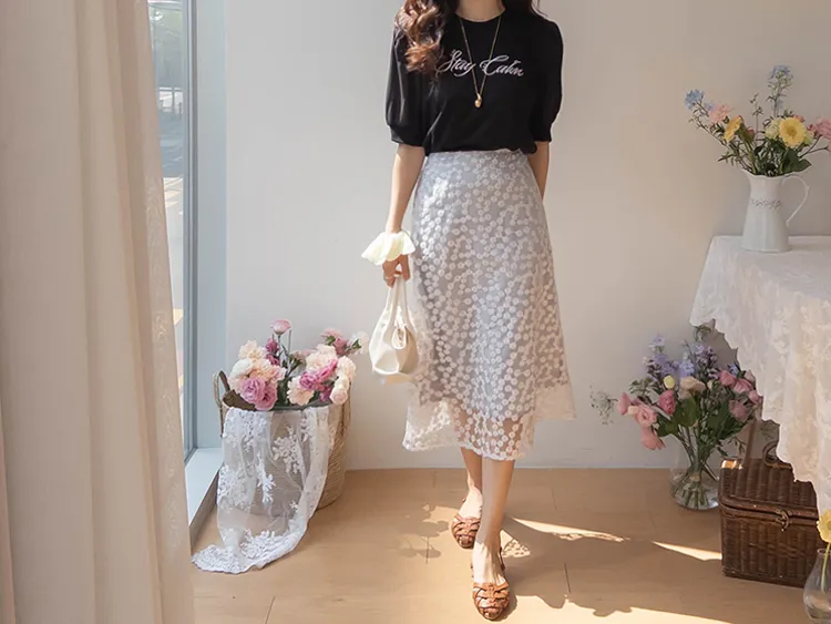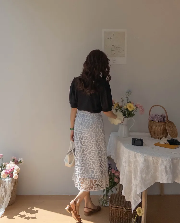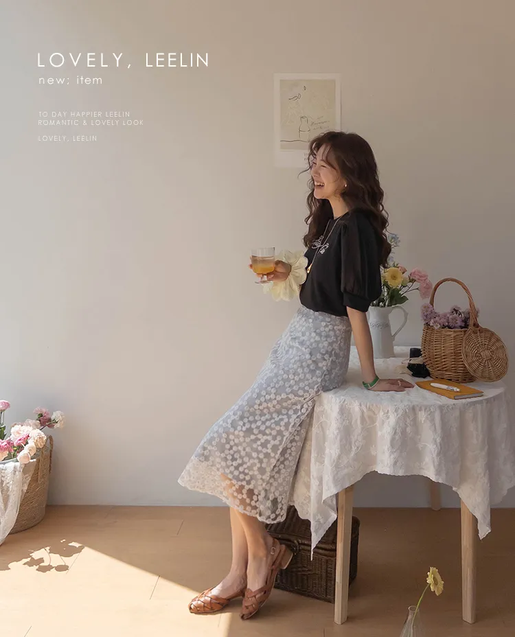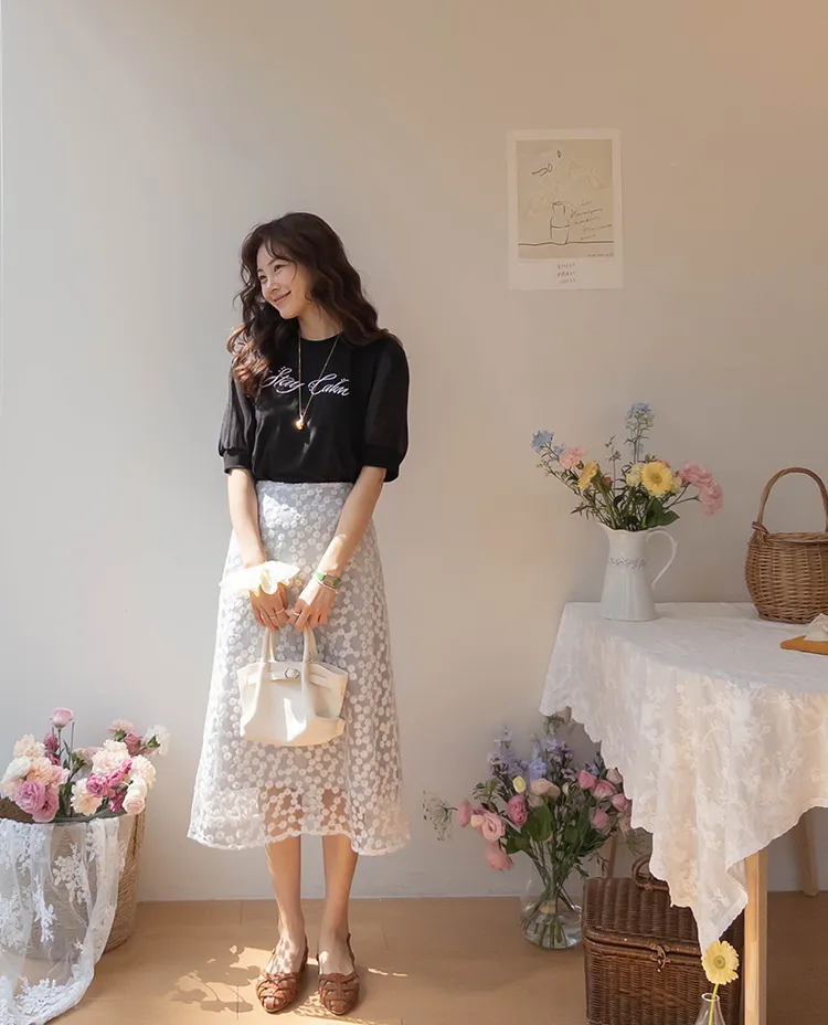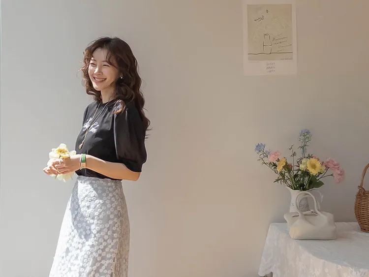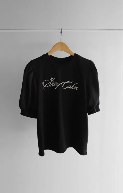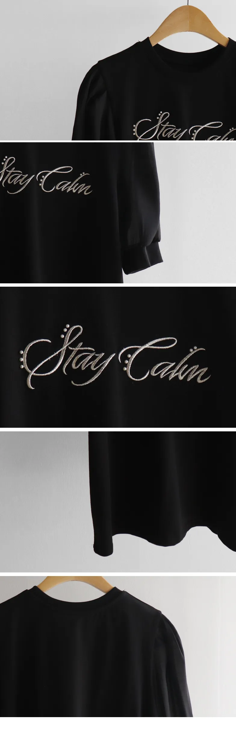 可愛透視泡泡袖輪廓點綴珍珠字母刺繡穿搭上衣