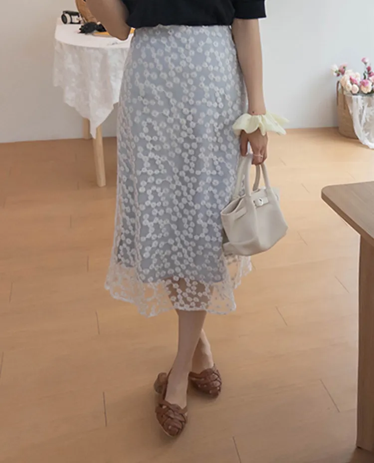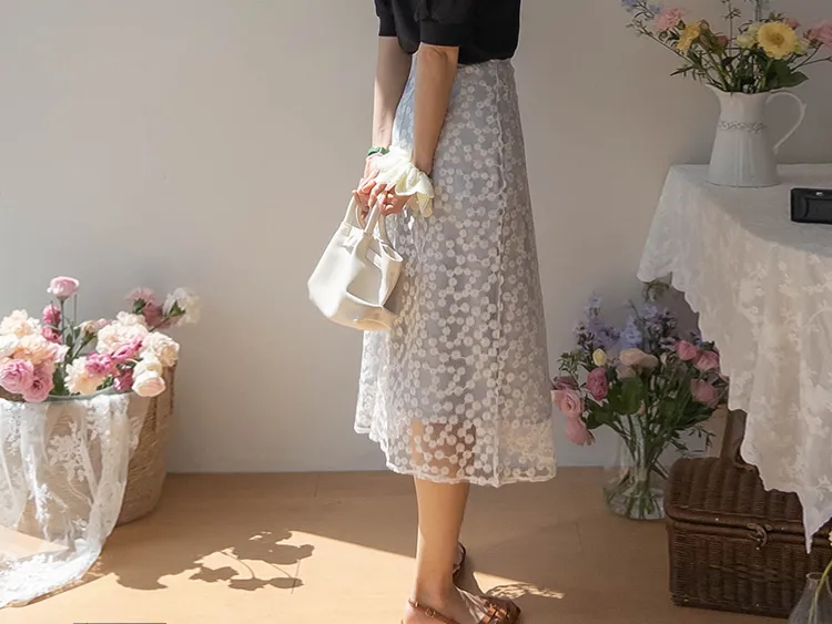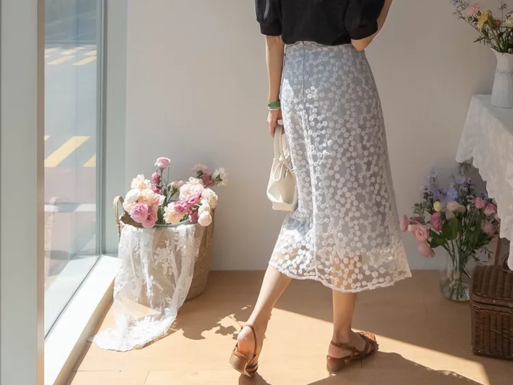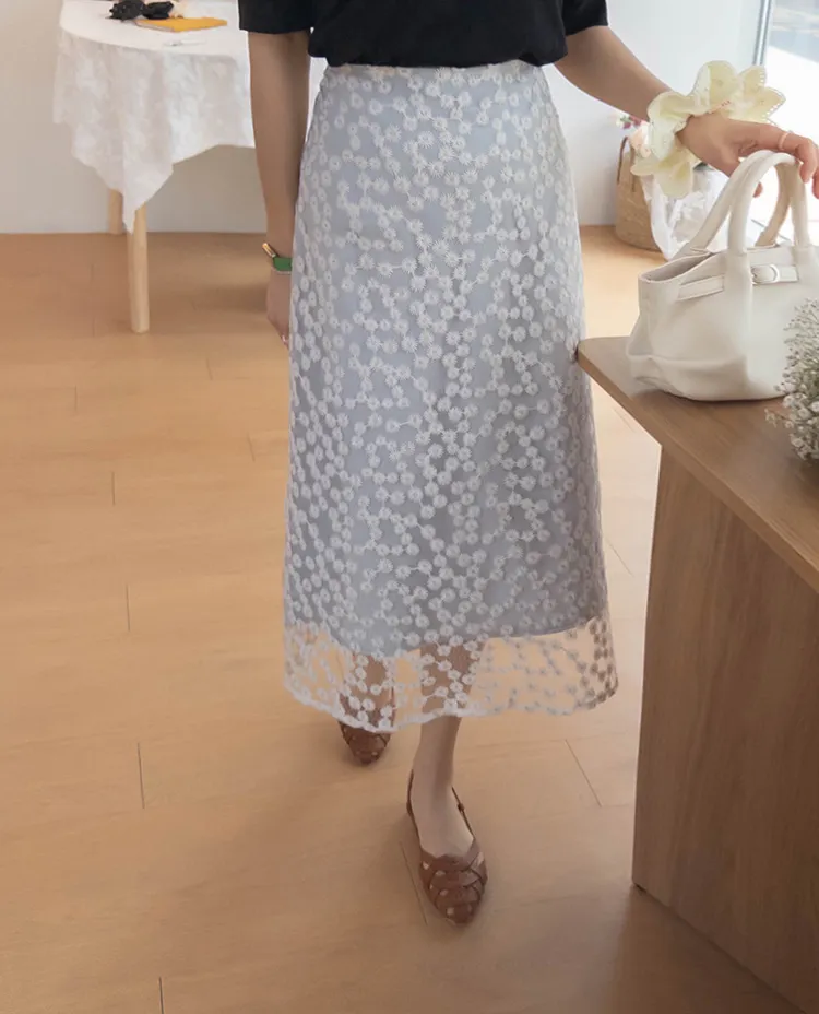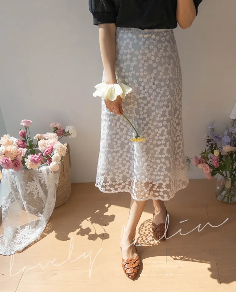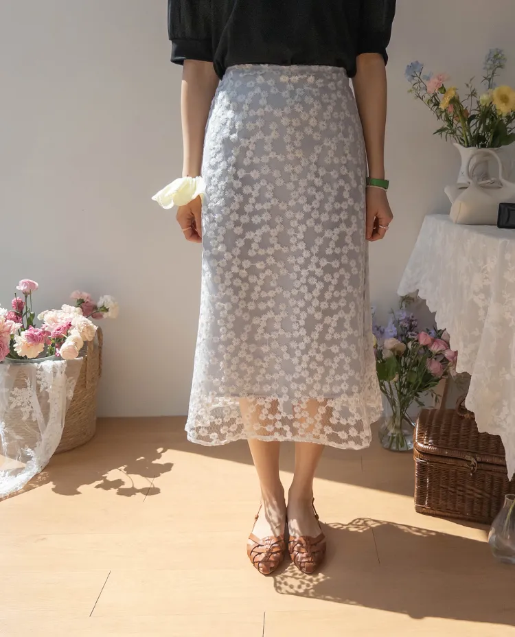 柔美雛菊花朵刺繡雙層飄逸裙擺中長裙