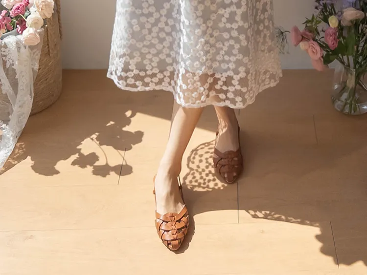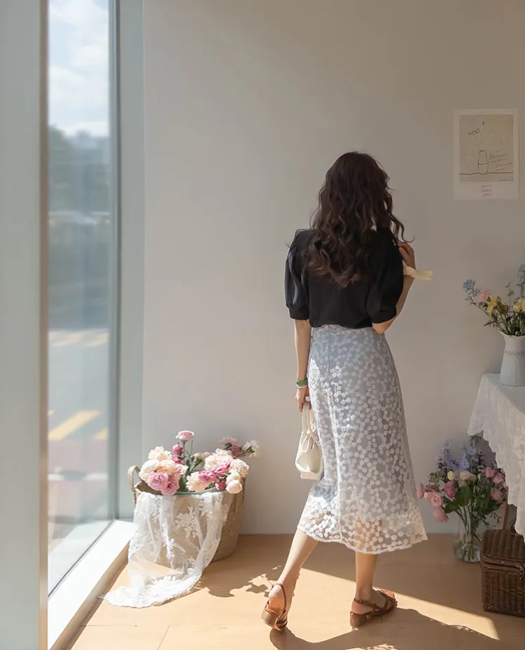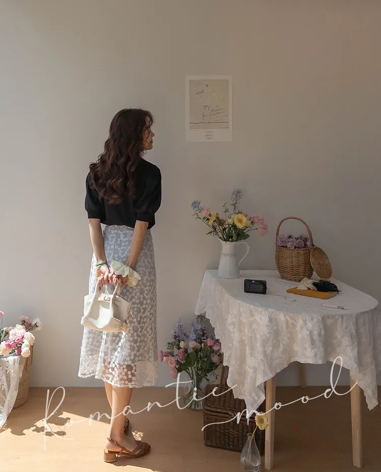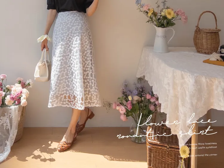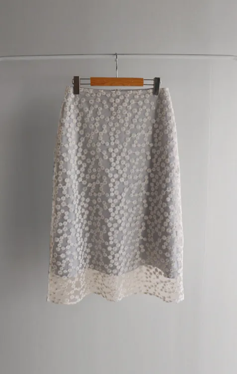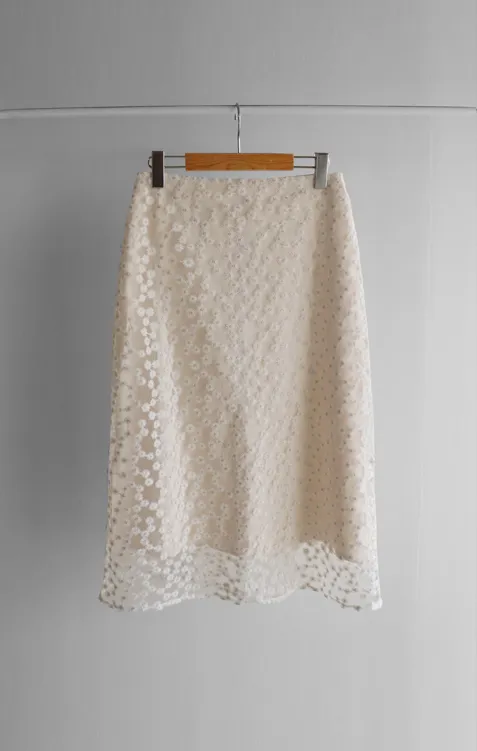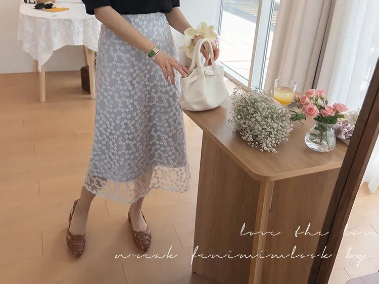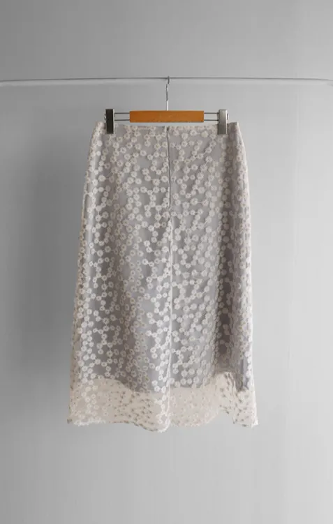 柔美雛菊花朵刺繡雙層飄逸裙擺中長裙