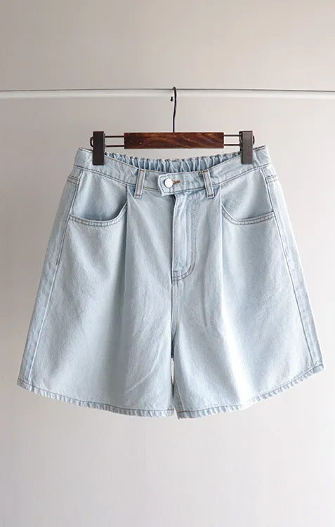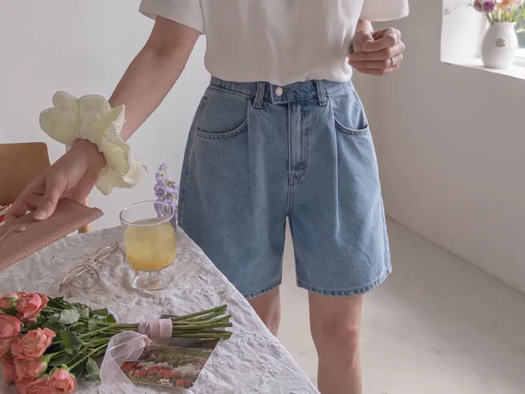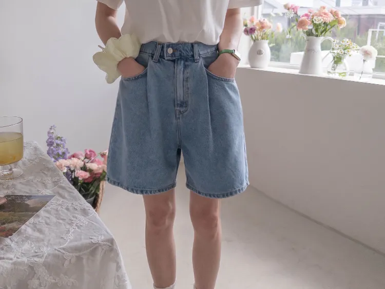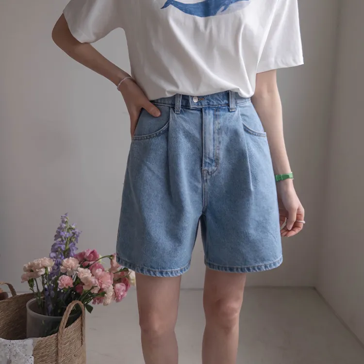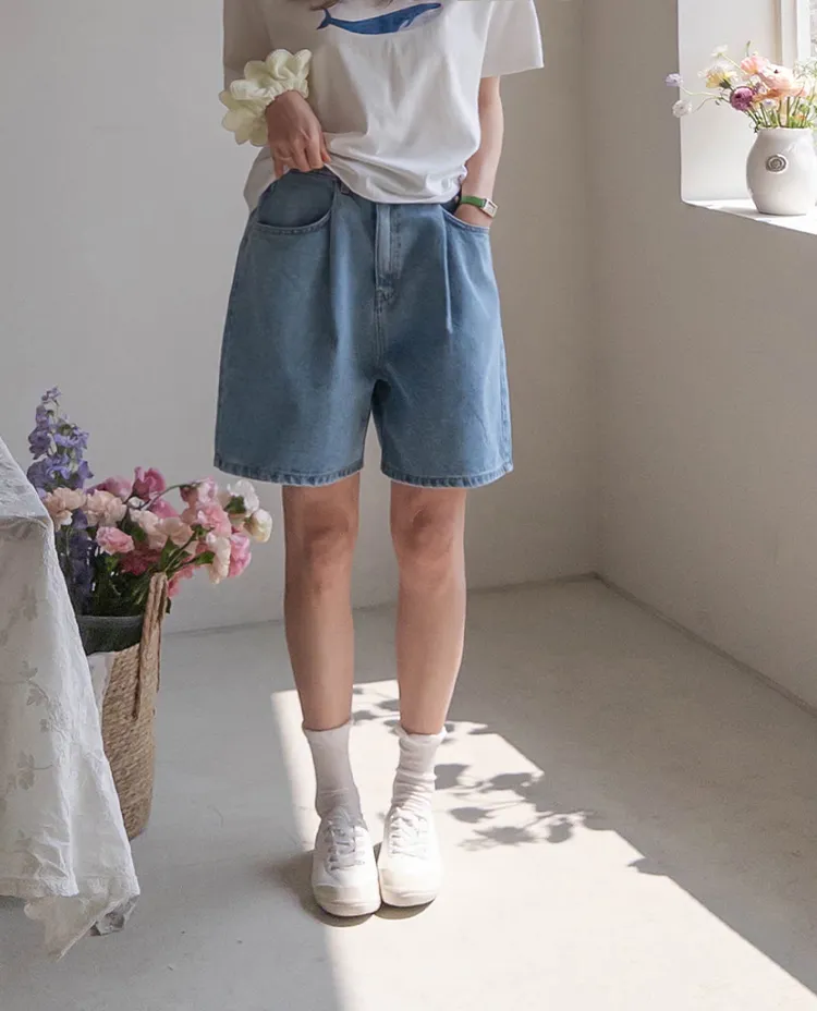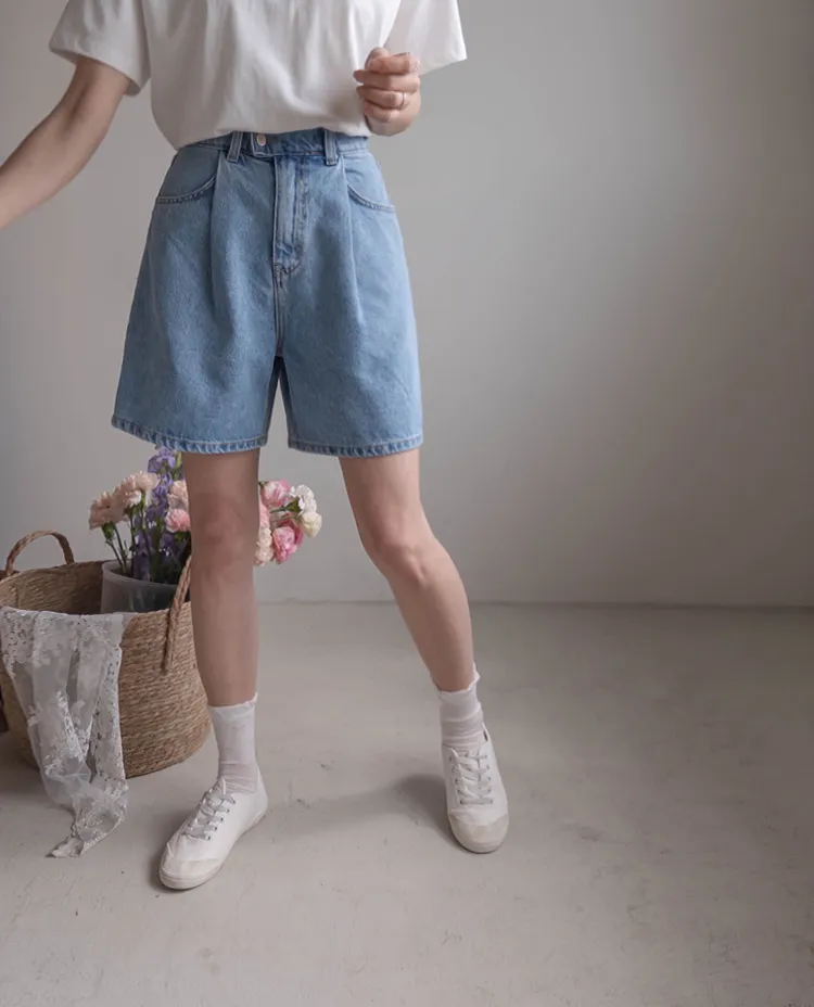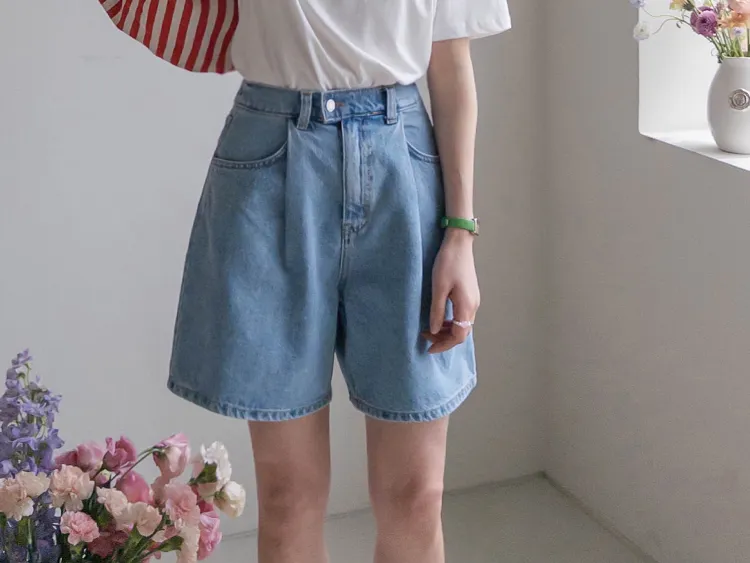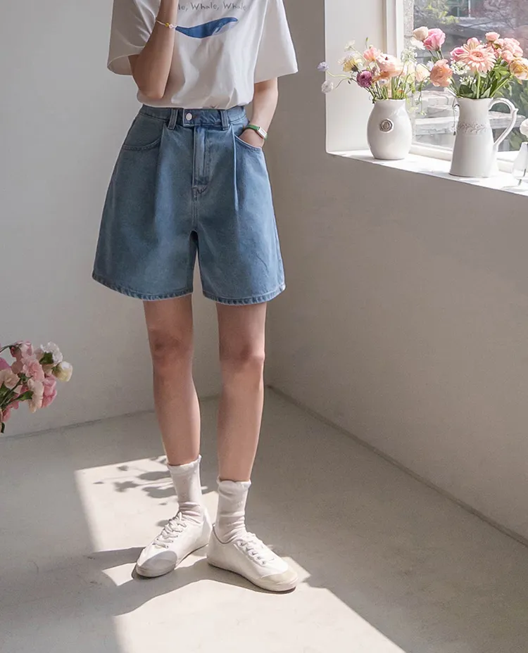 日常寬版修身點綴針摺A字剪裁牛仔短褲