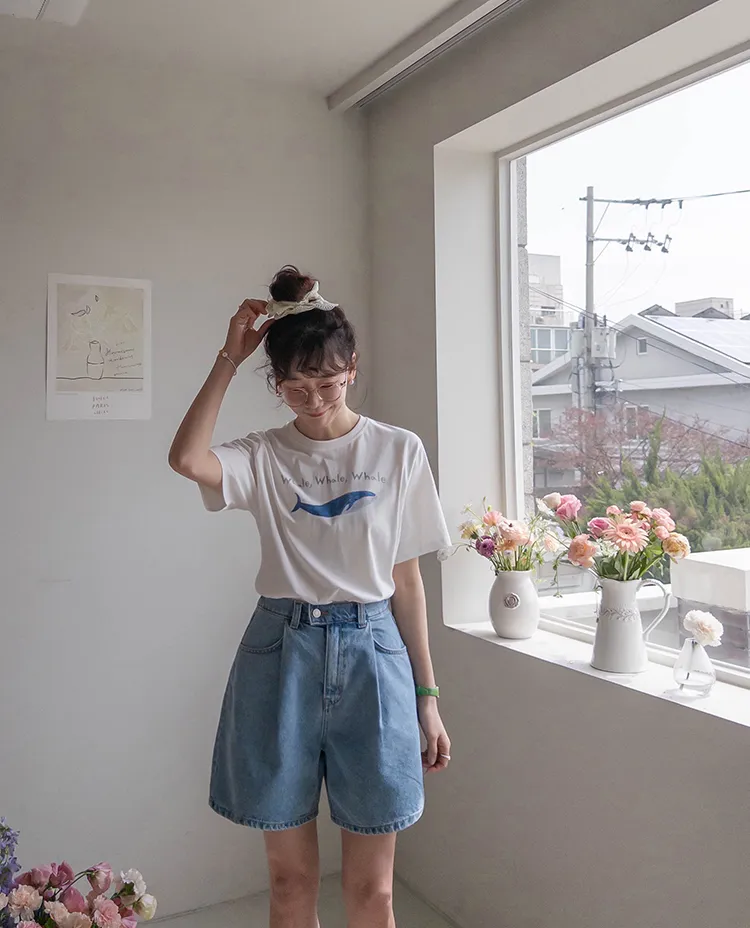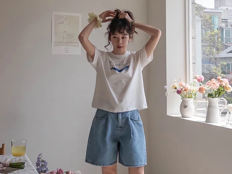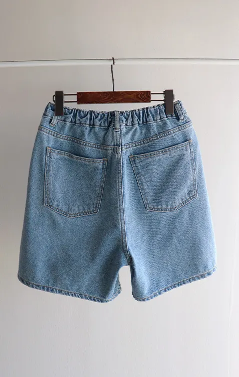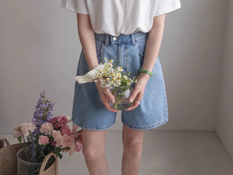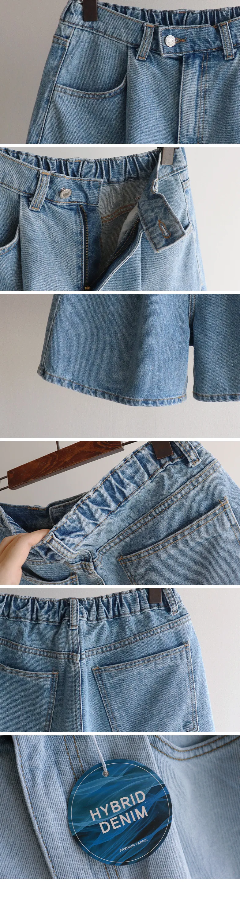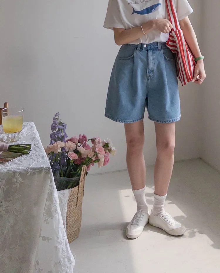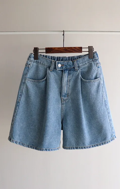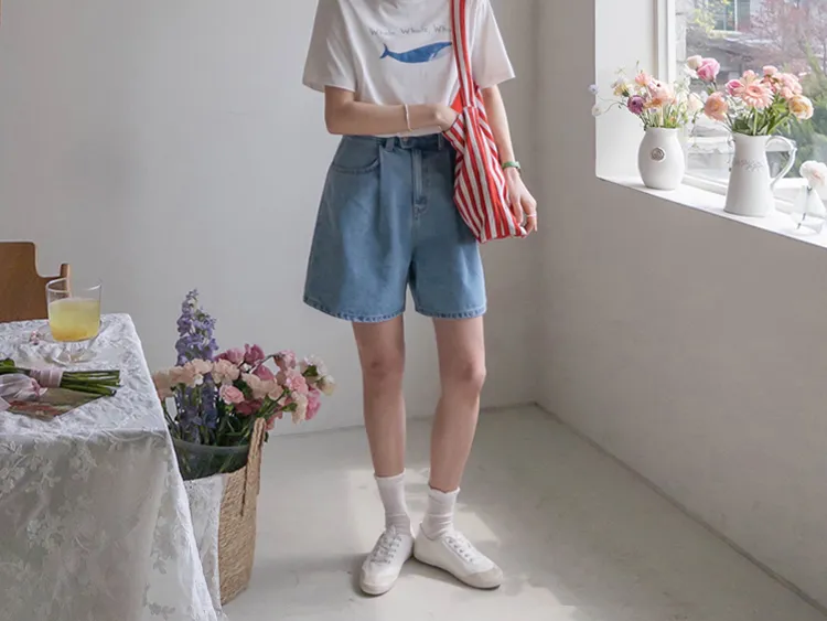 日常寬版修身點綴針摺A字剪裁牛仔短褲