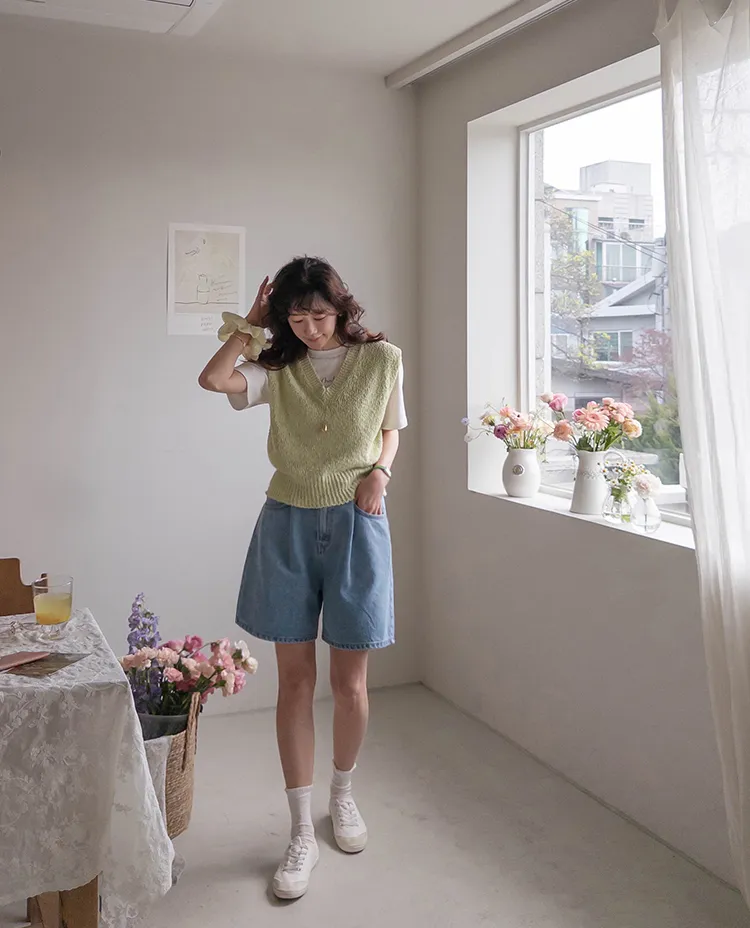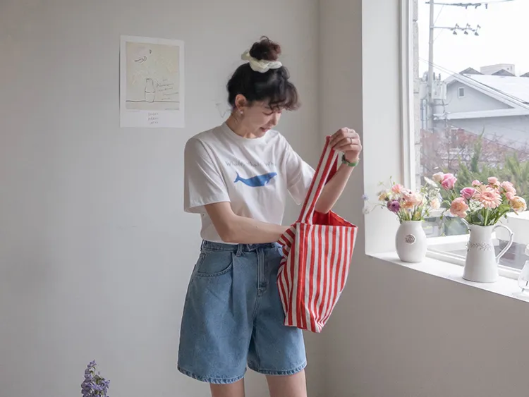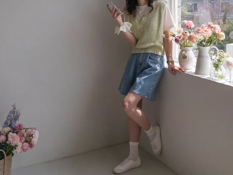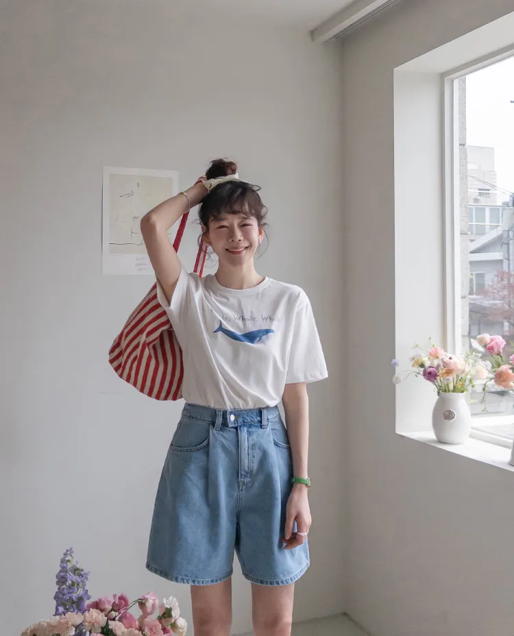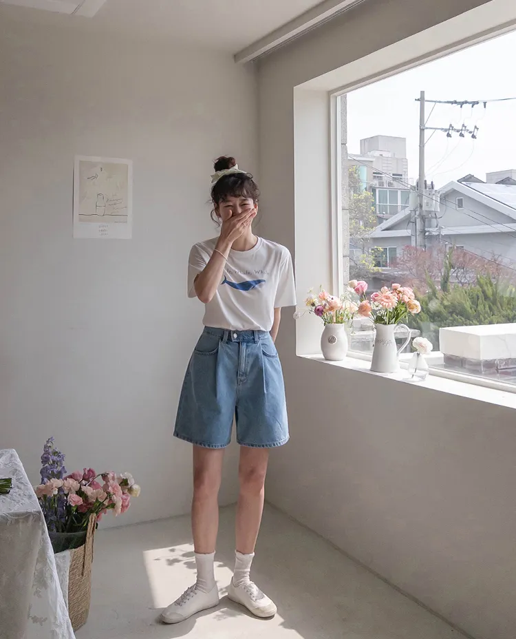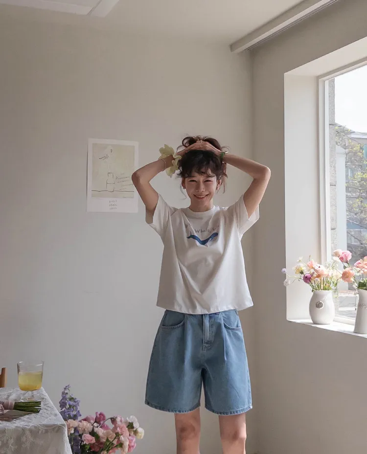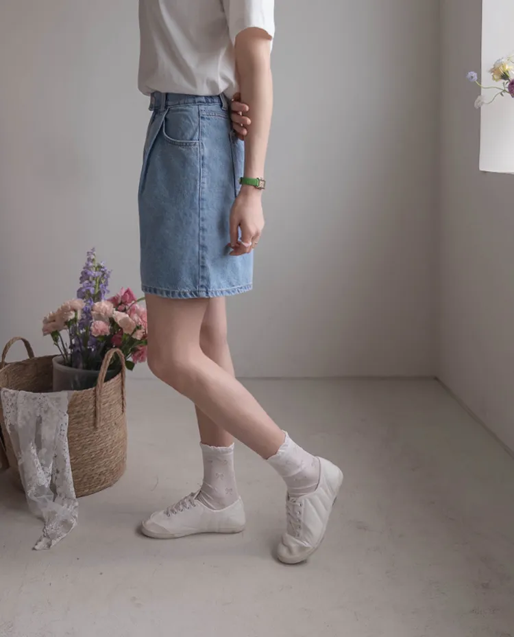 日常寬版修身點綴針摺A字剪裁牛仔短褲