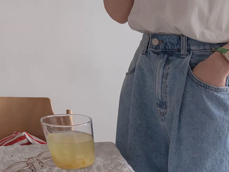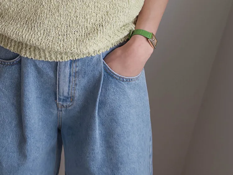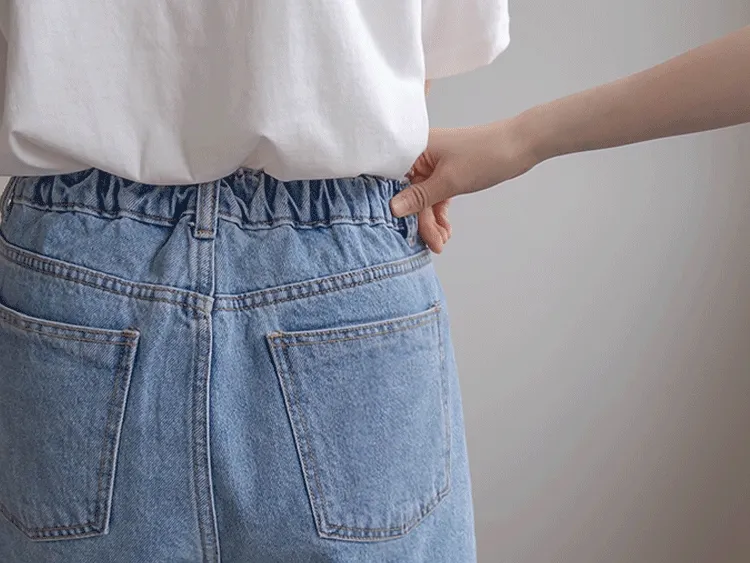 【輕鬆日常的半長牛仔褲】【針摺設計,更顯腿長! 】【腰部有紐帶點】【寬鬆版型,修飾線條! 】