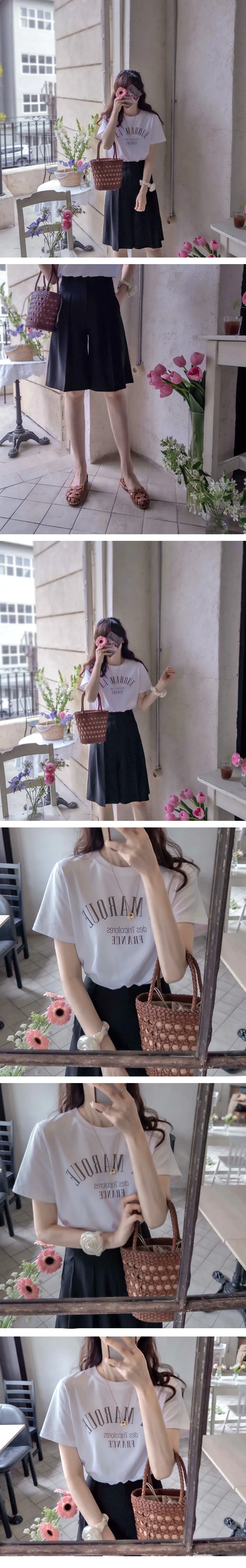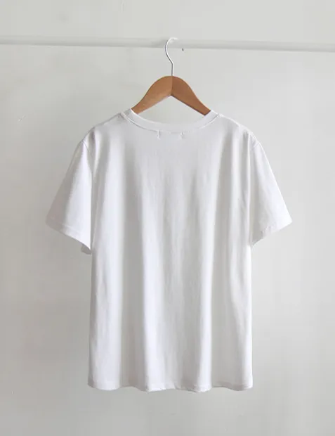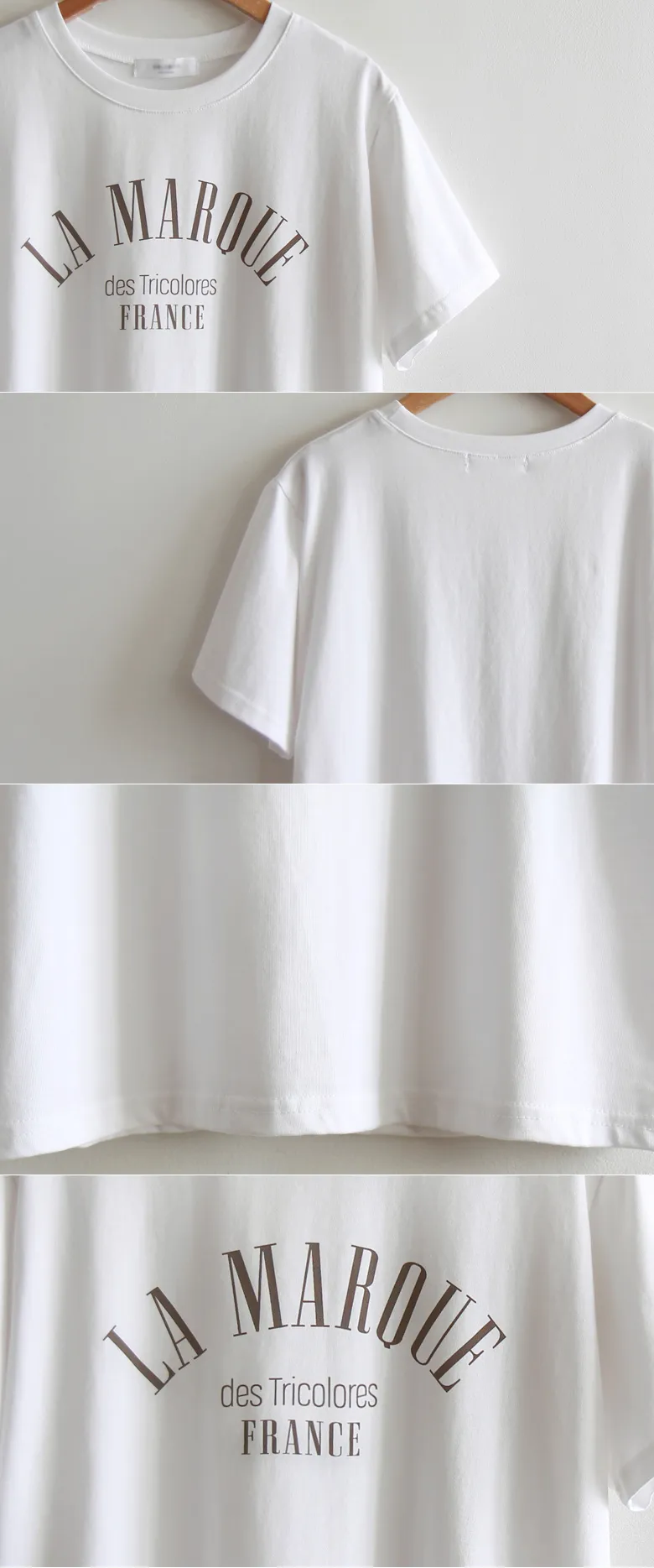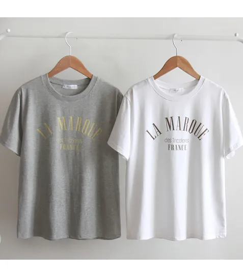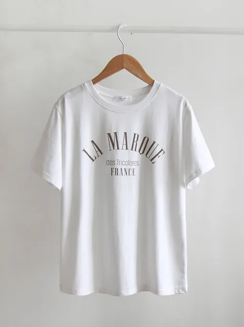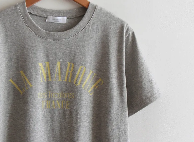 【堅韌柔軟的布料】 【95%棉、5%氨綸,穿著舒適】 【簡潔文字】 【帶有淡淡法式情調的文字】 【從日常造型到休閒造型,百搭單品】