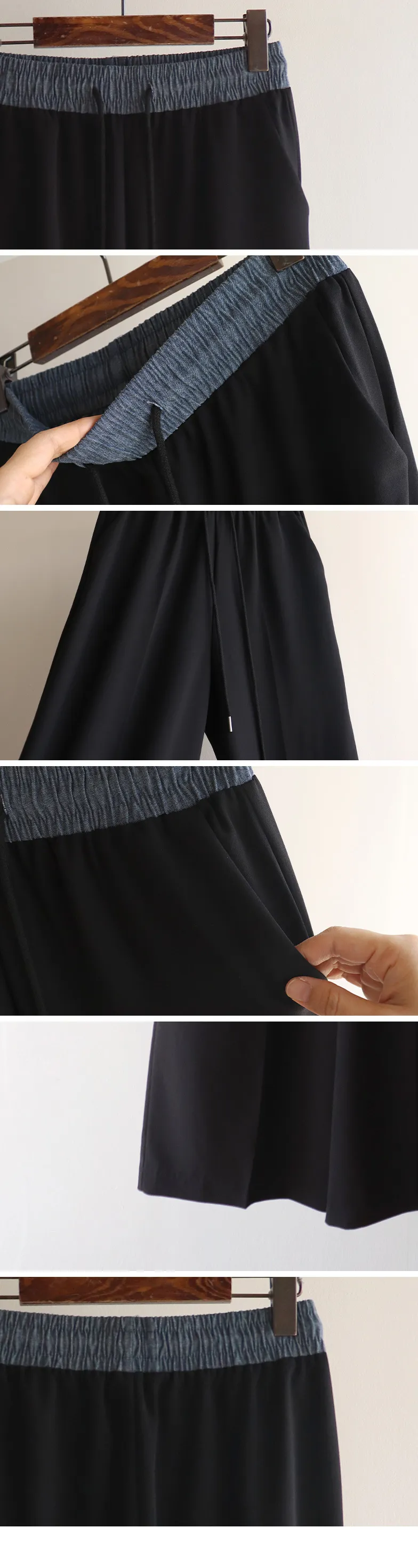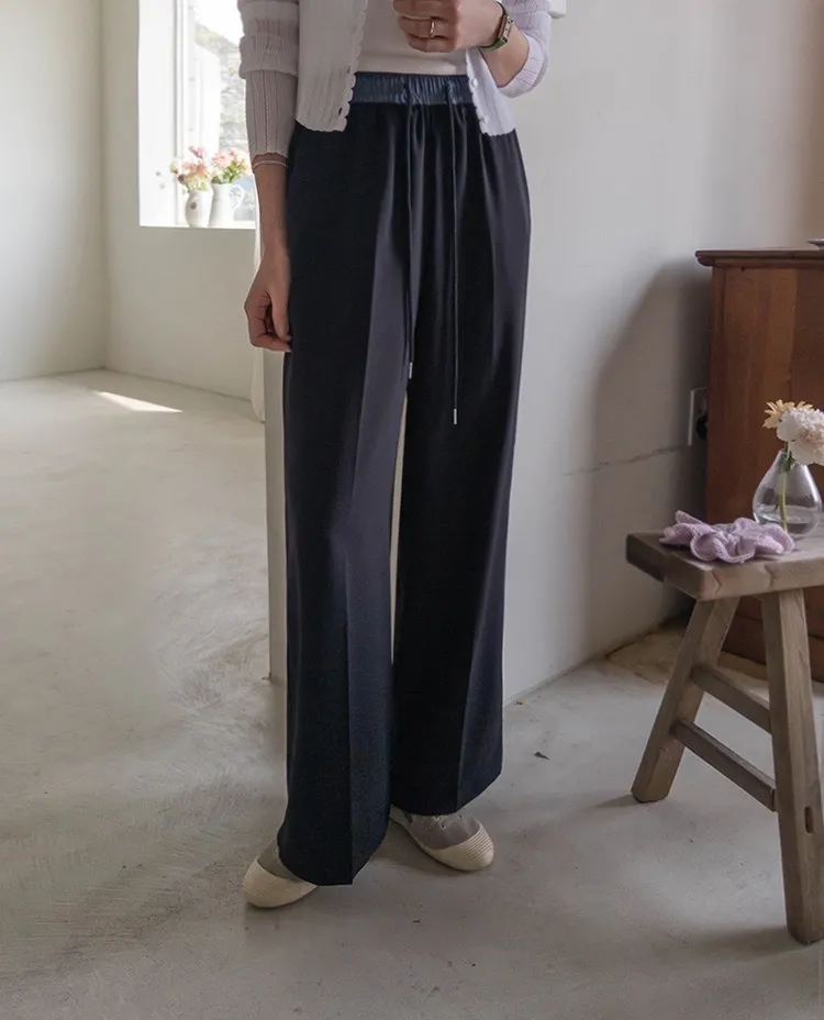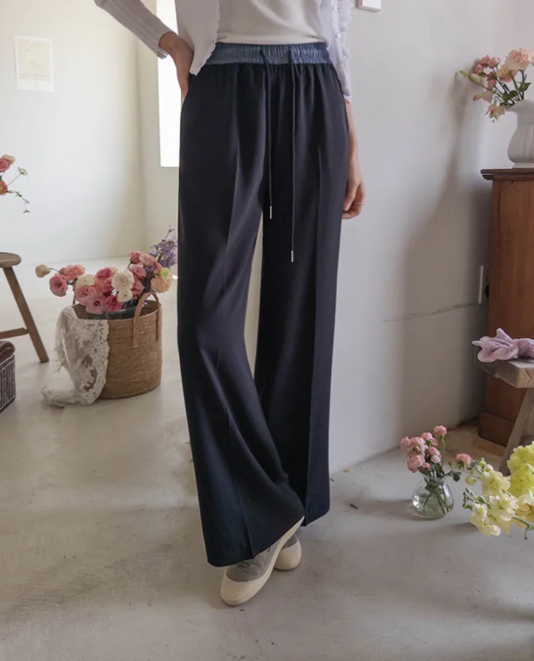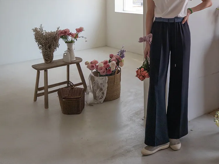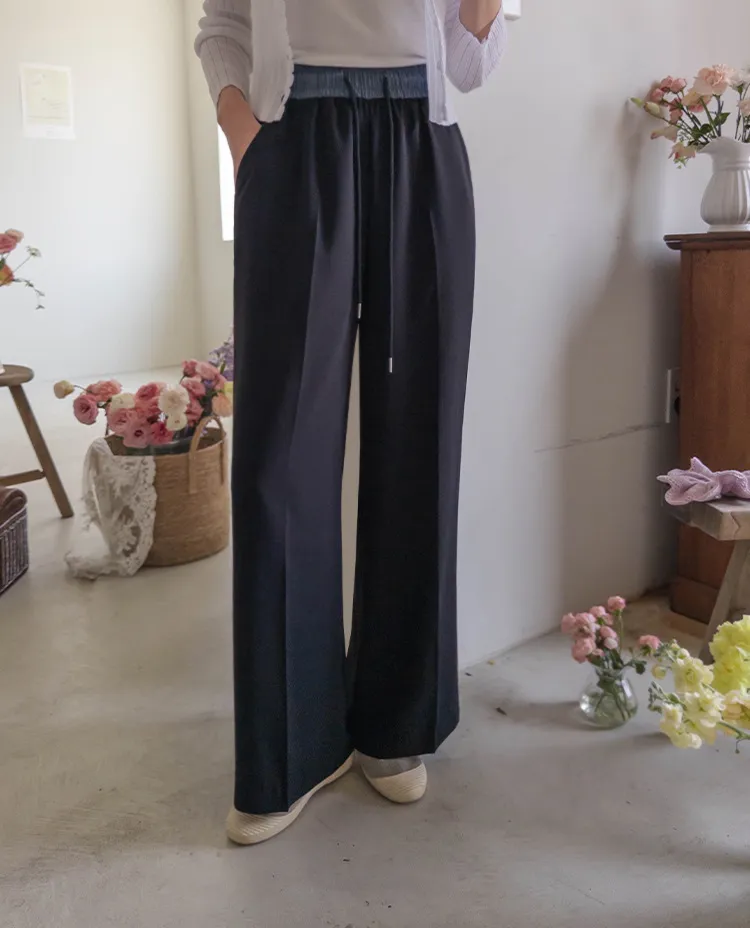 【藍色腰線的獨特風格♡】 【飄逸的布料,觸感清涼】 【全腰設計】 【時尚舒適的褲子! 】