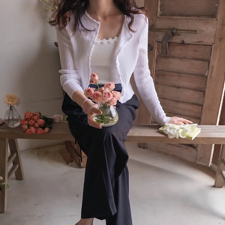 可愛心形鈕扣波浪邊領口垂直線條開衫 現貨白