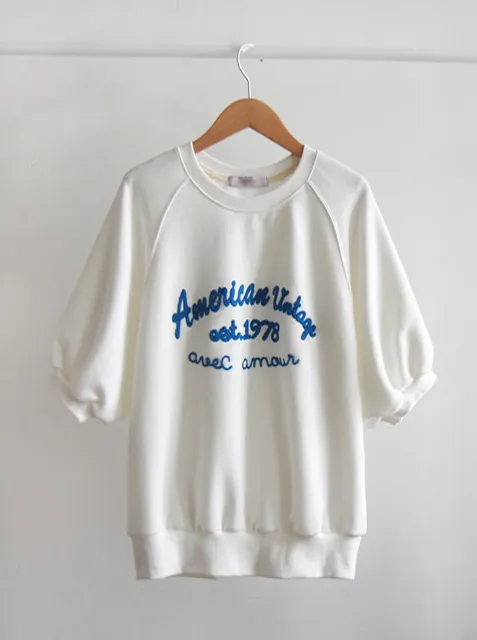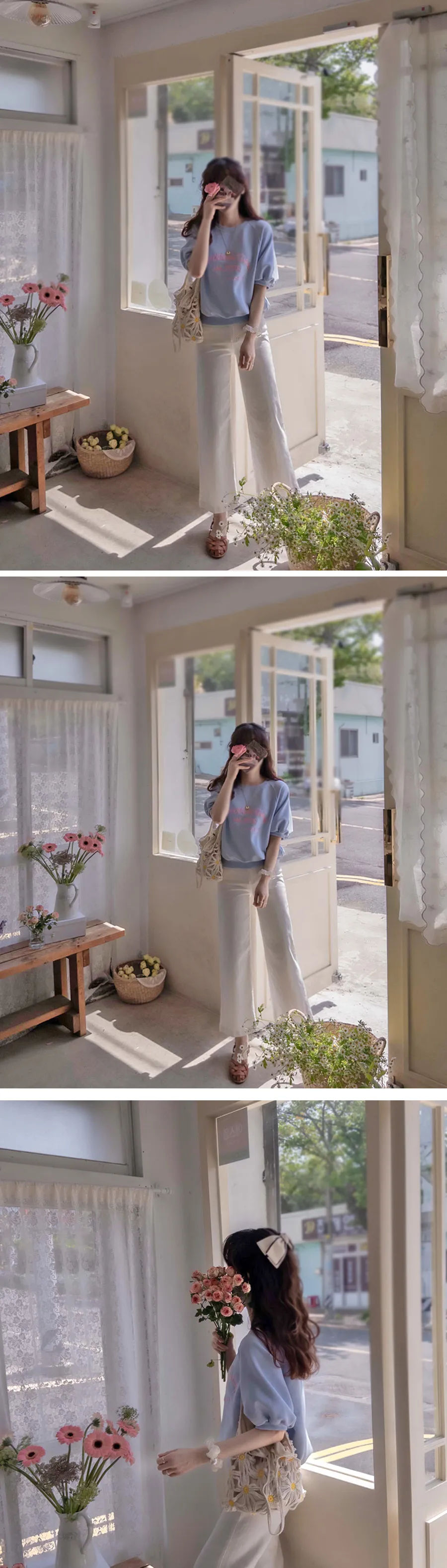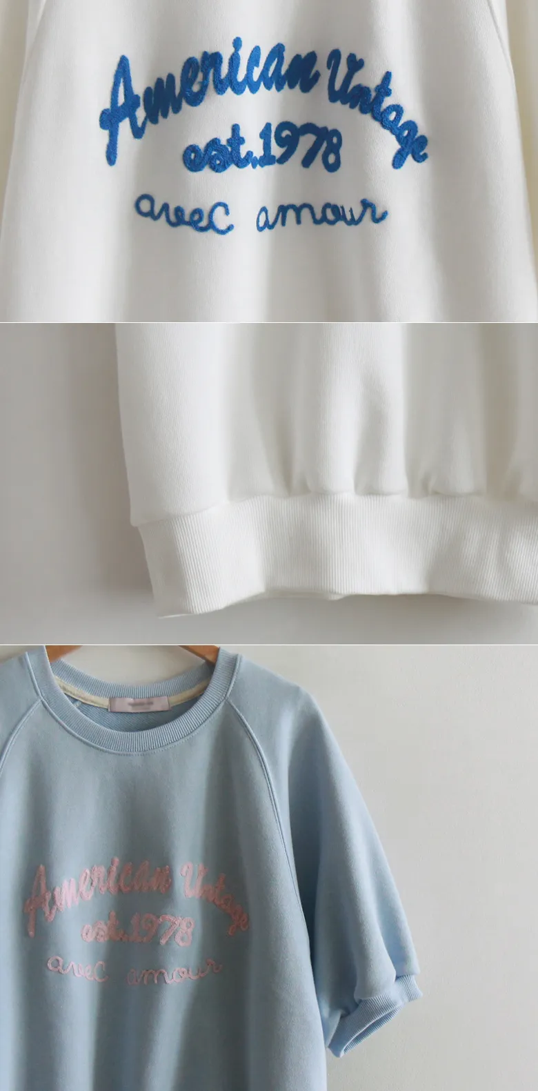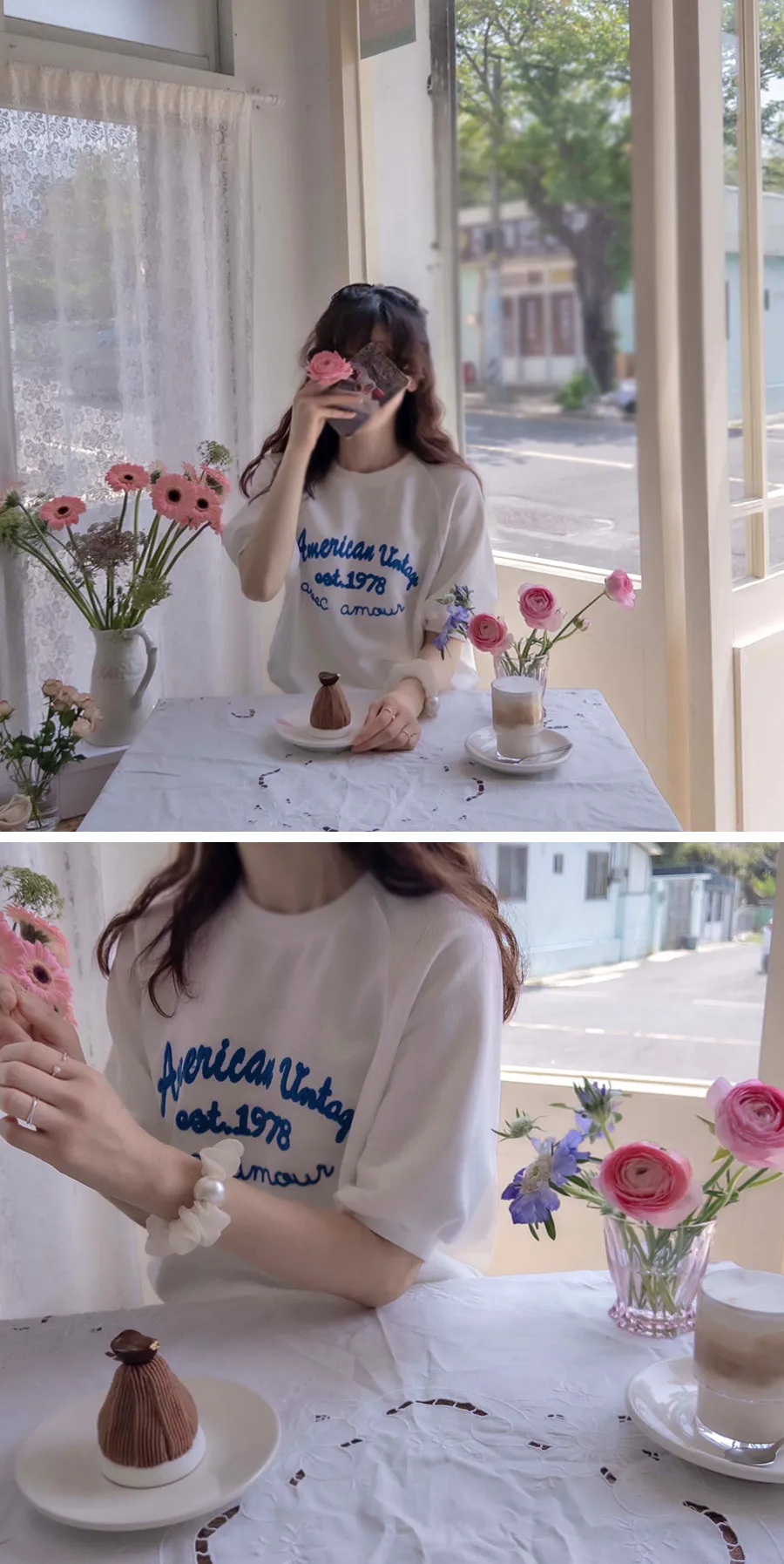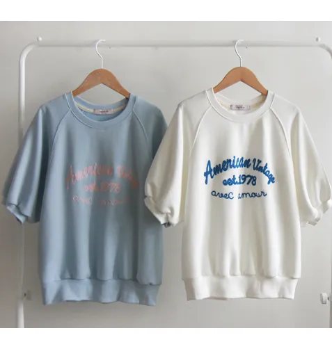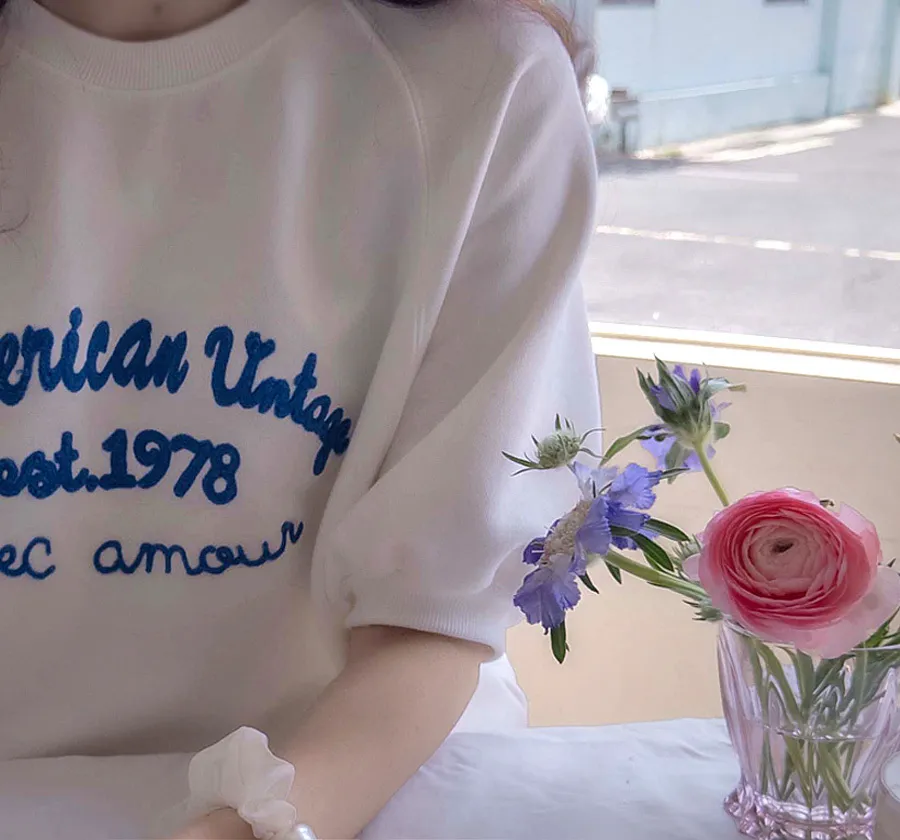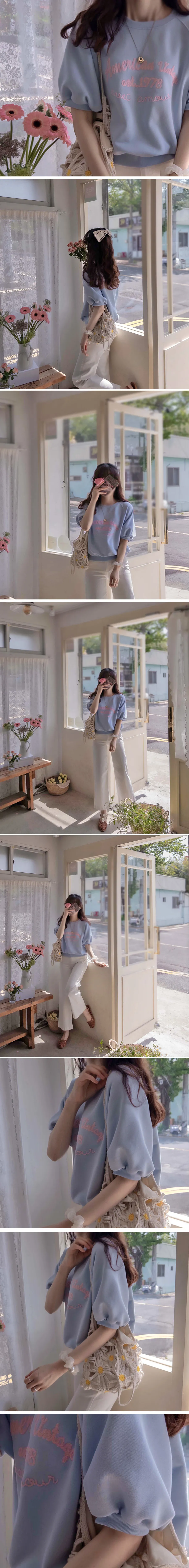 【基本款短袖穿搭上衣】 【穿著舒適】 【由字母刺繡點綴】 【袖口的褶襉也很漂亮】 【可愛又時尚,明亮的版型】 【舒適時尚感,易於搭配的上衣】