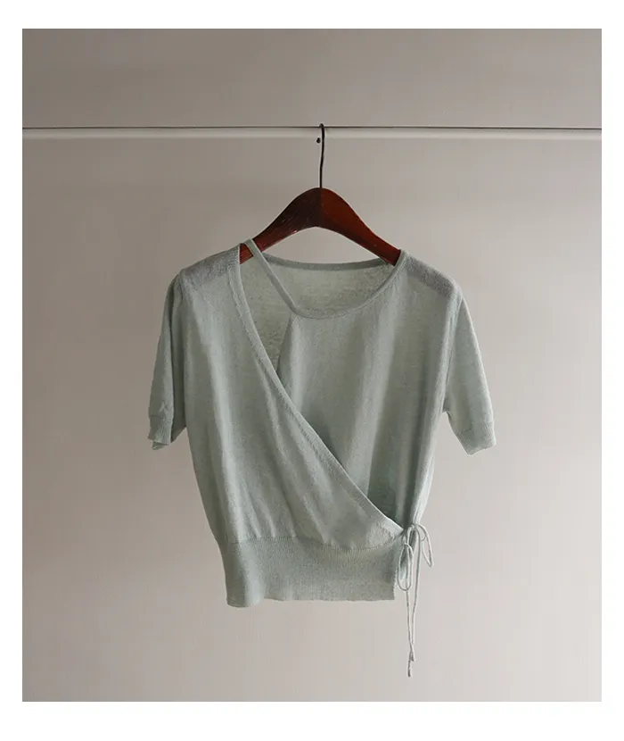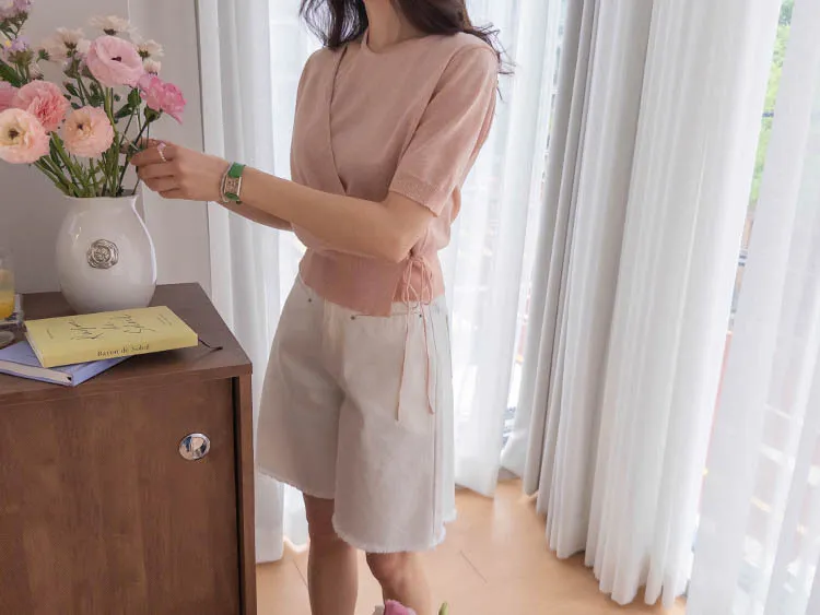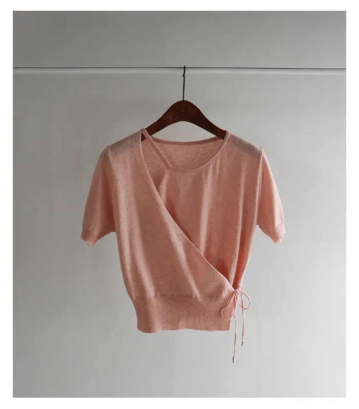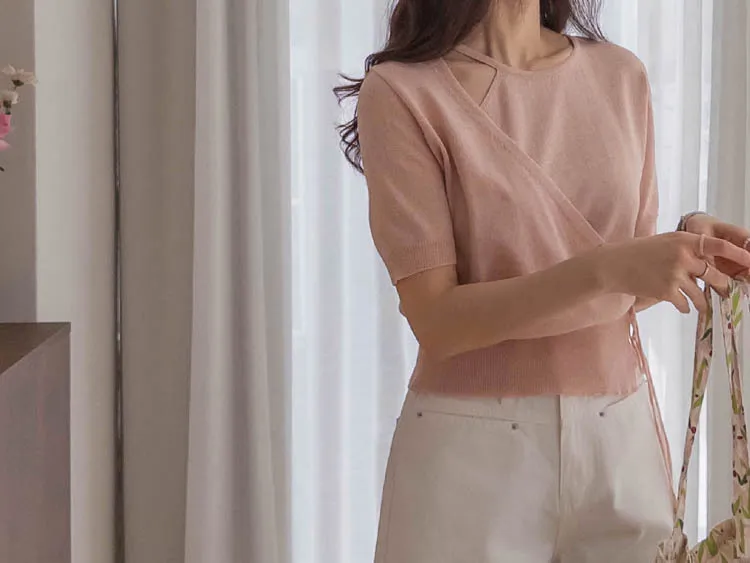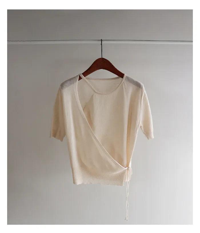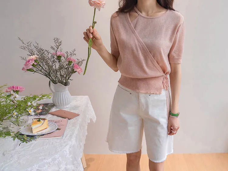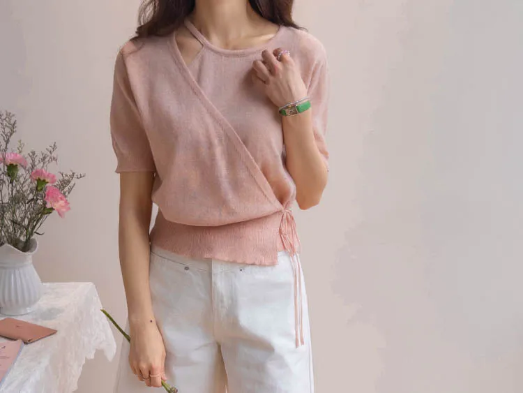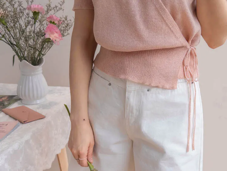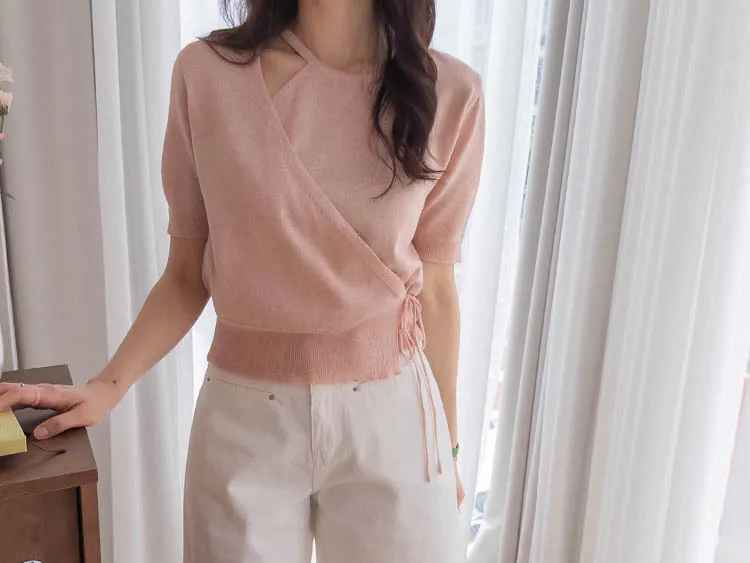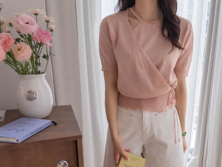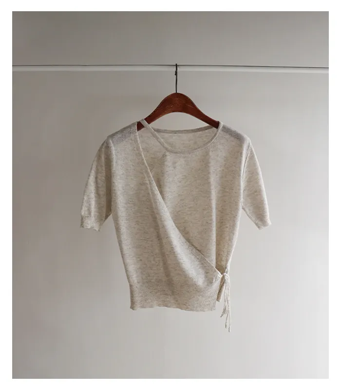 柔美肩線不對稱裹身側綁帶短袖針織上衣
