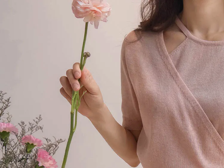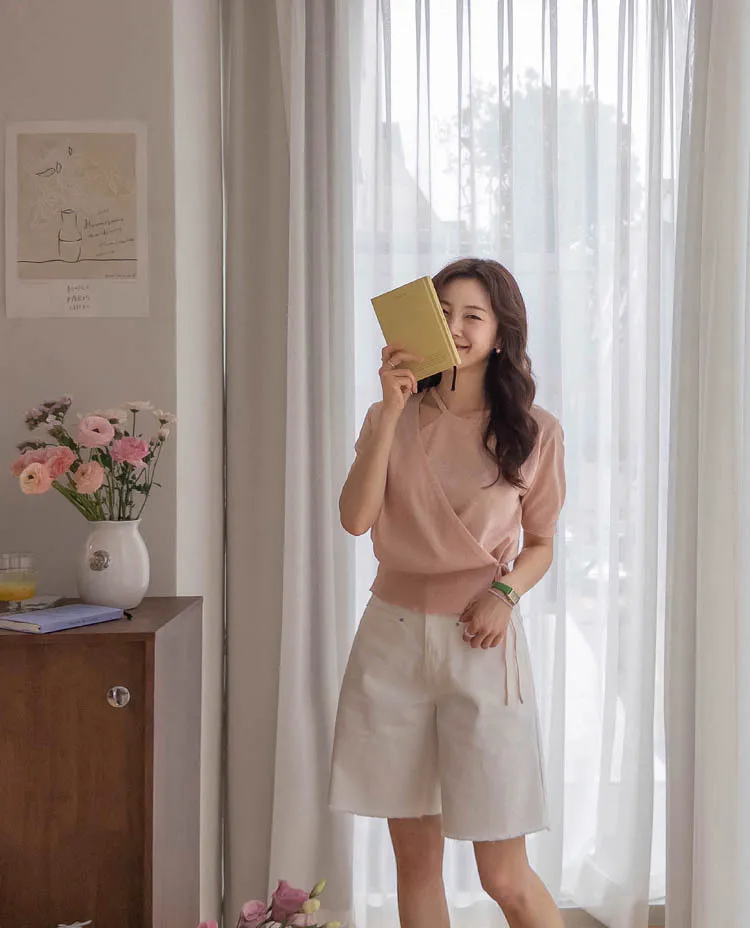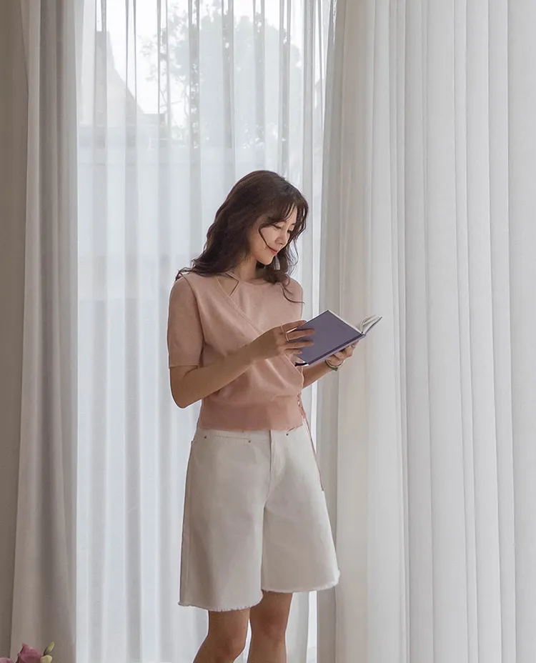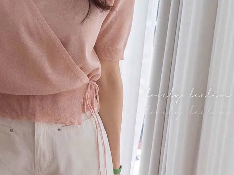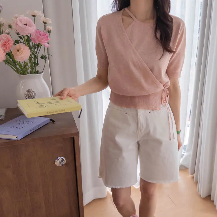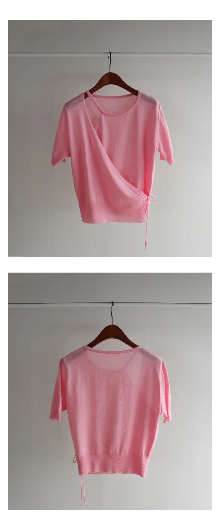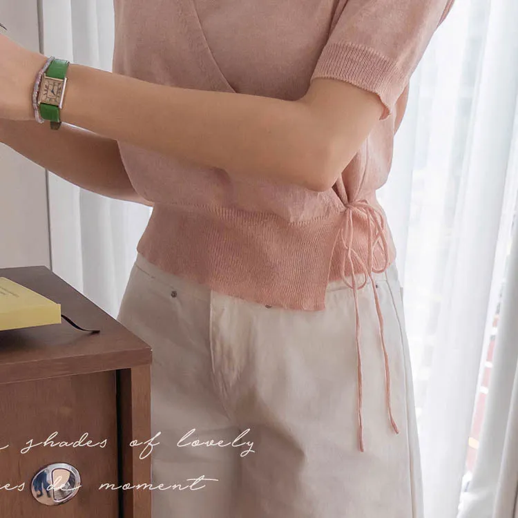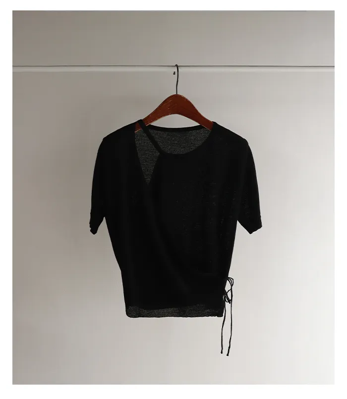 柔美肩線不對稱裹身側綁帶短袖針織上衣