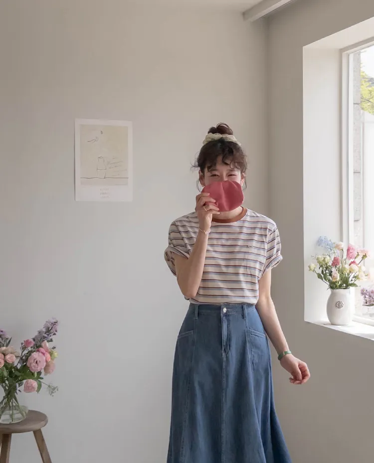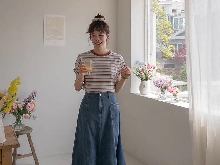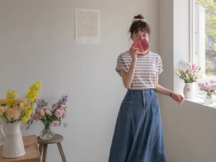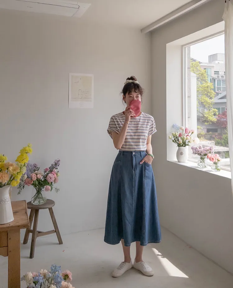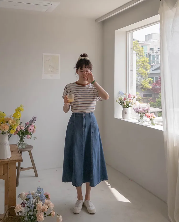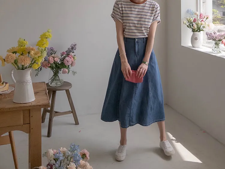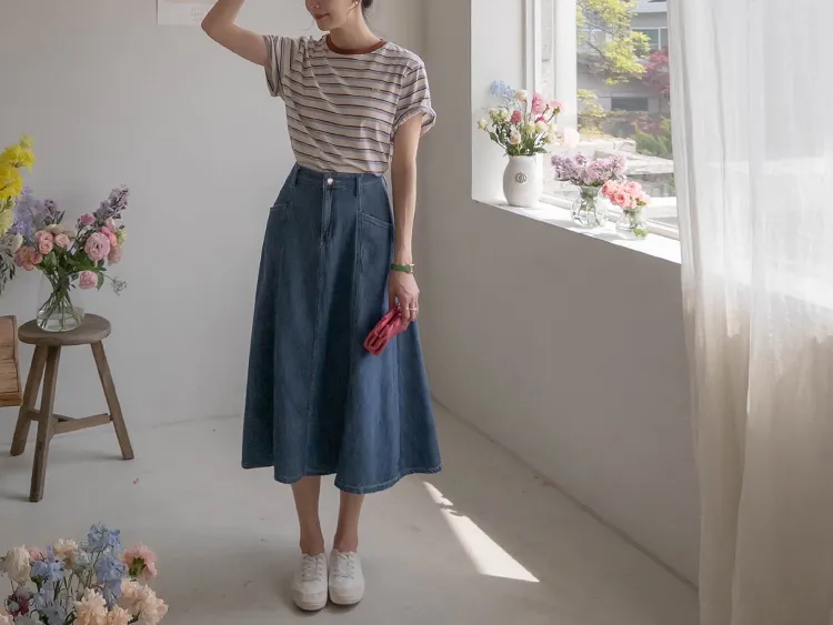 獨特斜口袋設計傘擺廓形柔軟牛仔中長裙