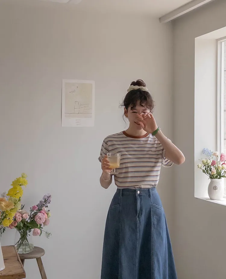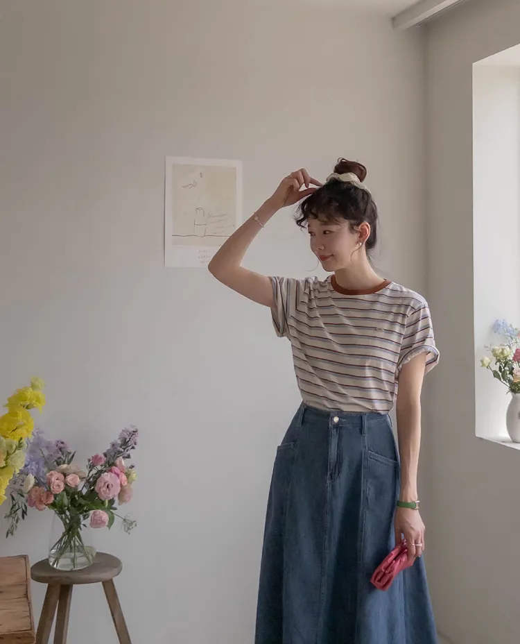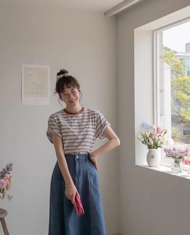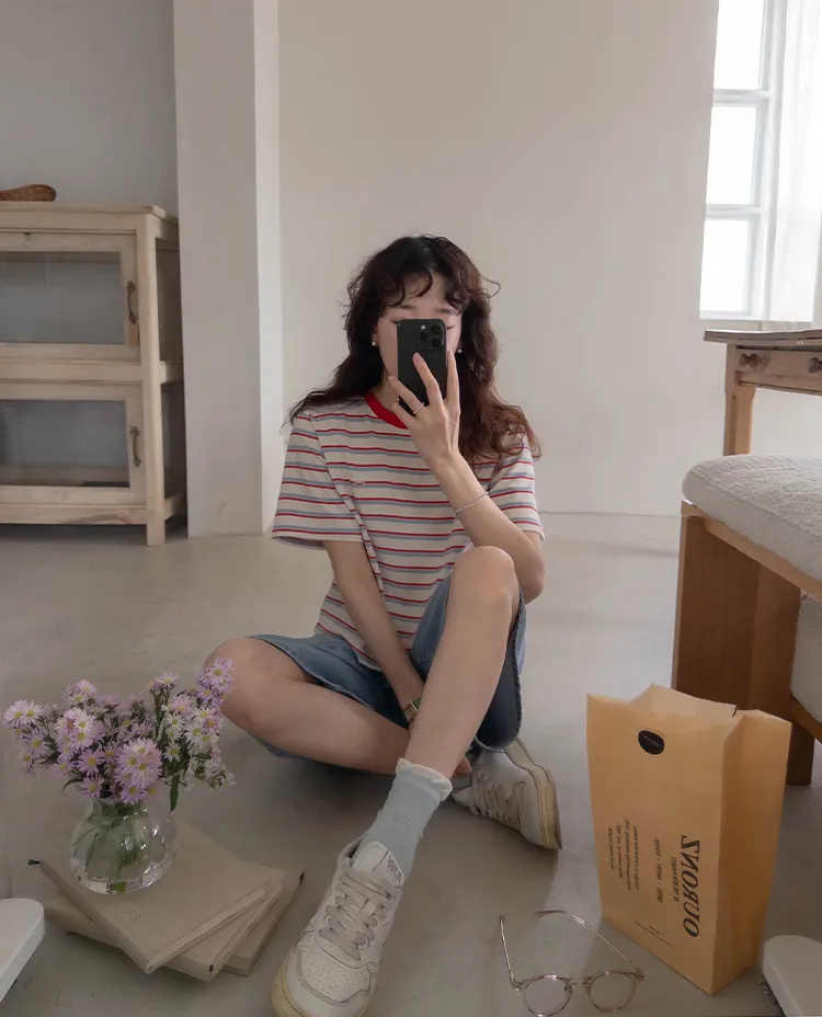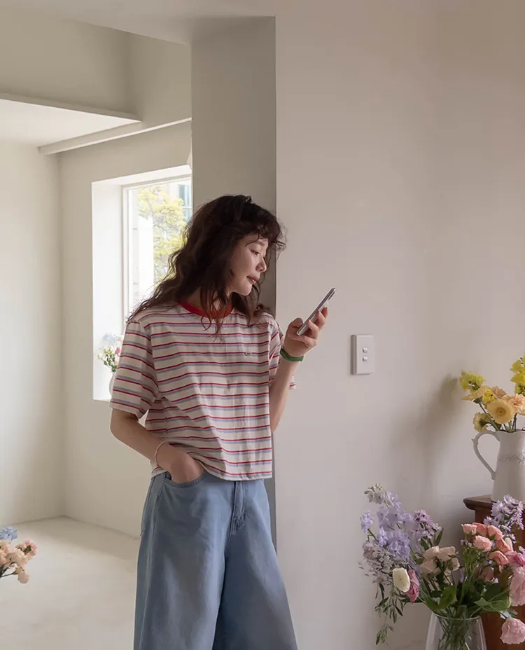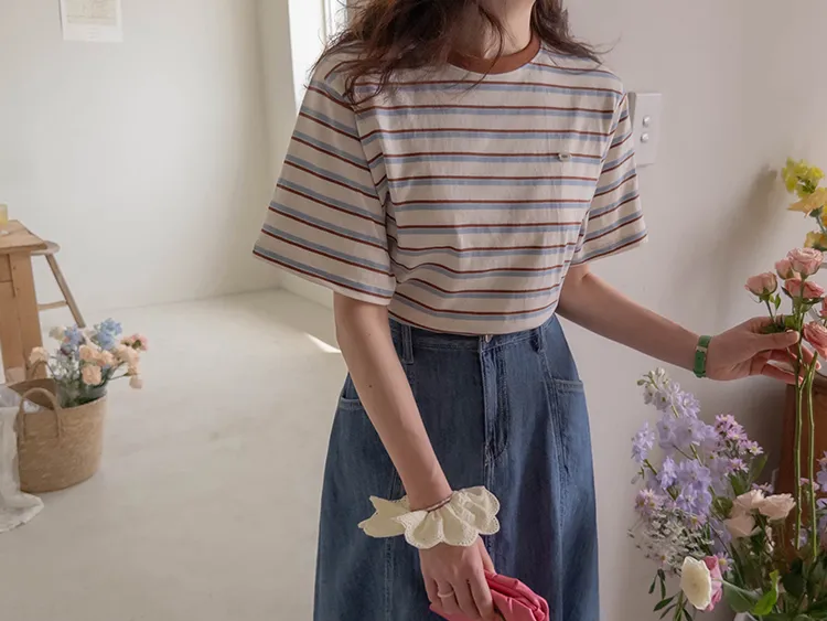 【彩色條紋很活潑♥】【一件T卹就能完成造型! 】【輕盈舒適!一直到夏天~】【迷你吊墜裝飾】