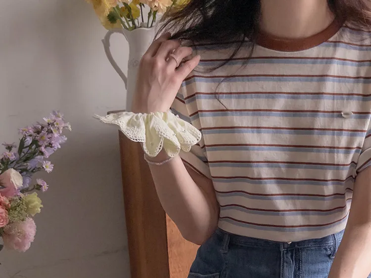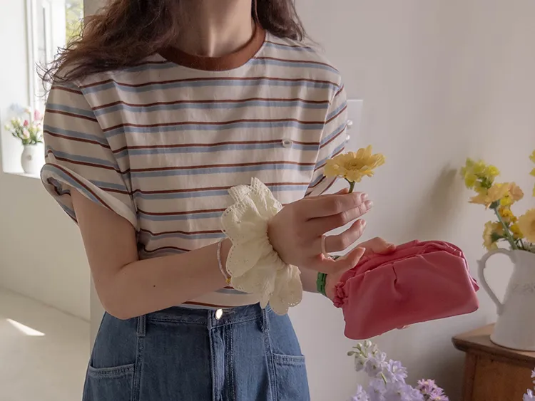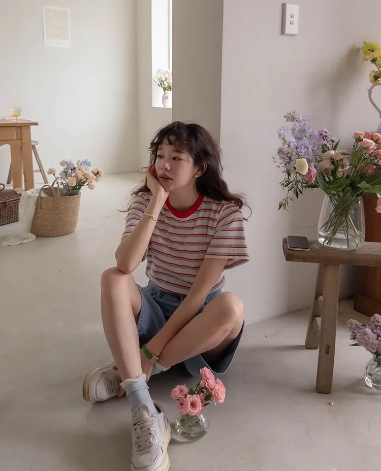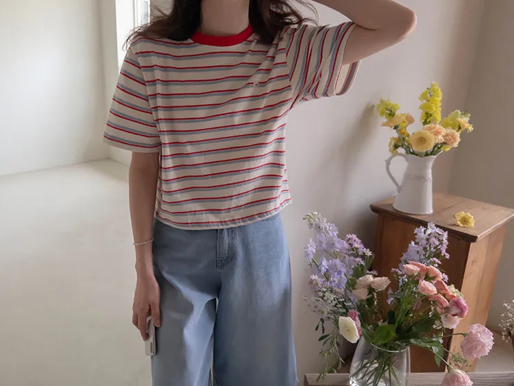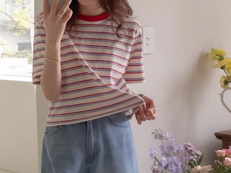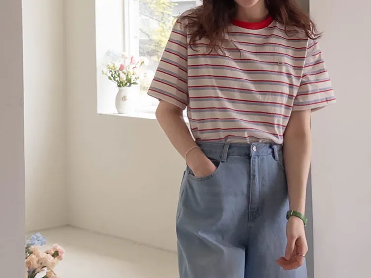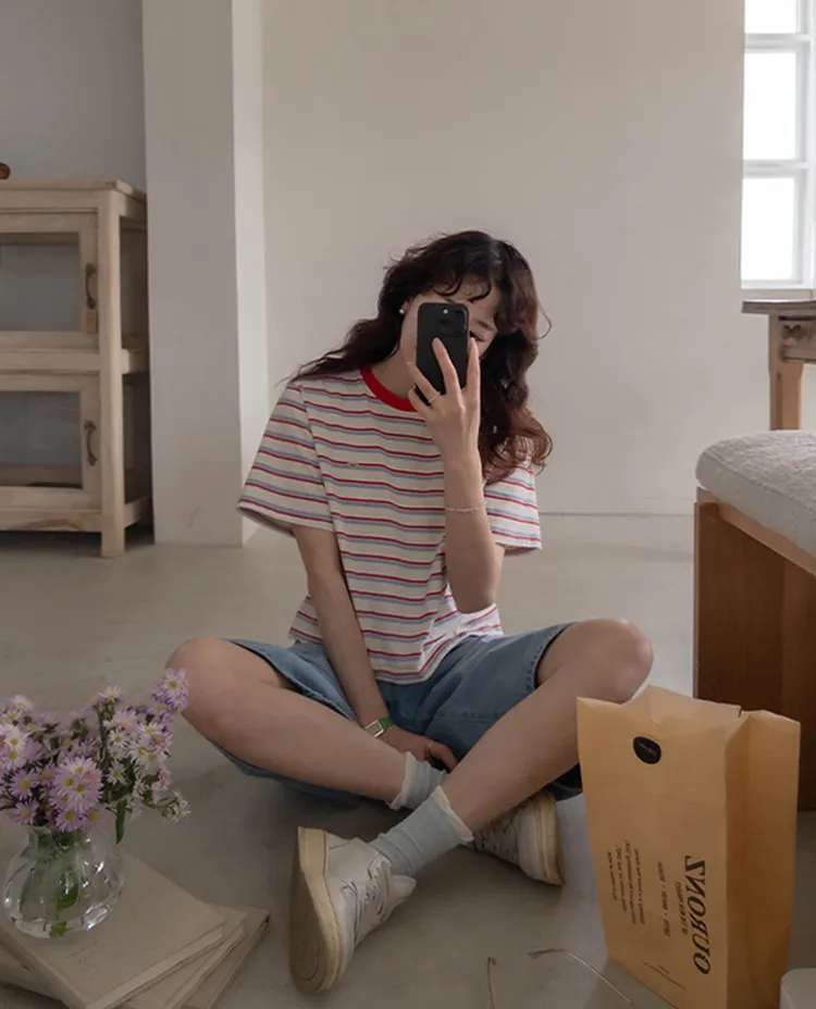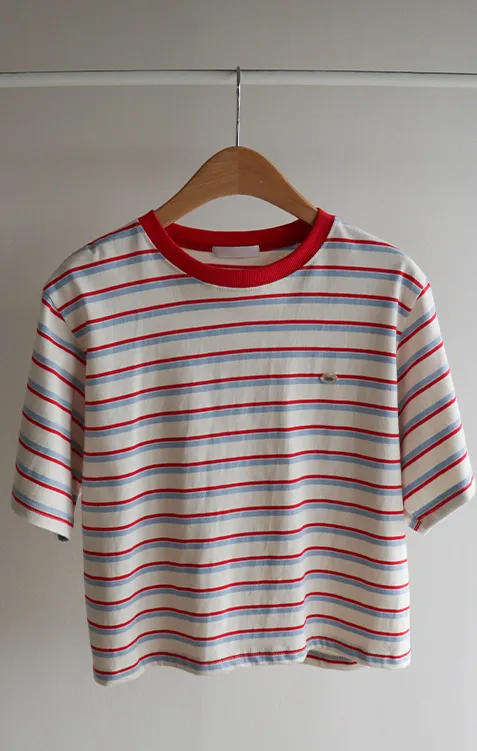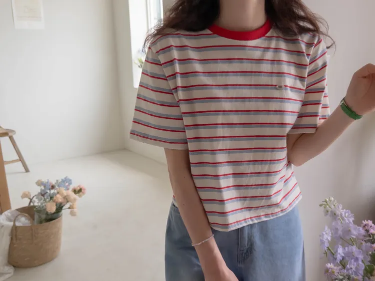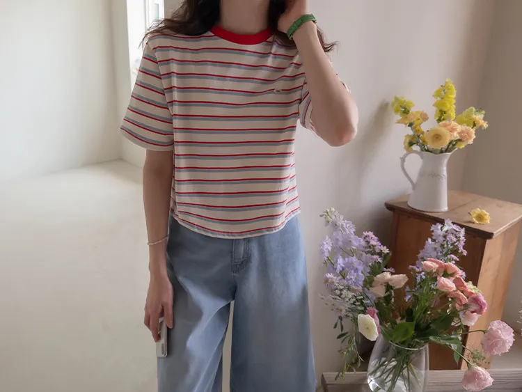 活潑色彩條紋吊墜裝飾短袖上衣 現貨紅