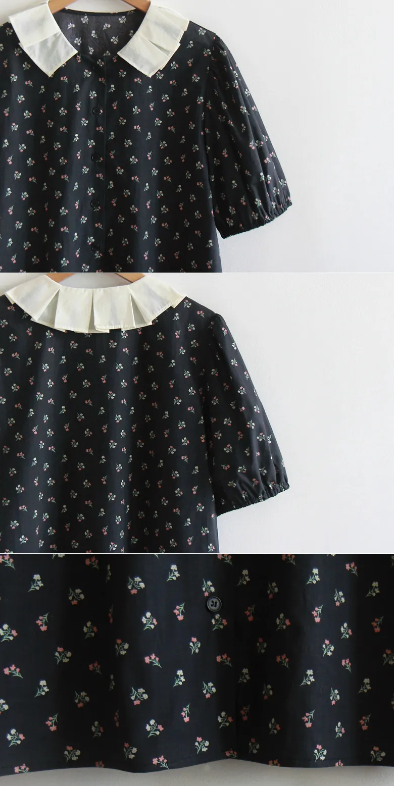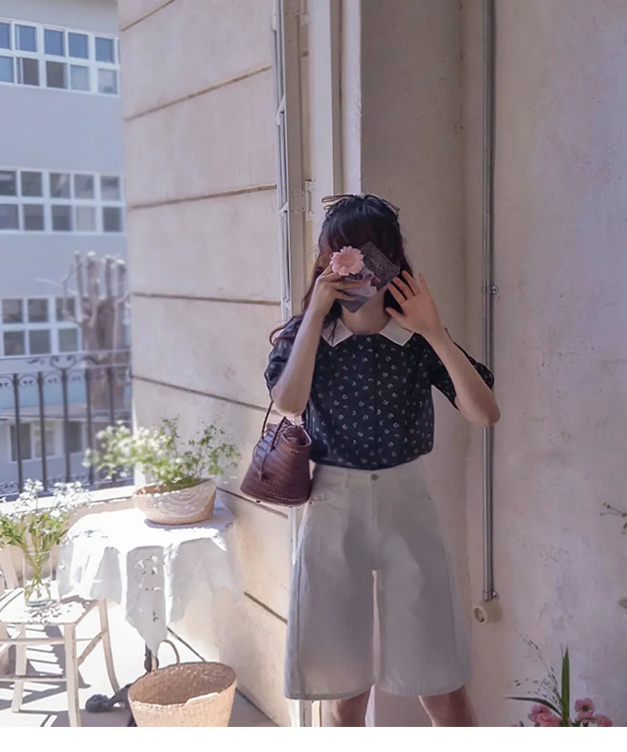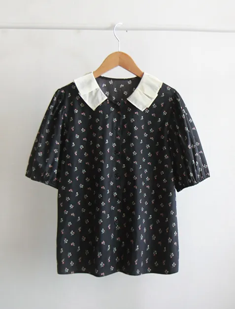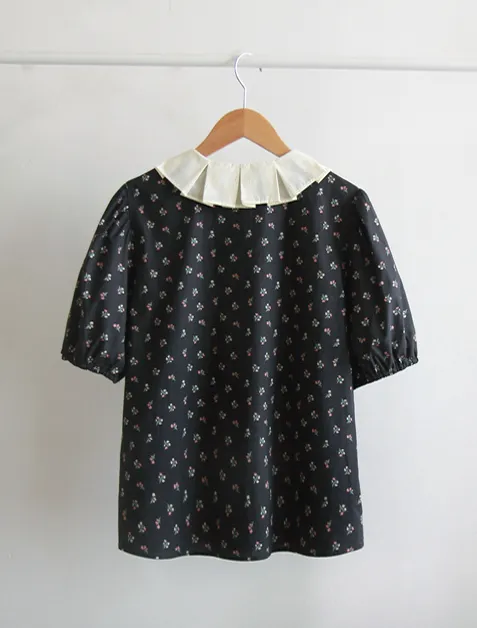 【以百褶領為焦點的排扣上衣】 【靈活的袖口設計增添了蓬鬆感,營造出可愛的氛圍】 【優雅花朵圖案,營造出活潑的氛圍】 【