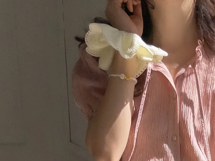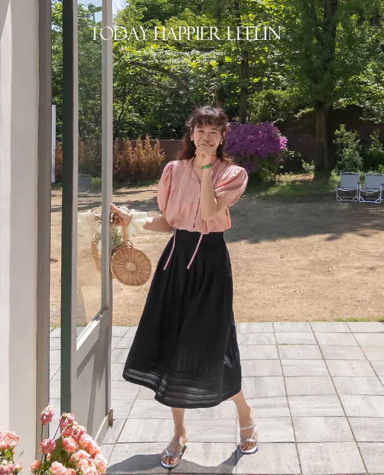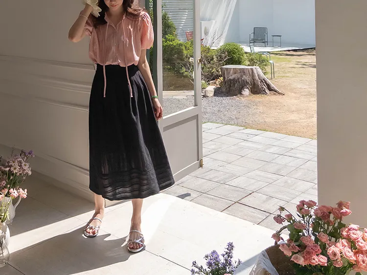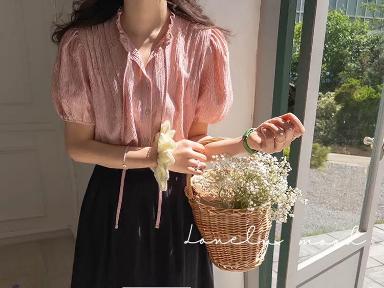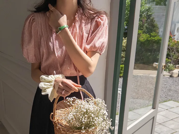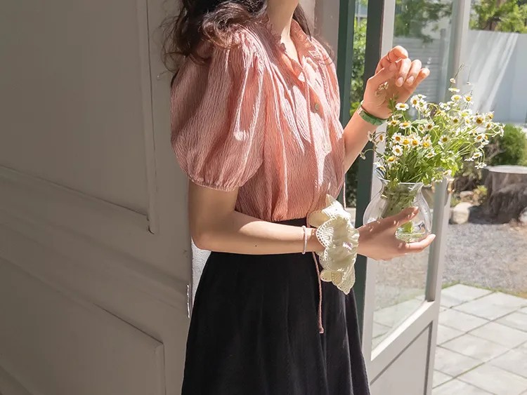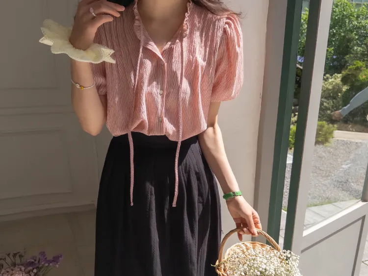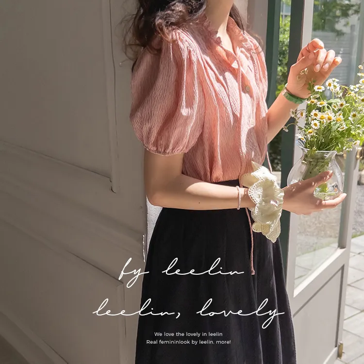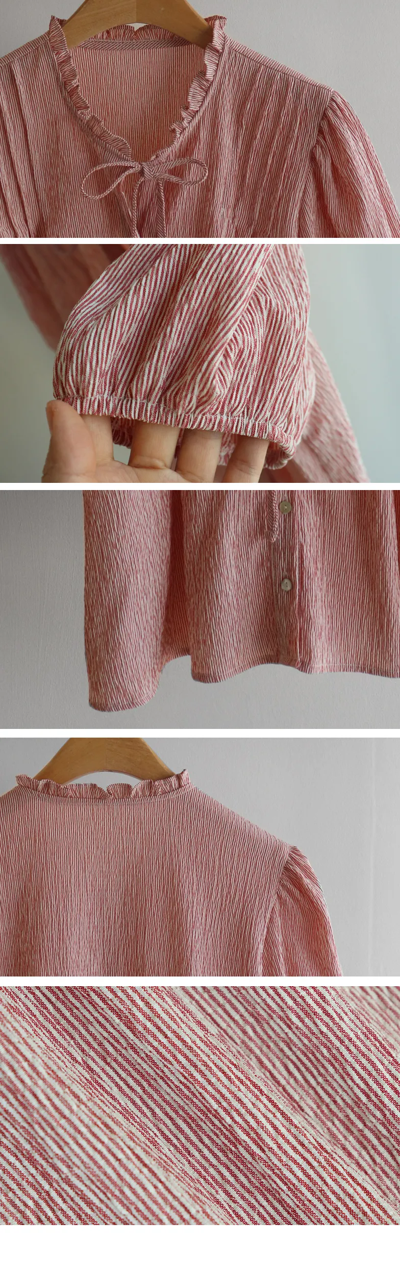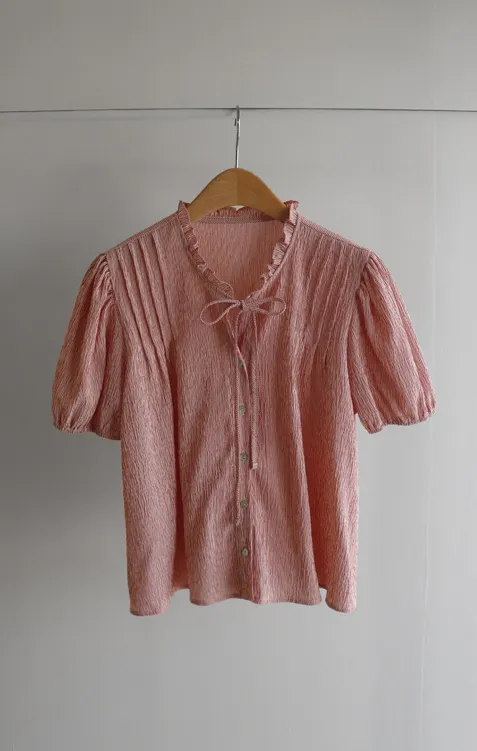 【斜紋布料,不用擔心起皺! 】 【飄逸清涼的夏日上衣♥】 【領口飾有荷葉邊和綁帶設計】 【袖口飾帶】