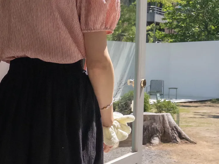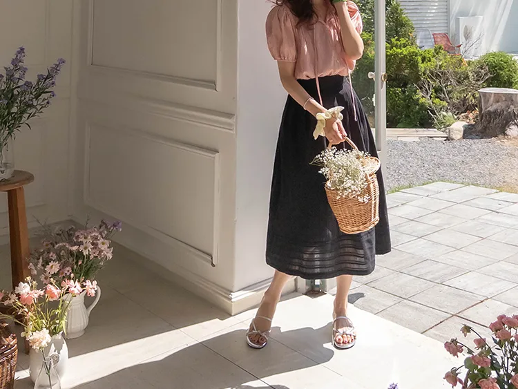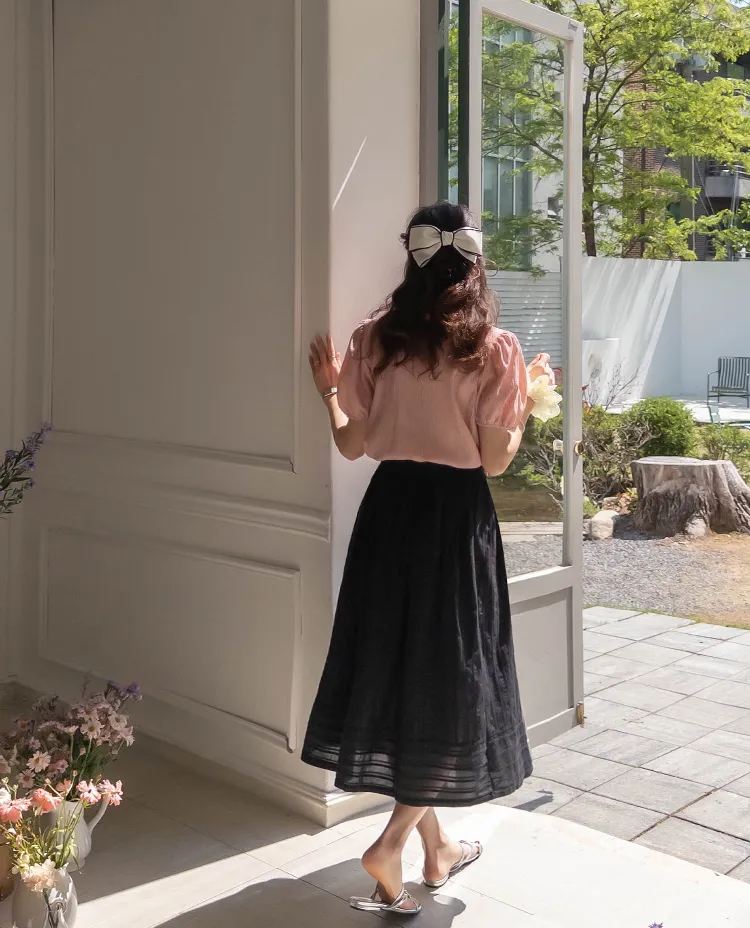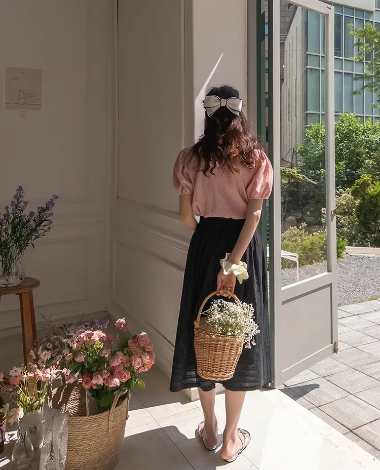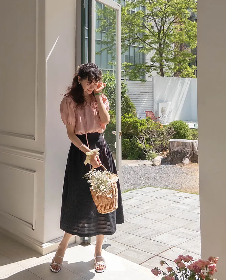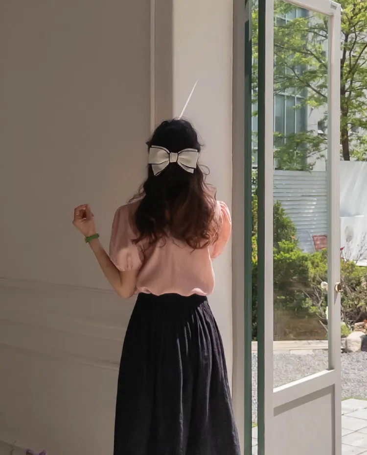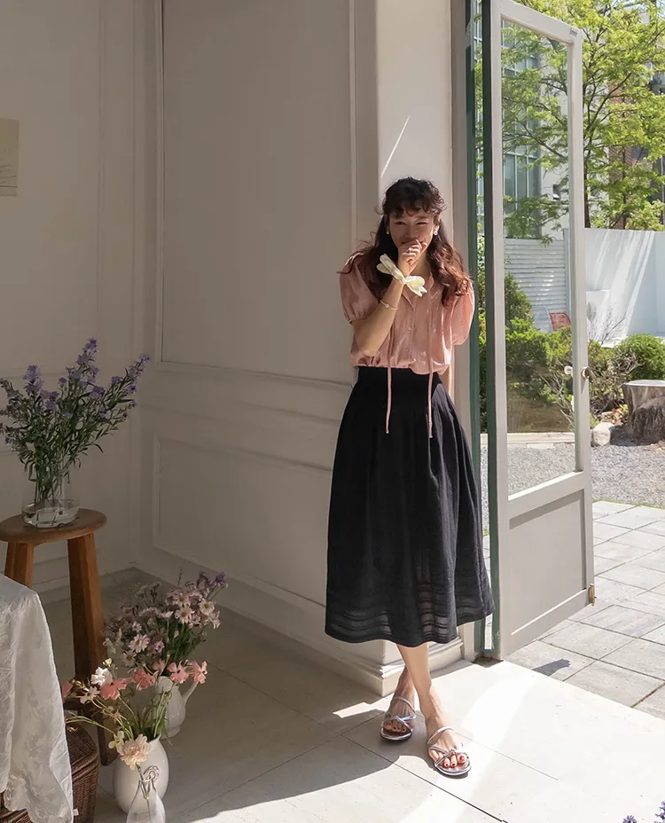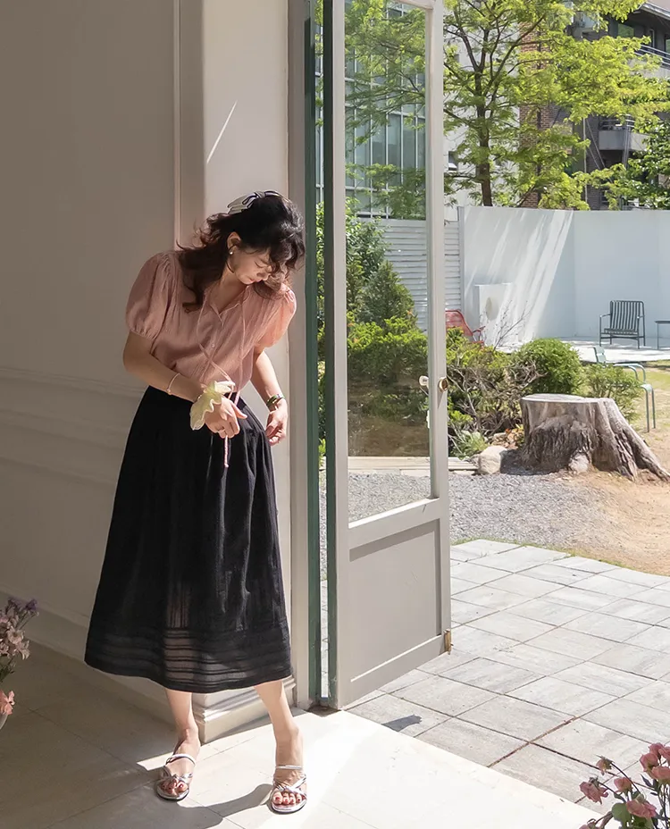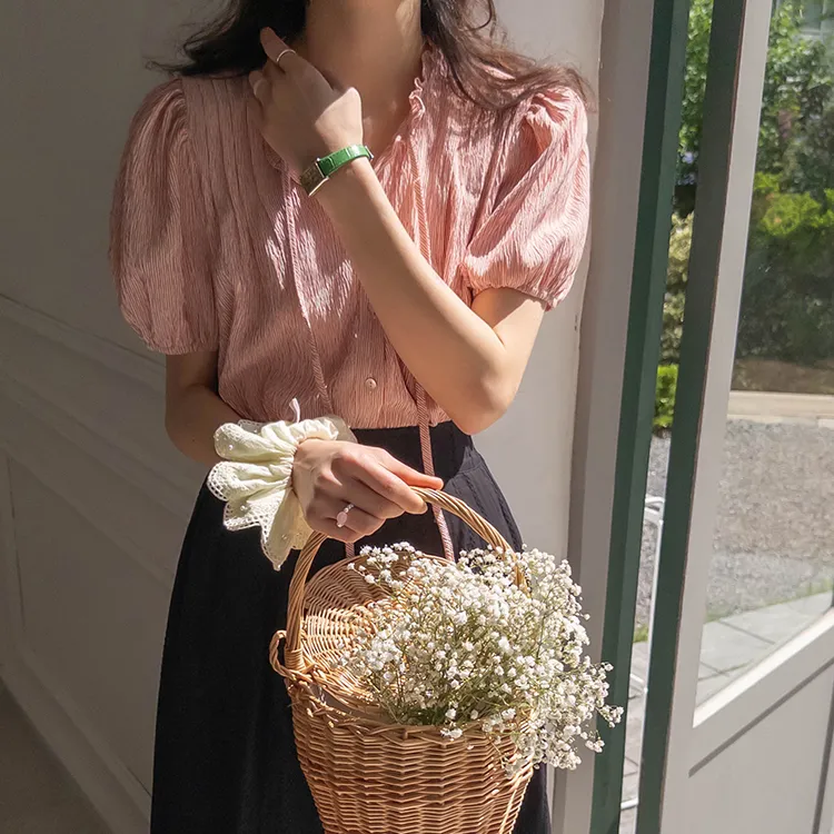 【斜紋布料,不用擔心起皺! 】 【飄逸清涼的夏日上衣♥】 【領口飾有荷葉邊和綁帶設計】 【袖口飾帶】