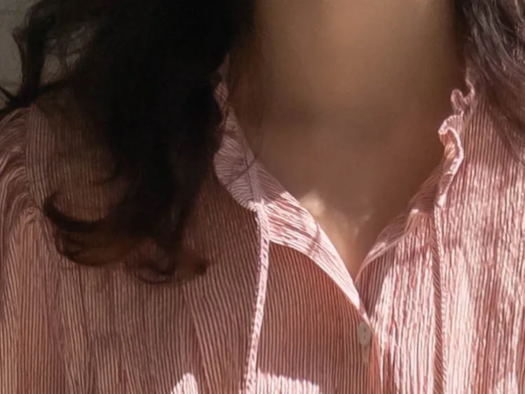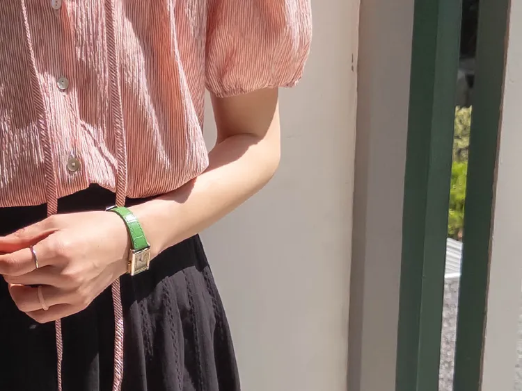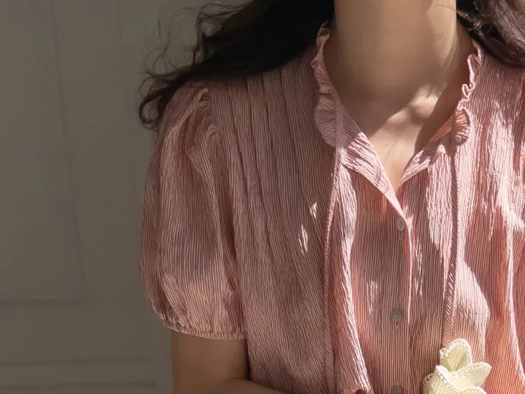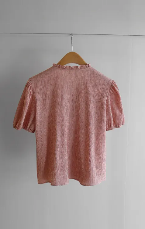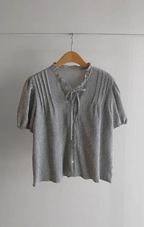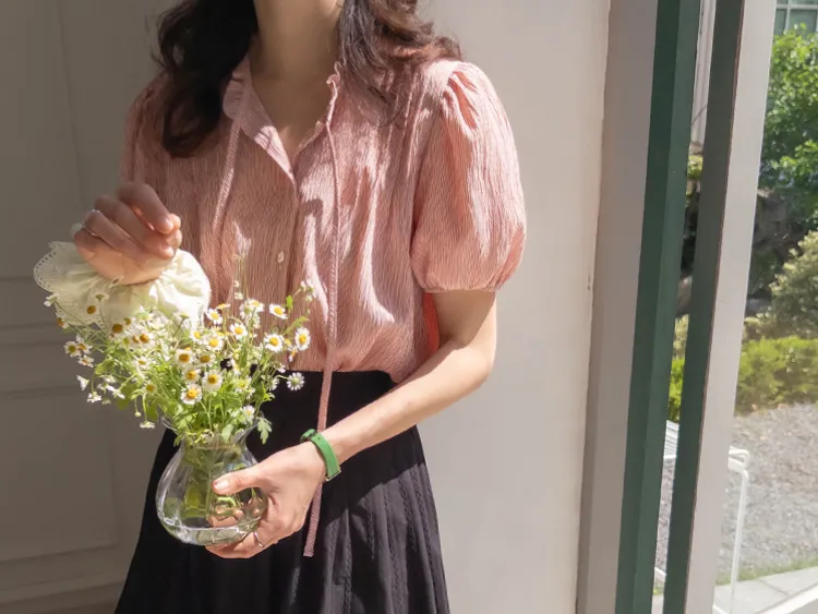 漂亮摺邊領口綁帶設計肩線針摺線條排扣上衣