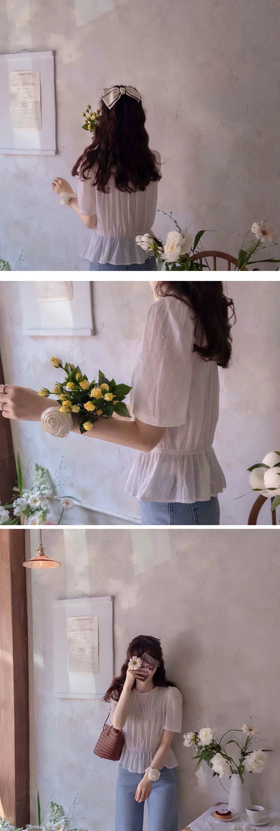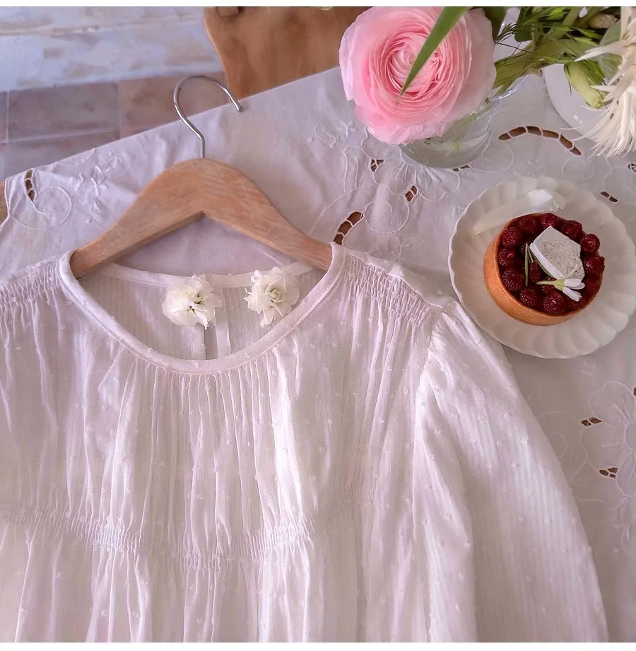 【雪花圖案的細膩純色線條夏季面料,展現季節感】【皺摺設計,打造可愛貼身的穿著體驗】【可愛又優雅的氛圍】【從現在到夏天都適合的華麗幹練造型】【作為奢華的皺折雪花上衣】