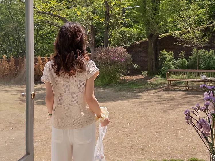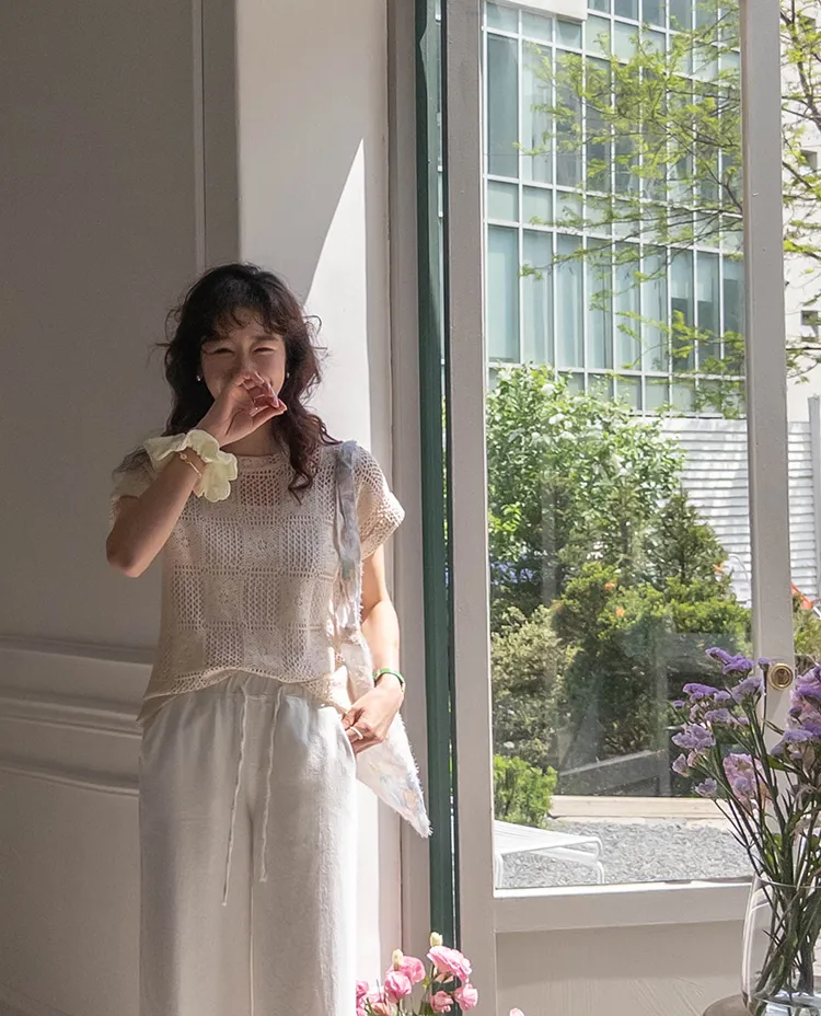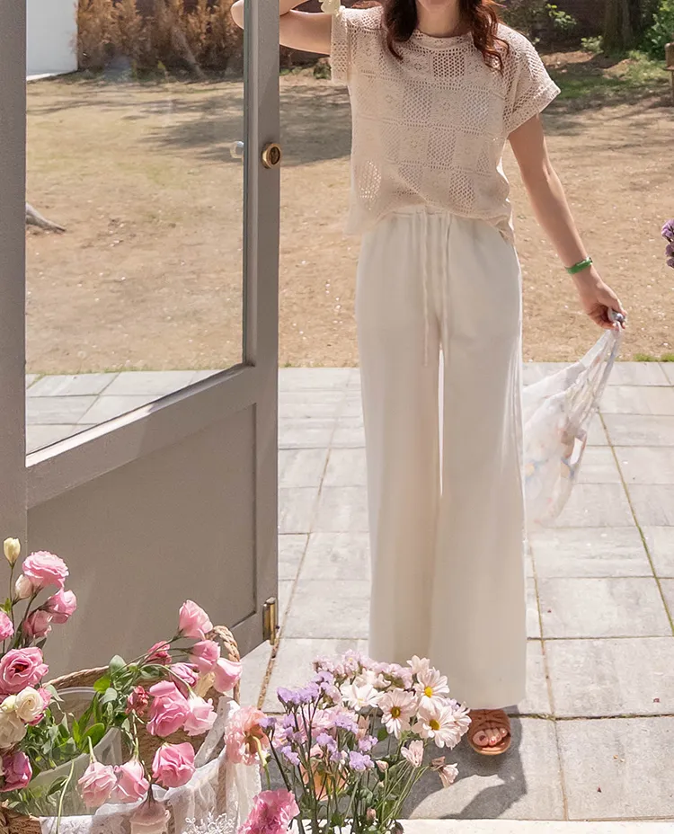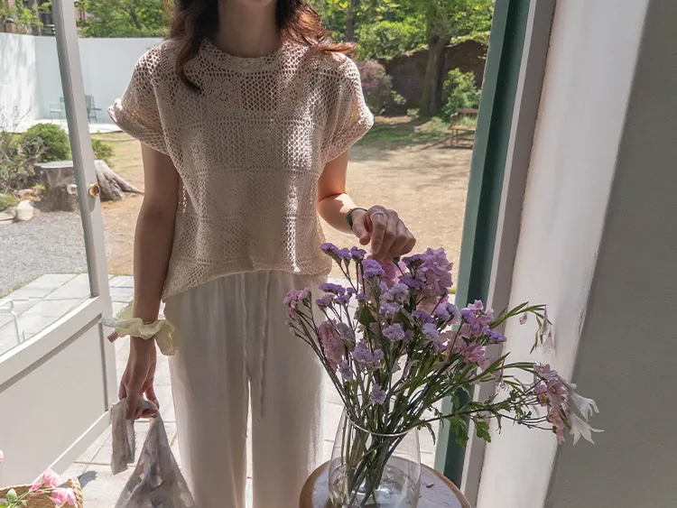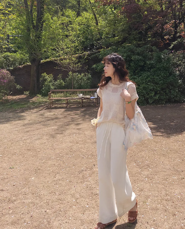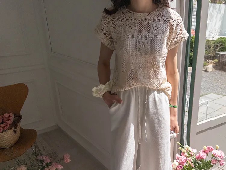 漂亮鏤空花朵夏日針織短袖上衣
