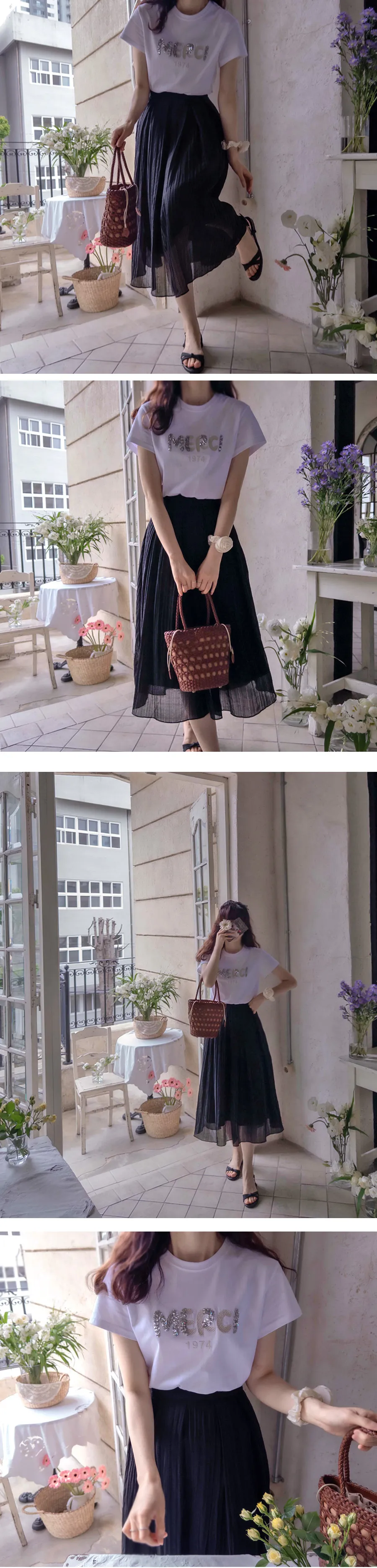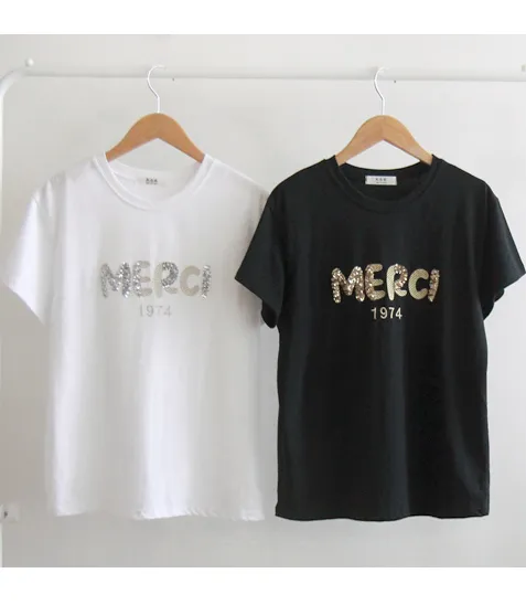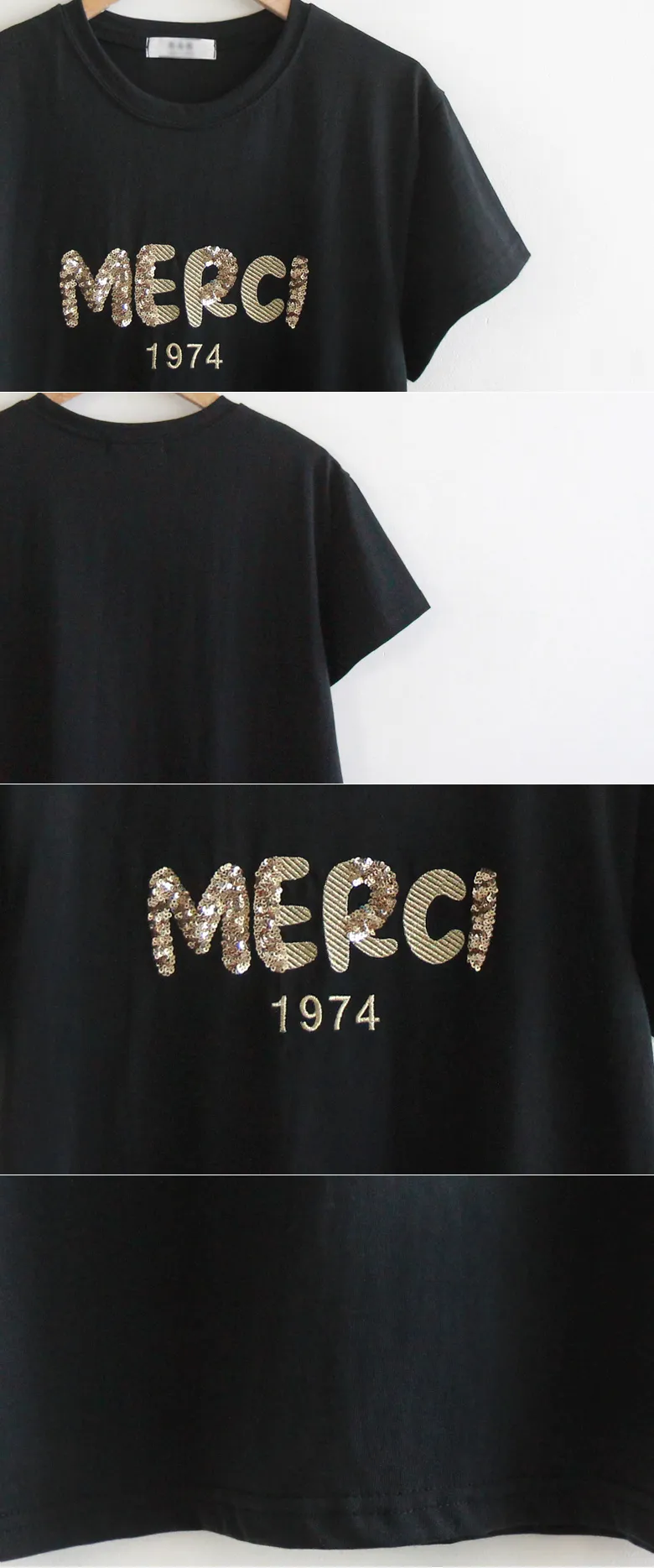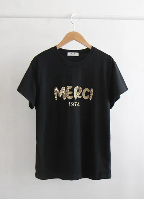 漂亮刺繡字母串珠亮片圓領短袖上衣