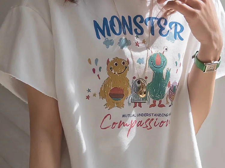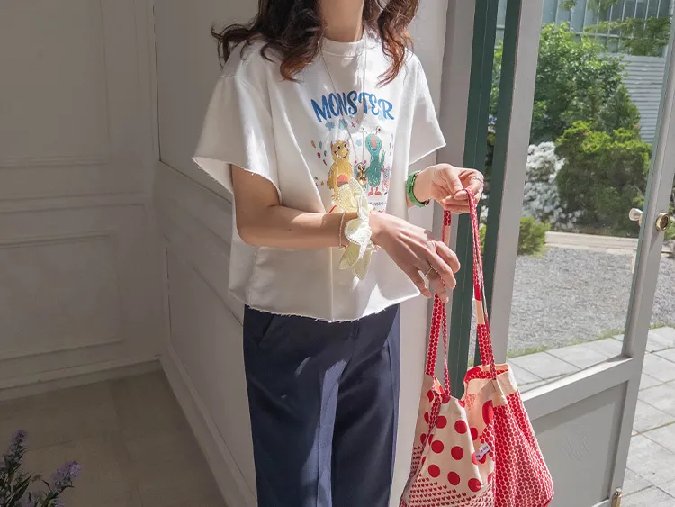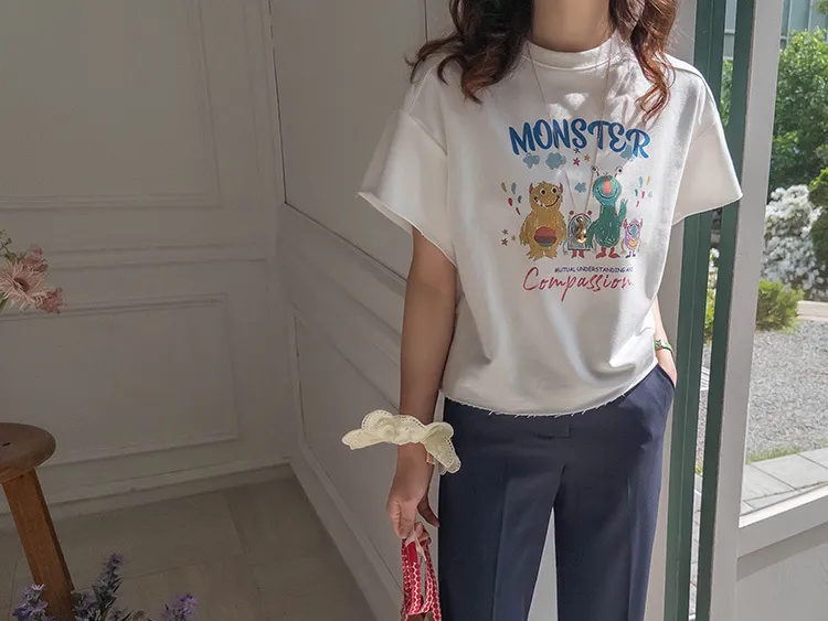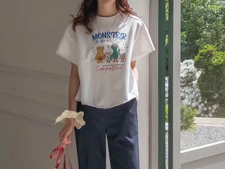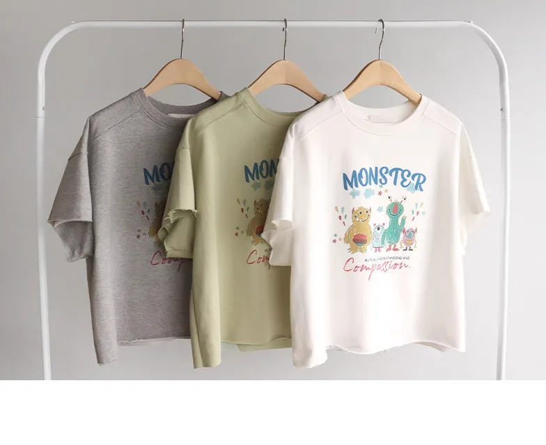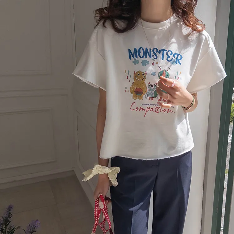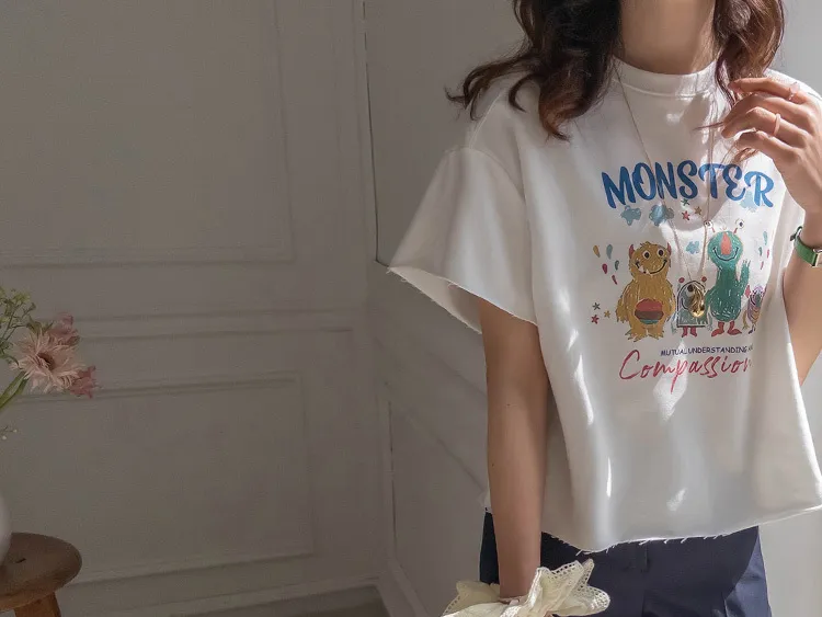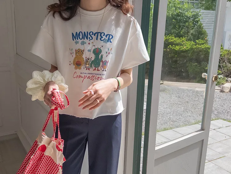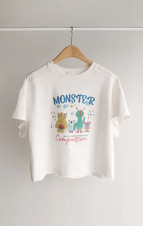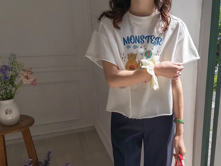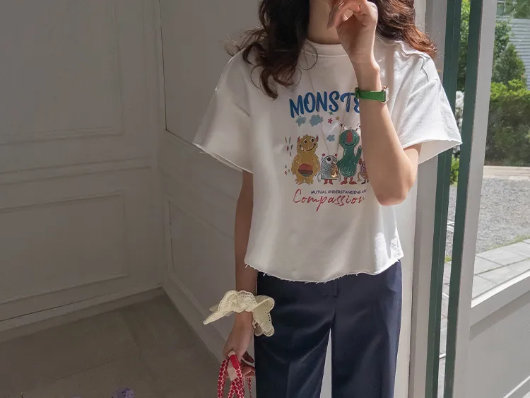 可愛小怪物印花下擺自然剪裁半短款穿搭上衣