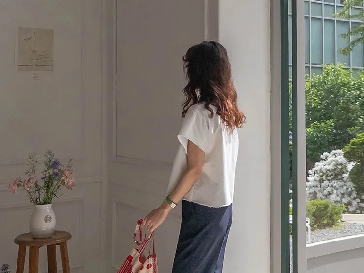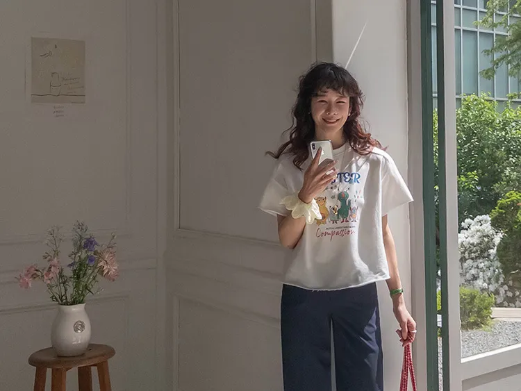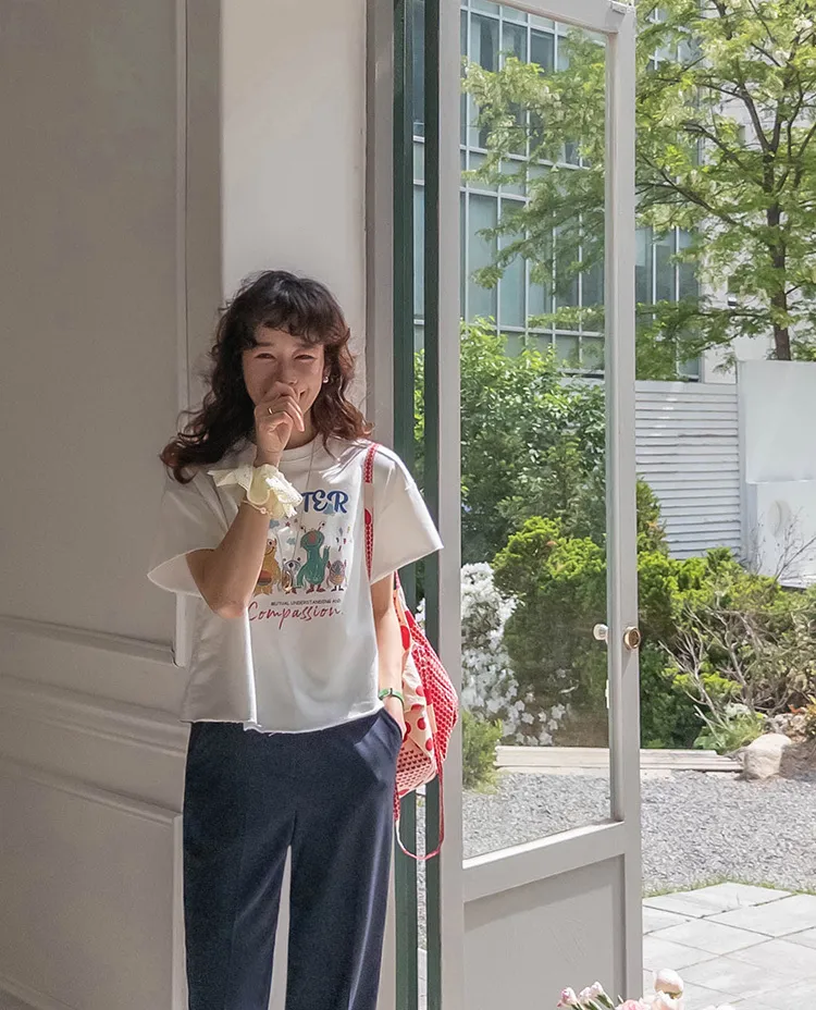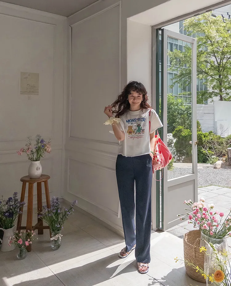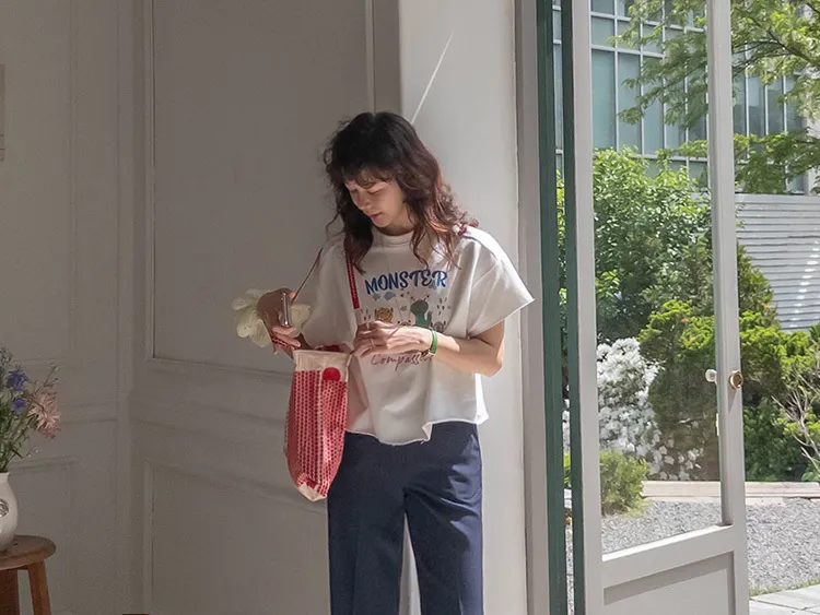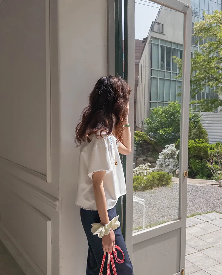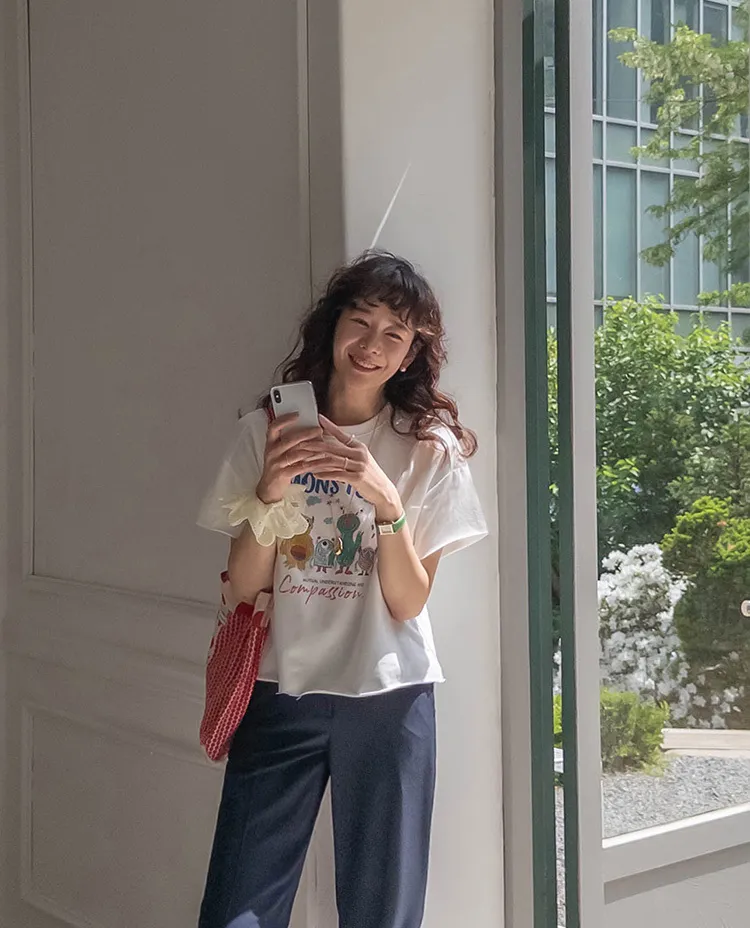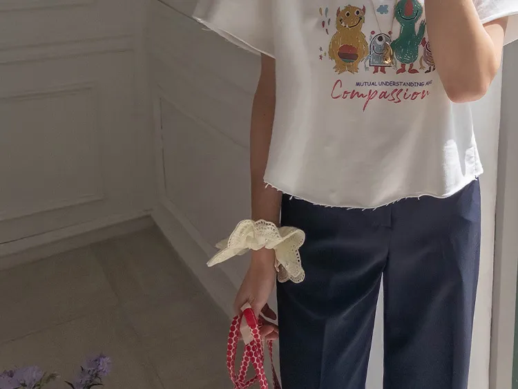可愛小怪物印花下擺自然剪裁半短款穿搭上衣
