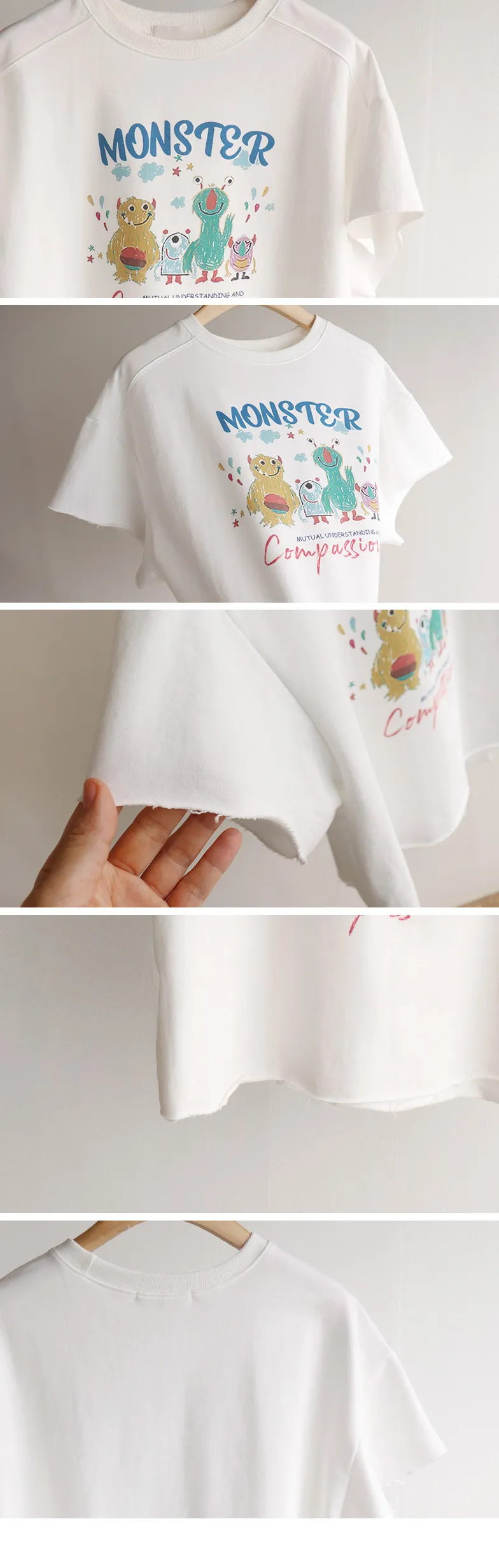 【獨特的自然剪裁下擺短袖穿搭上衣】【可愛的怪獸印花點♥】【毛圈布,穿著舒適~】【半短款,營造活潑氛圍~】