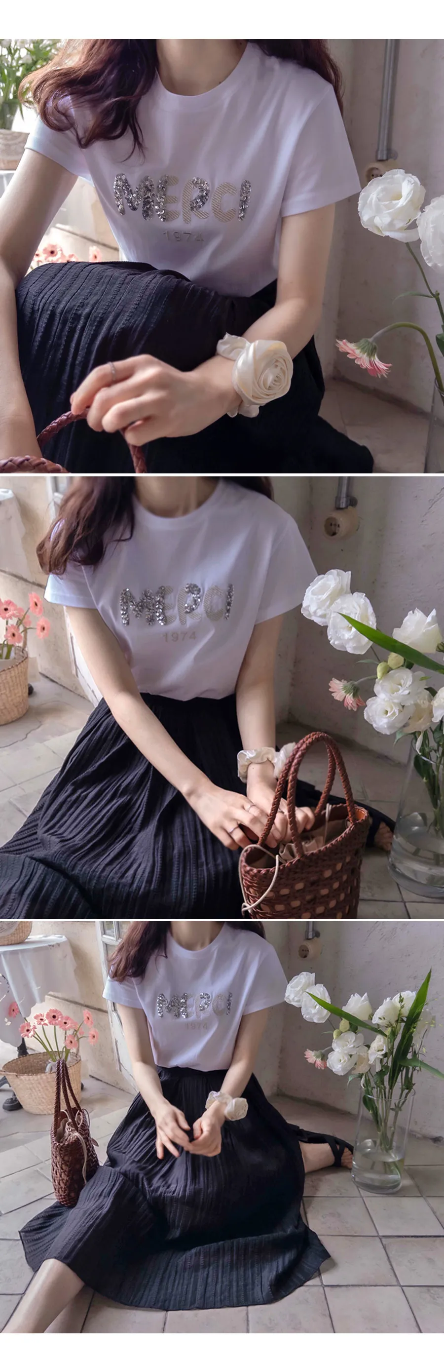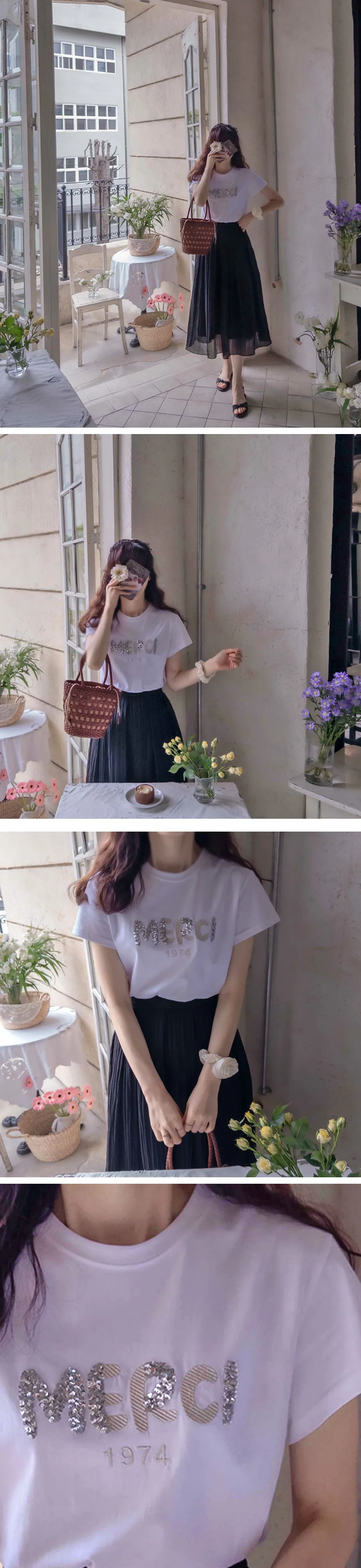 漂亮刺繡字母串珠亮片圓領短袖上衣