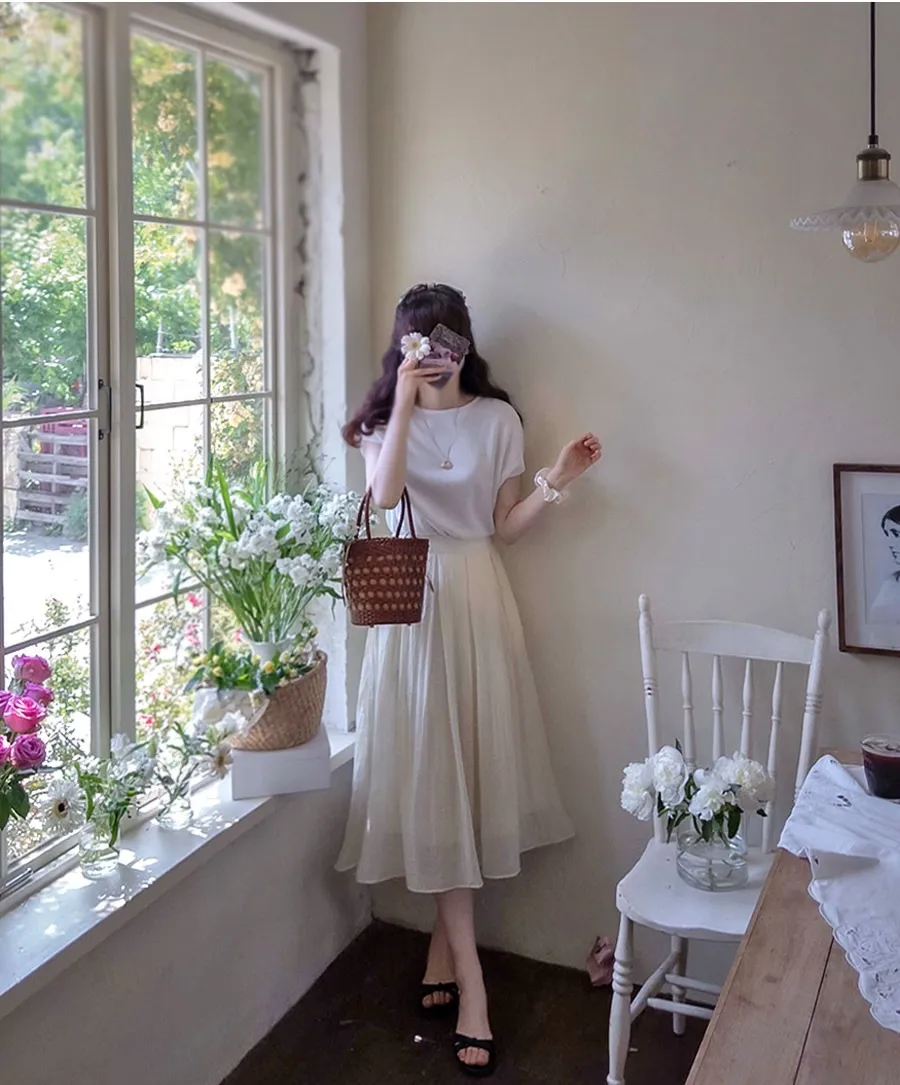 可愛鏤空花朵刺繡袖子設計圓領穿搭上衣