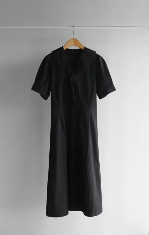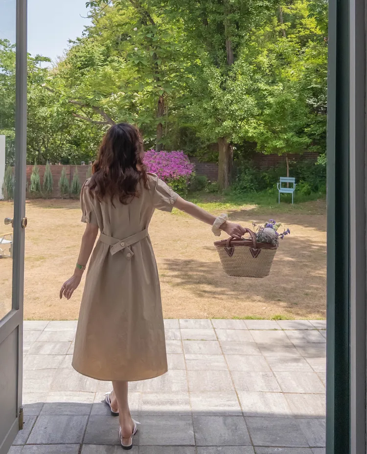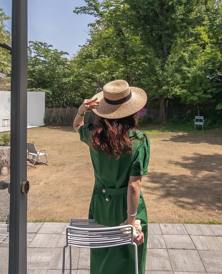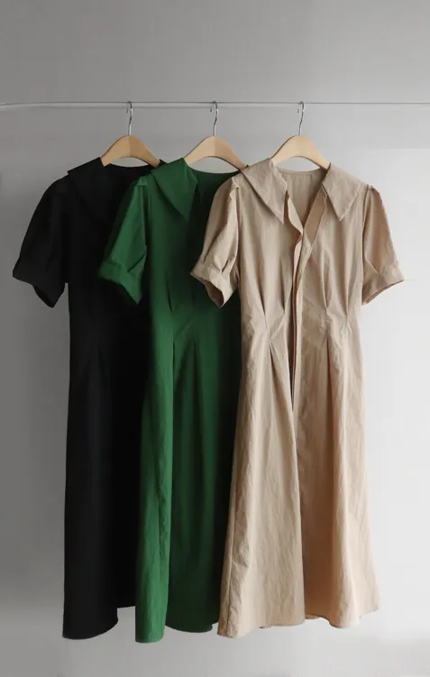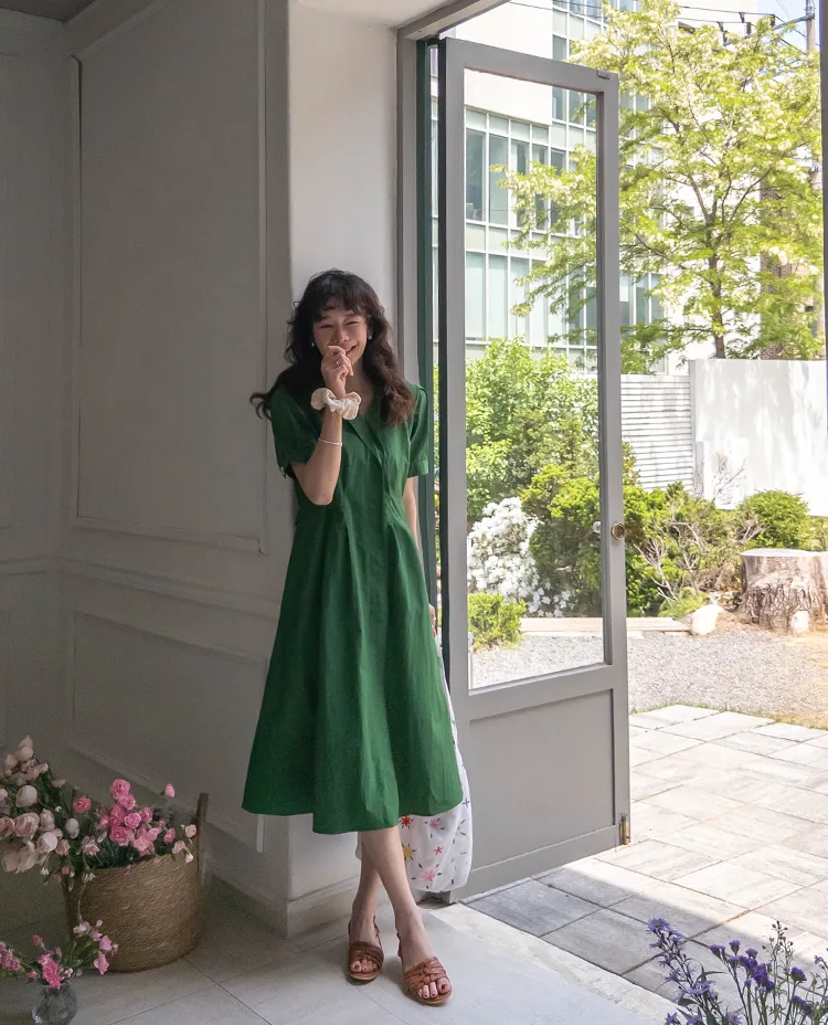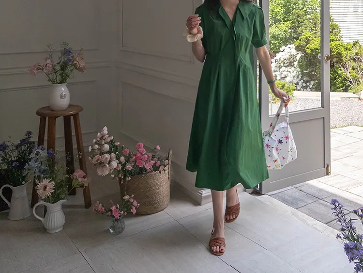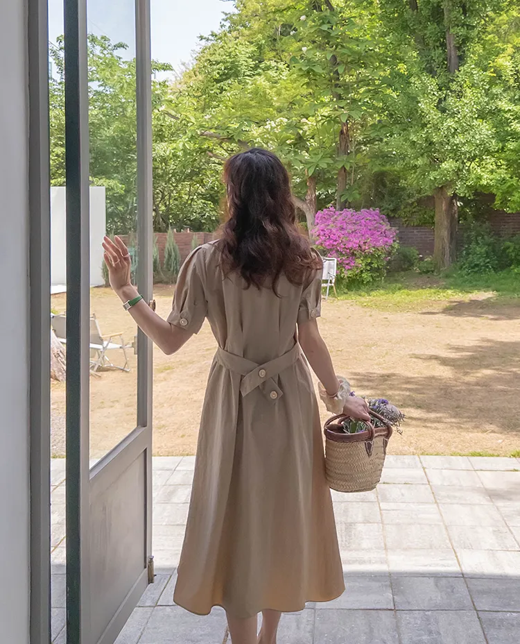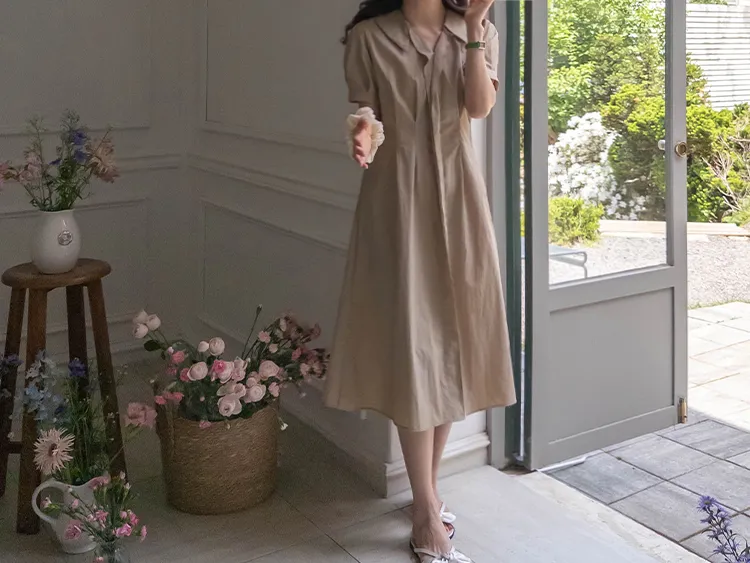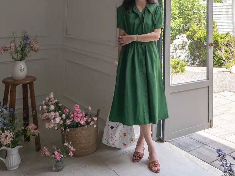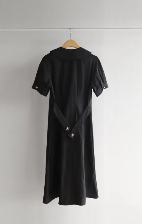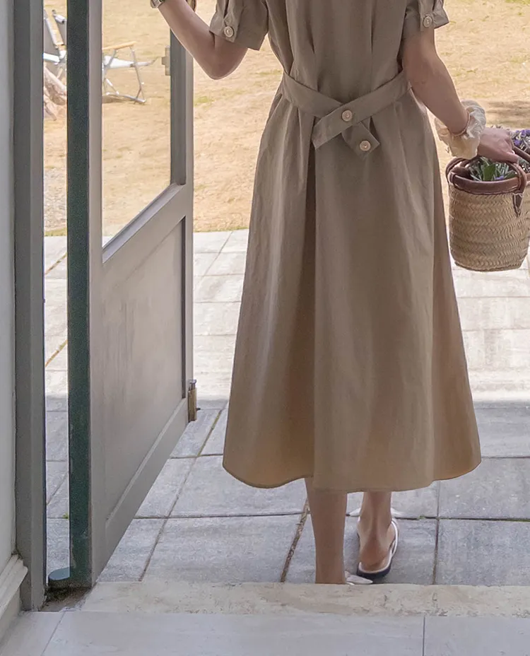雅緻領口摺邊針摺腰線修身點綴後腰扣連身裙