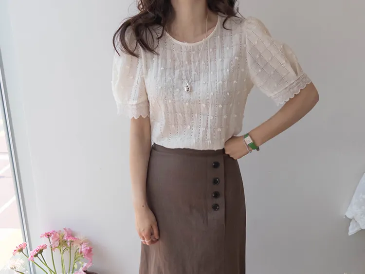 優雅袖末蕾絲立體點點泡泡袖穿搭上衣