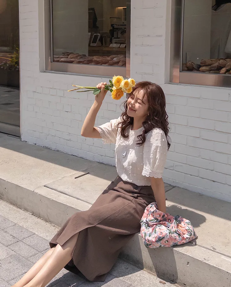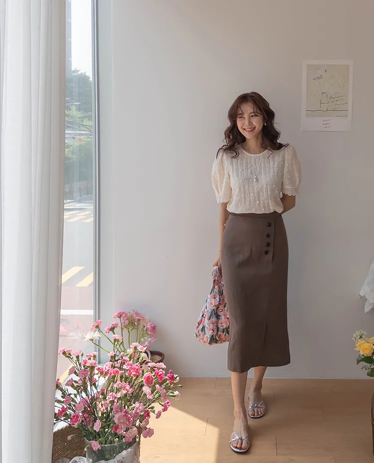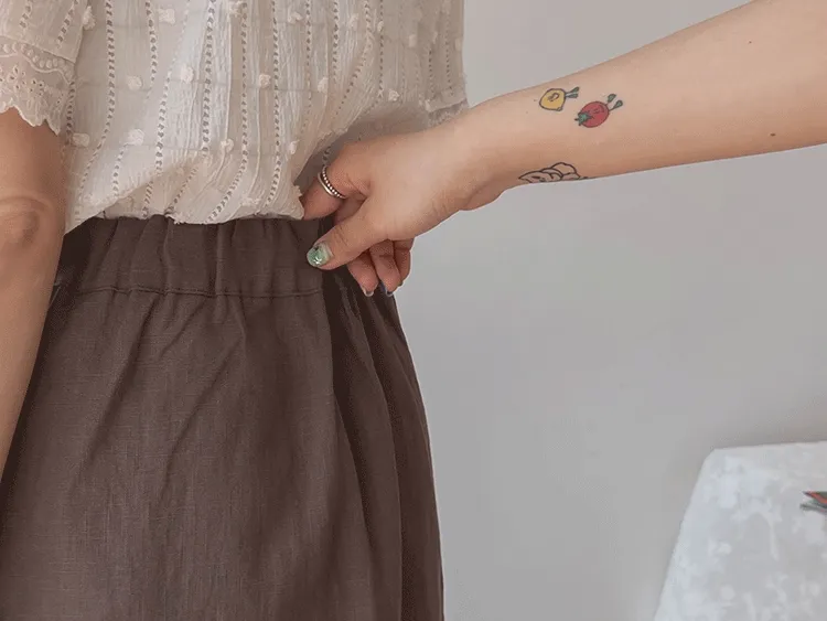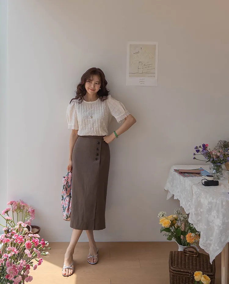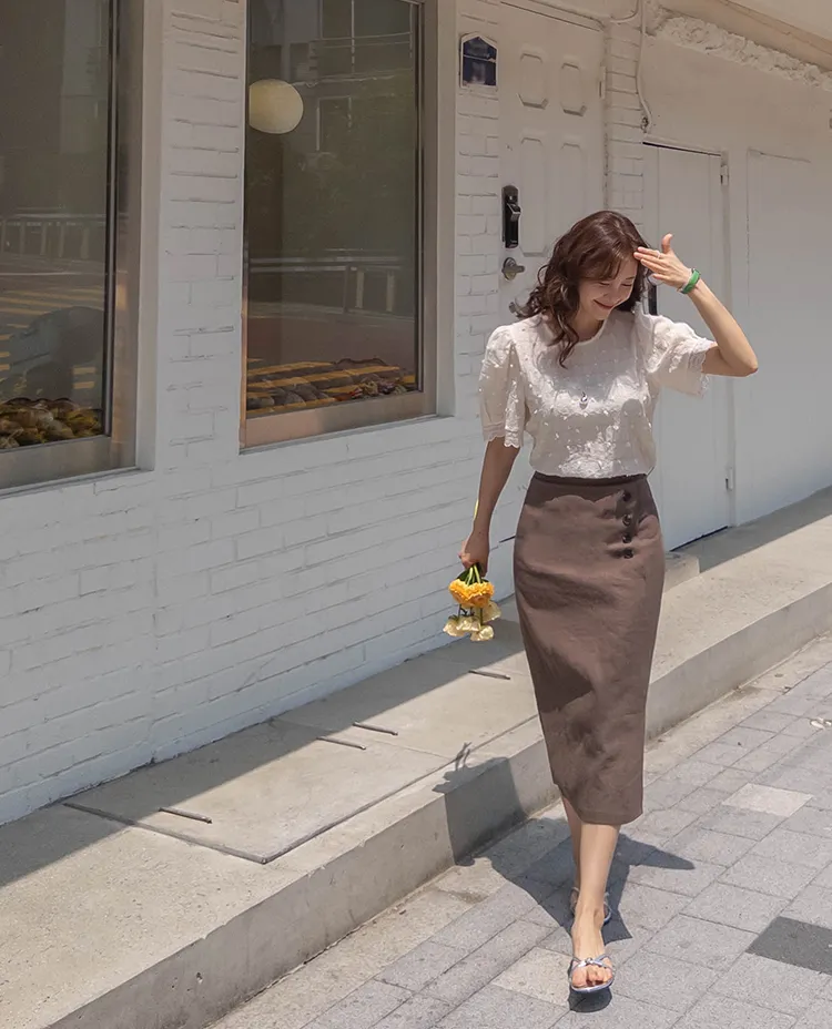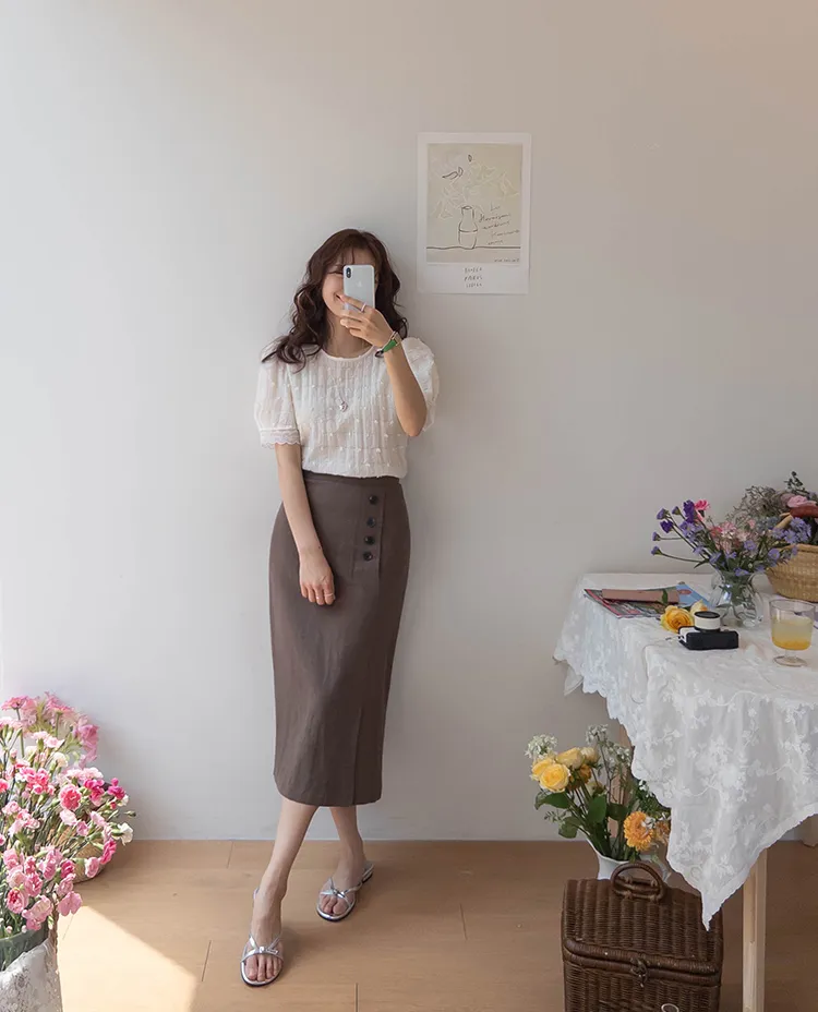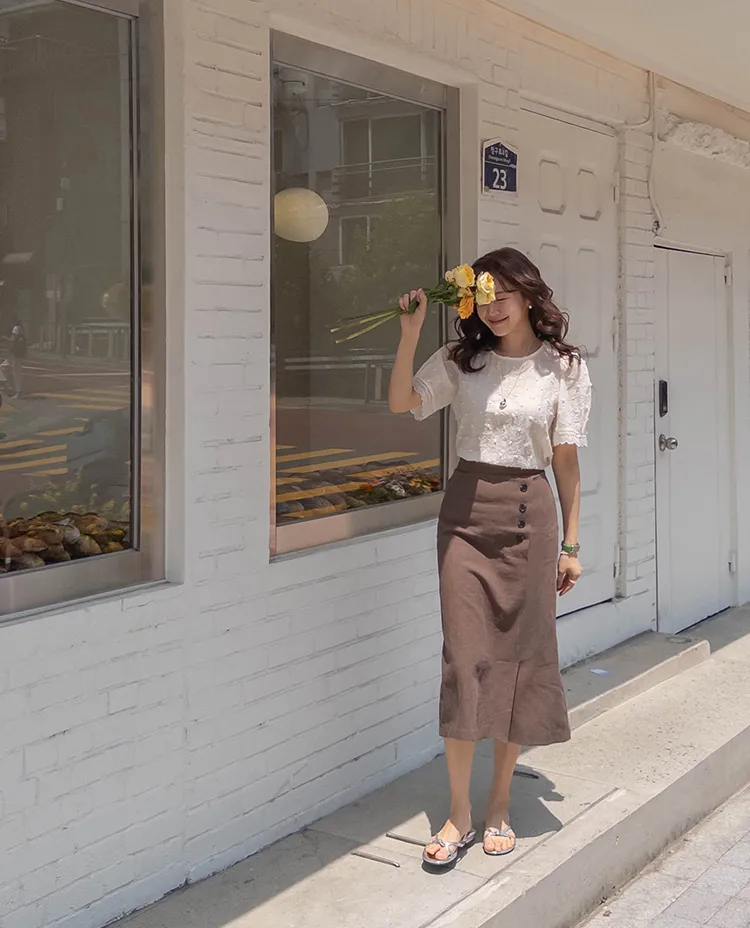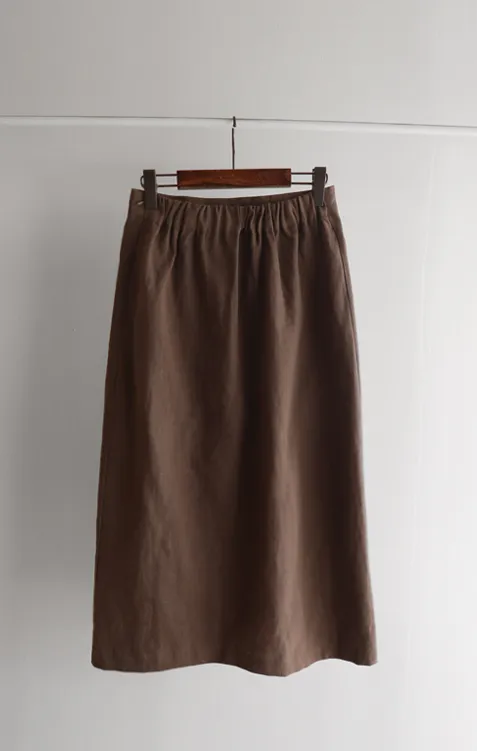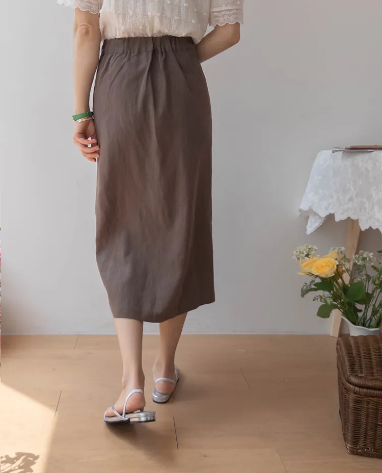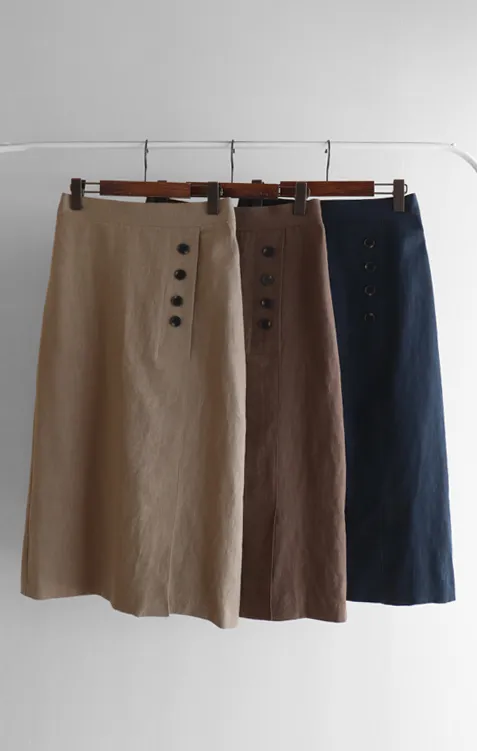【100%亞麻日常夏日裙子! 】 【微微傘擺狀的半A字裙】 【紐扣設計,不會顯得沉悶的裙子~】 【側開衩&舒適的後腰帶】