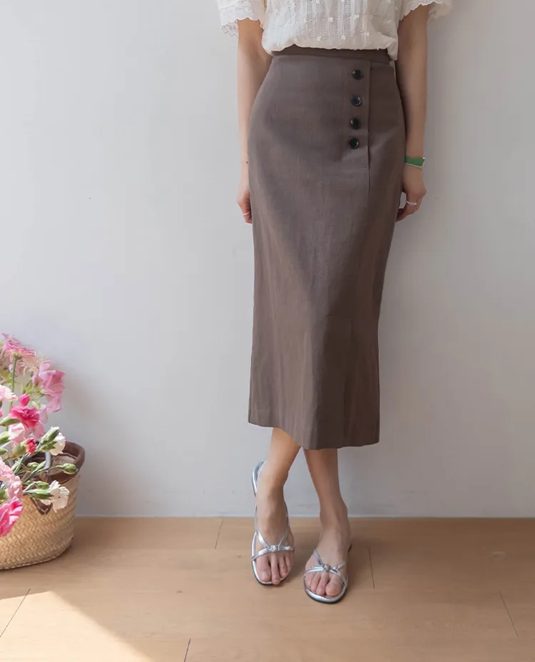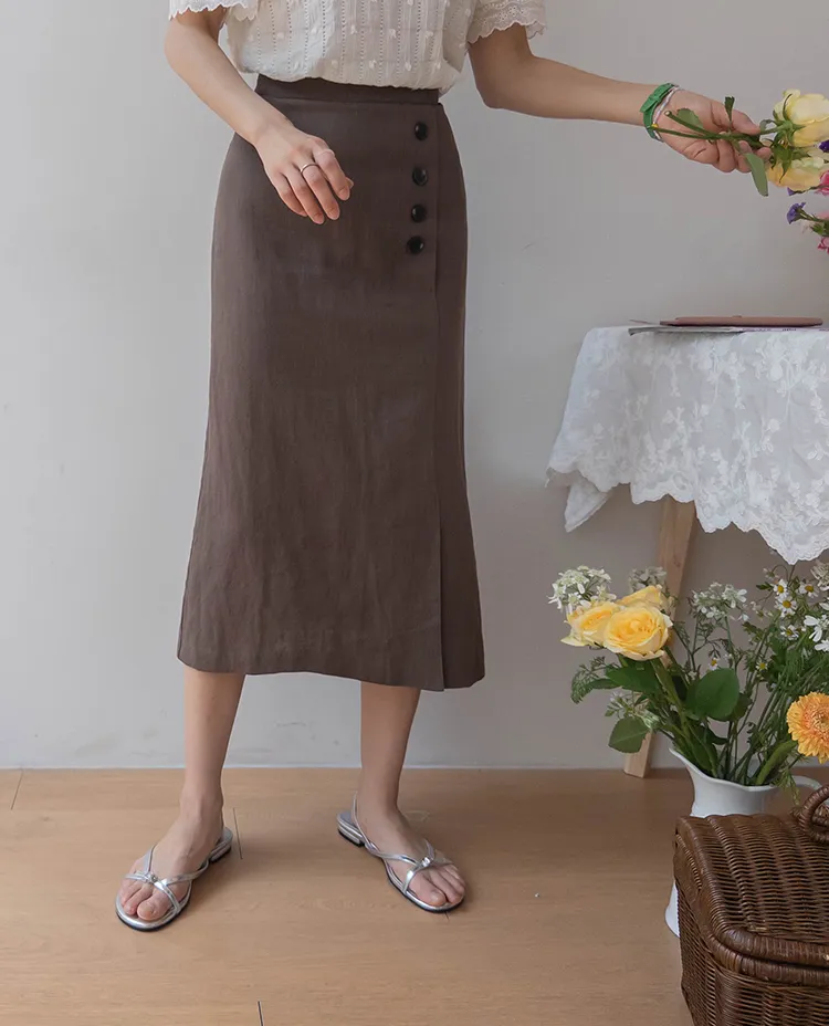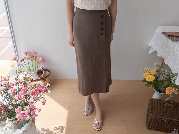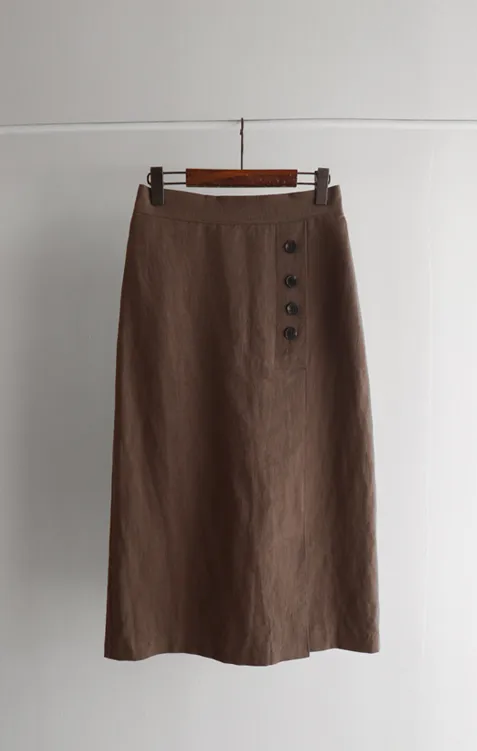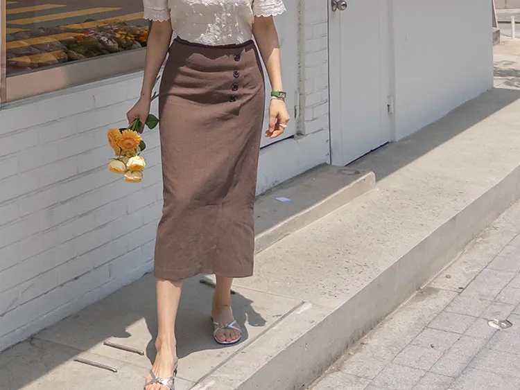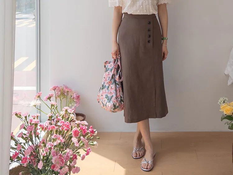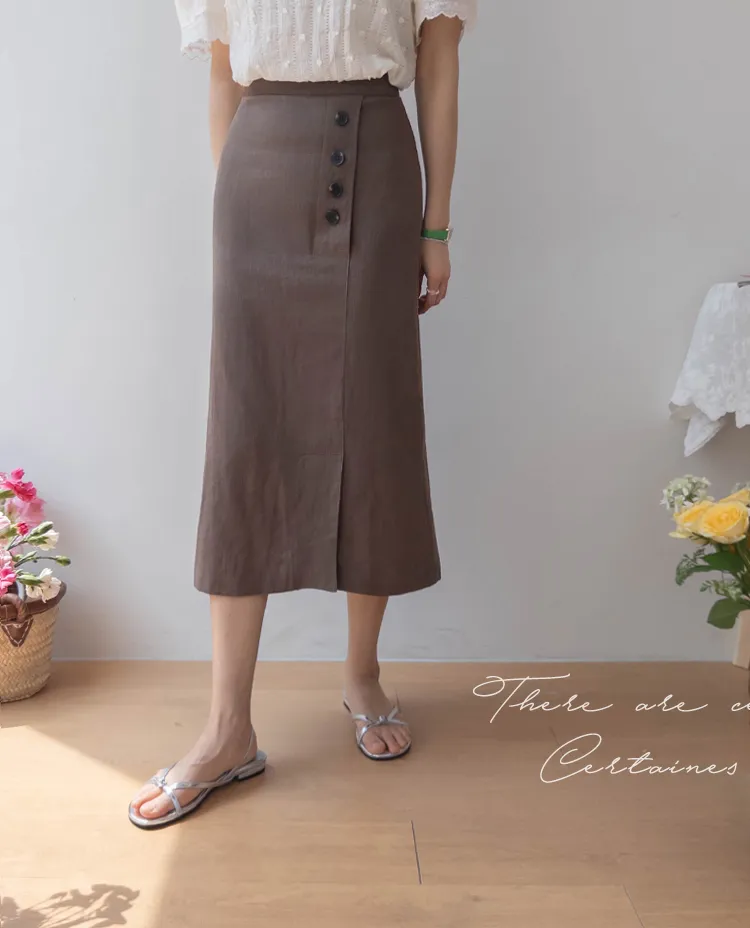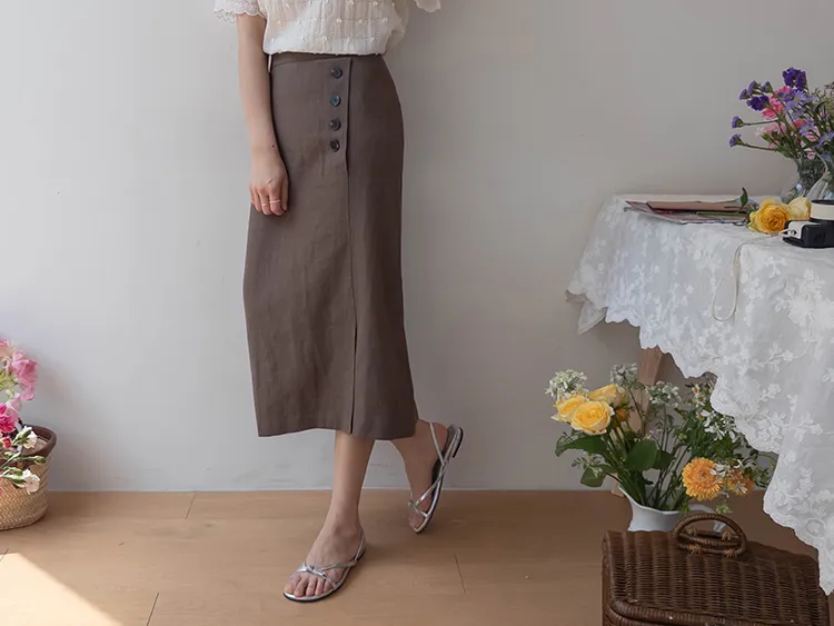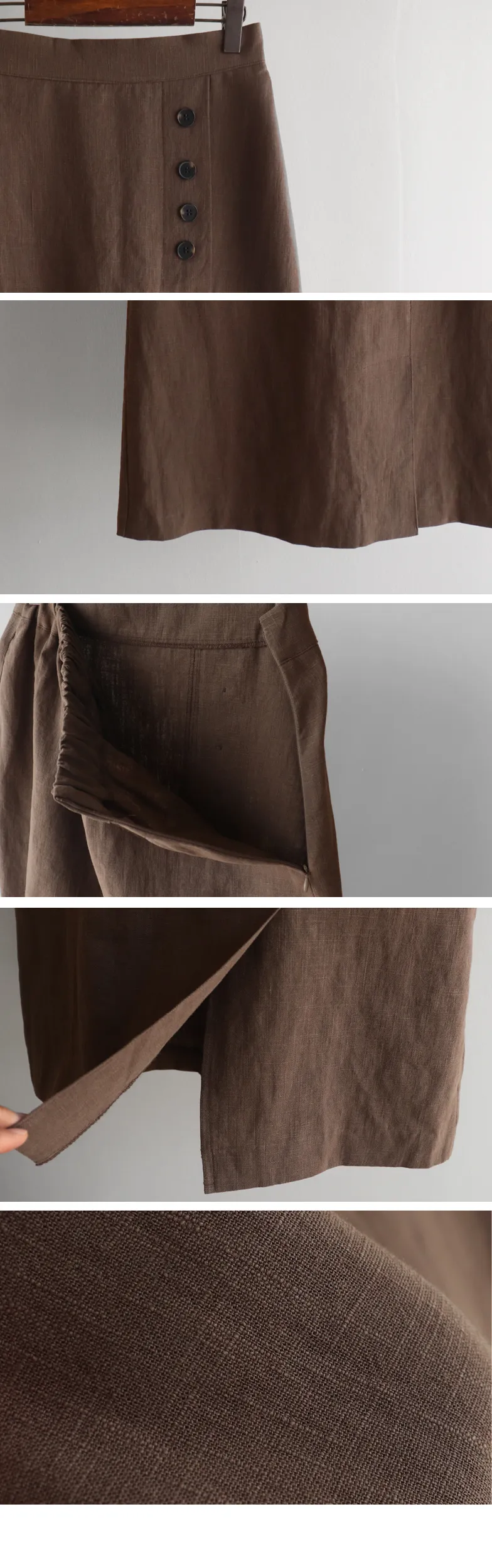 夏日優雅半A字剪裁鈕扣裝飾亞麻中長裙