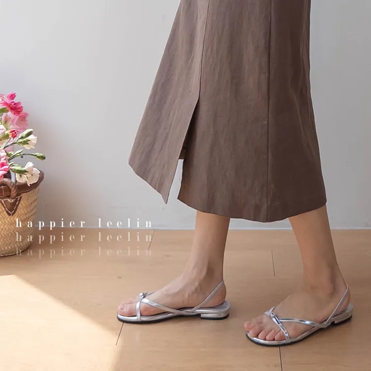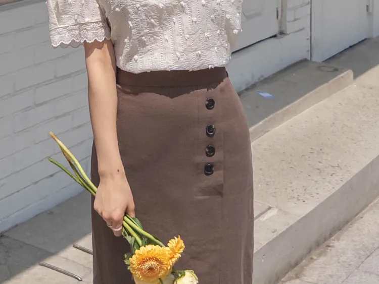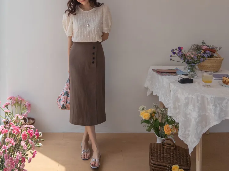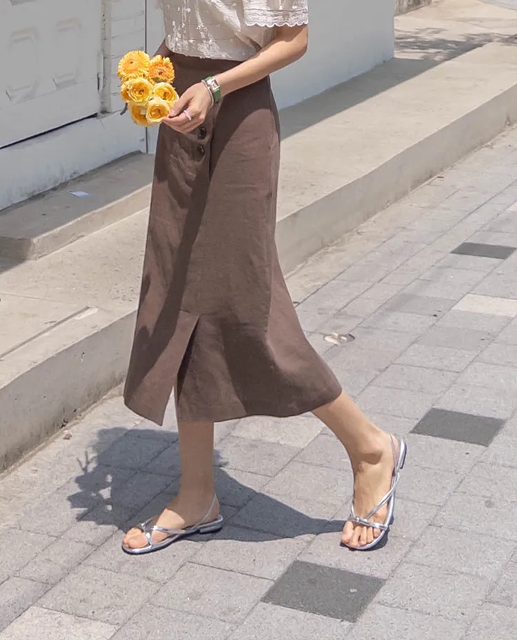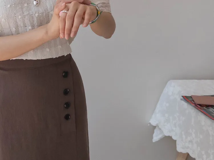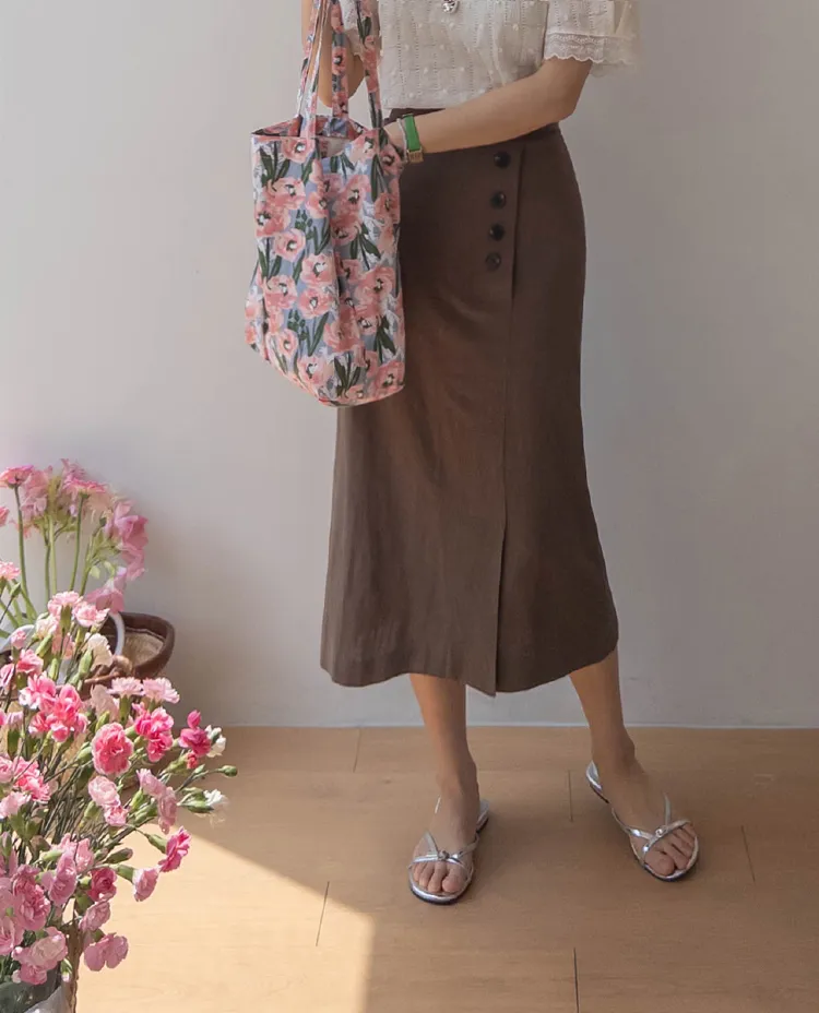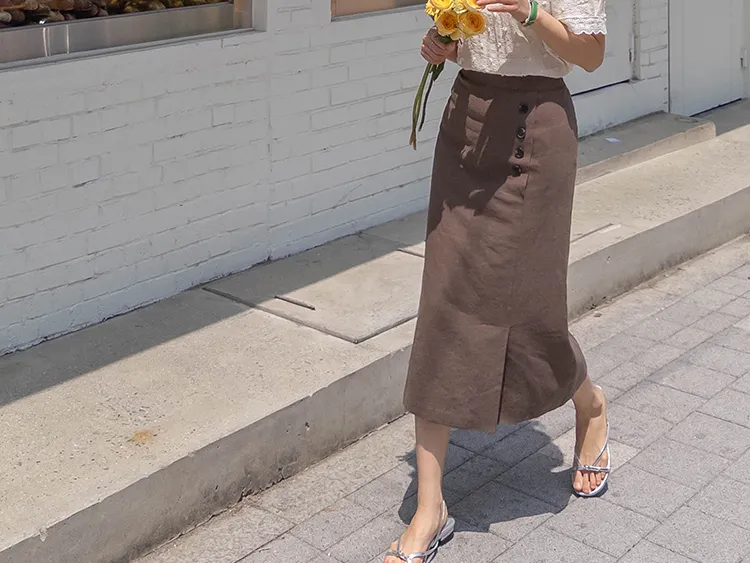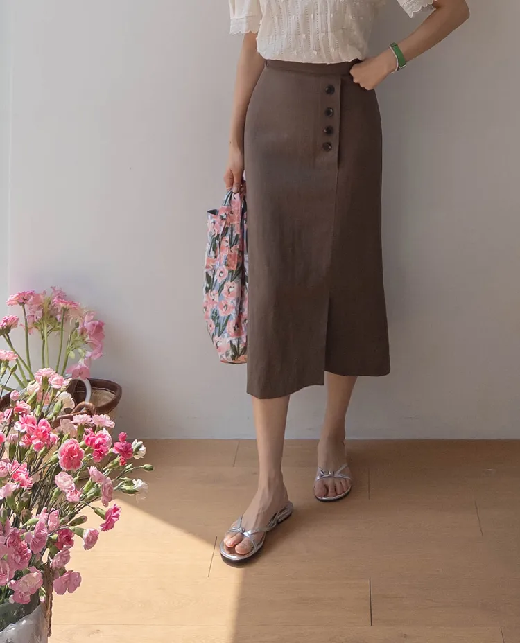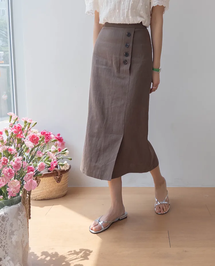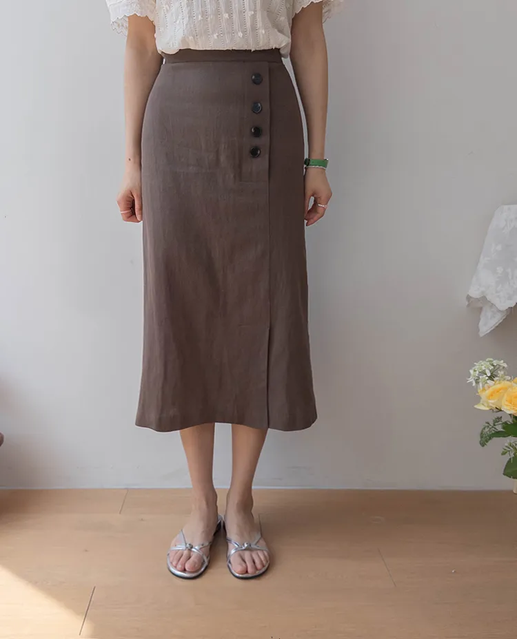夏日優雅半A字剪裁鈕扣裝飾亞麻中長裙
