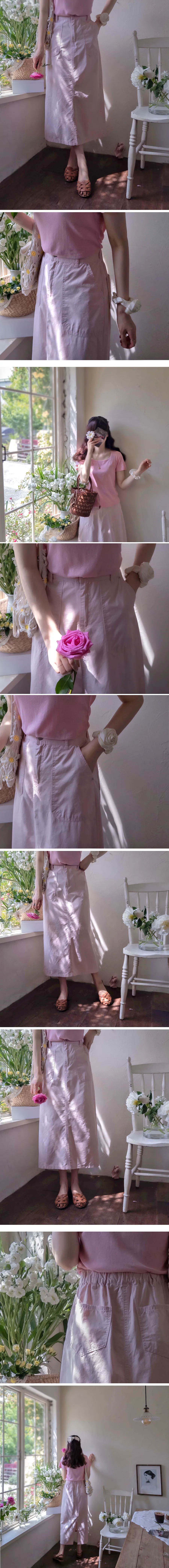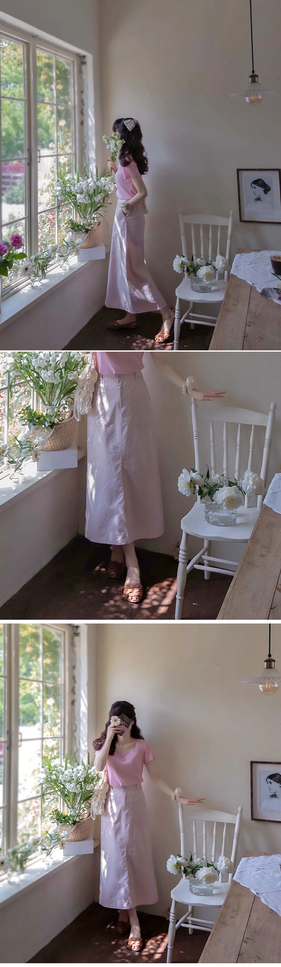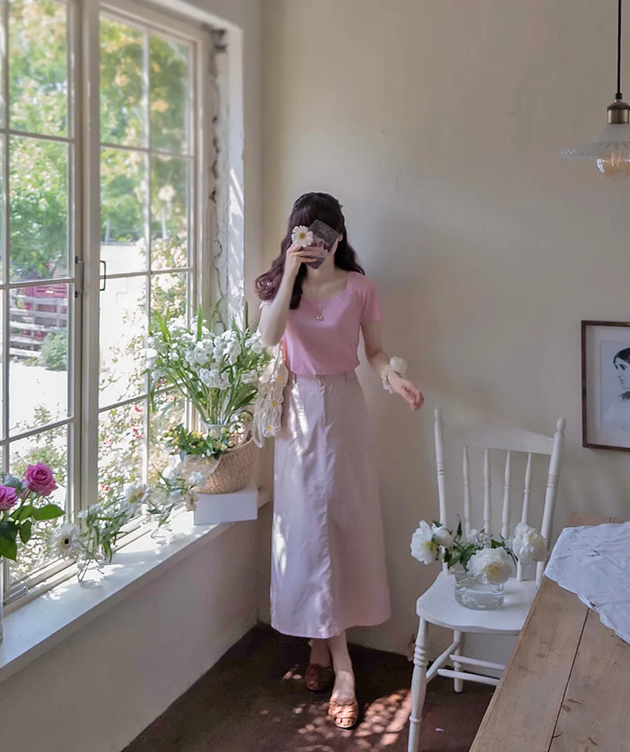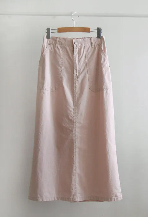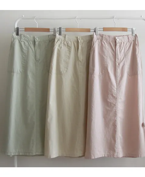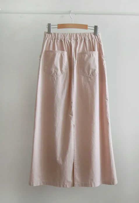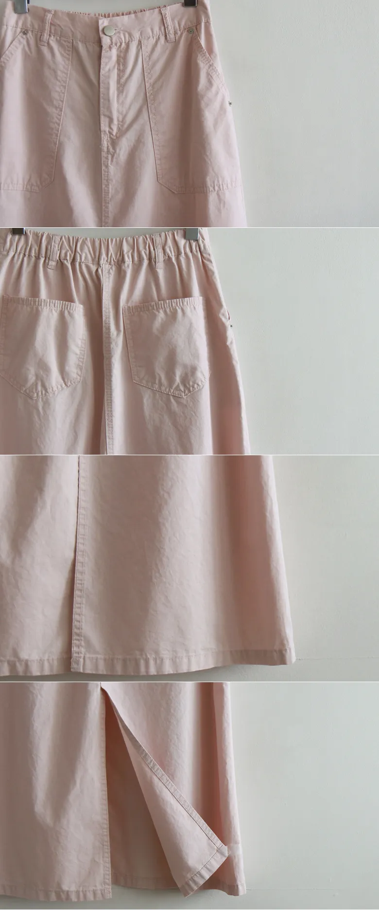 夏日柔和色調口袋設計後開衩A字剪裁中長裙